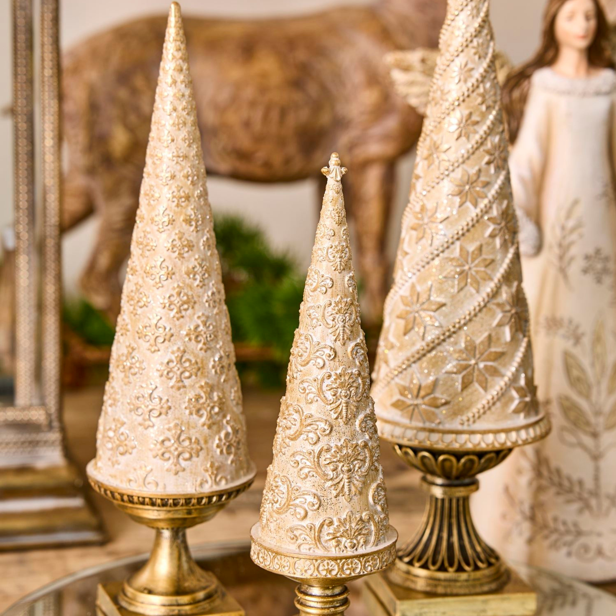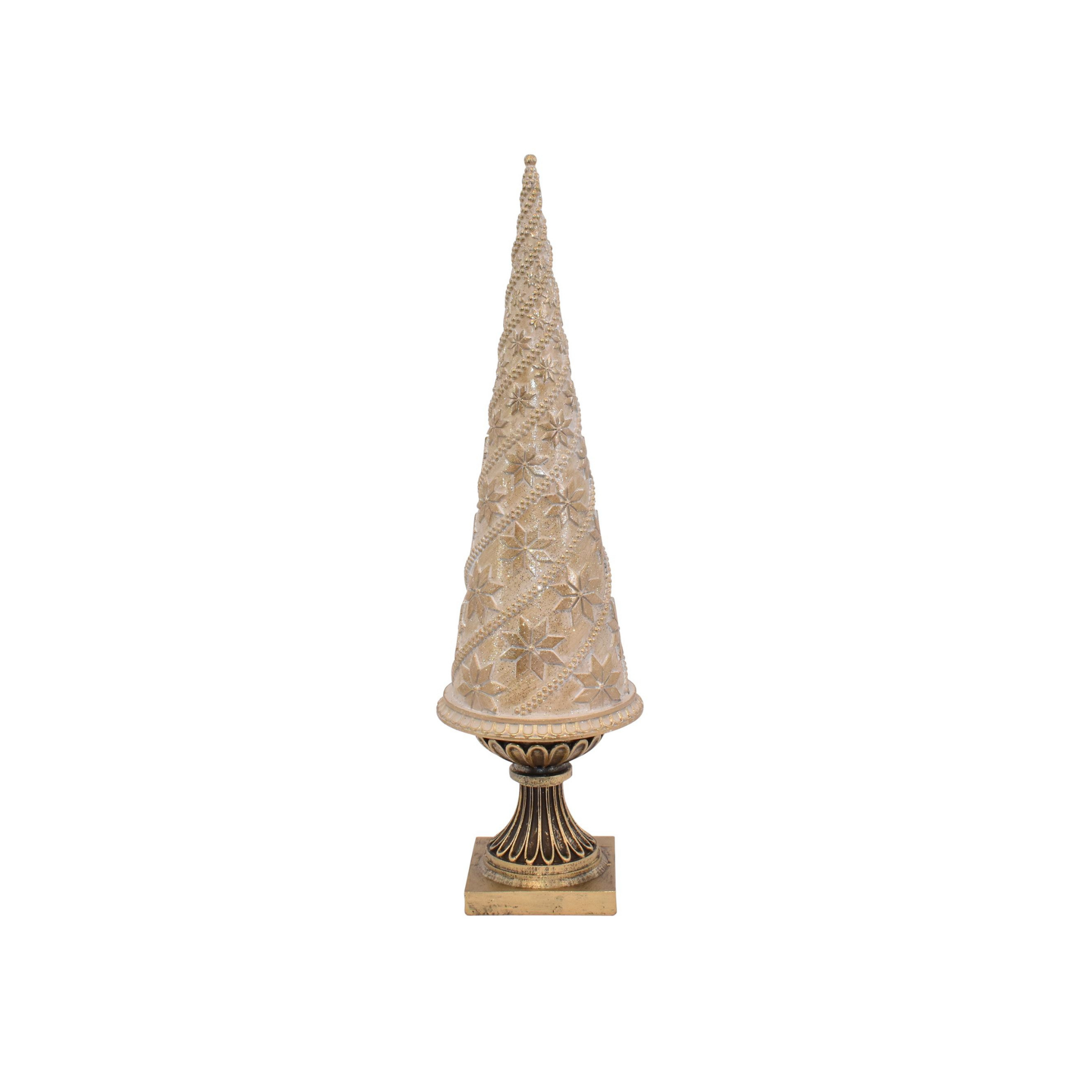 Edler goldener Baum aus Polyresin mit Sockel, der eine stilvolle Weihnachtsdekoration darstellt und in drei Größen erhältlich ist.