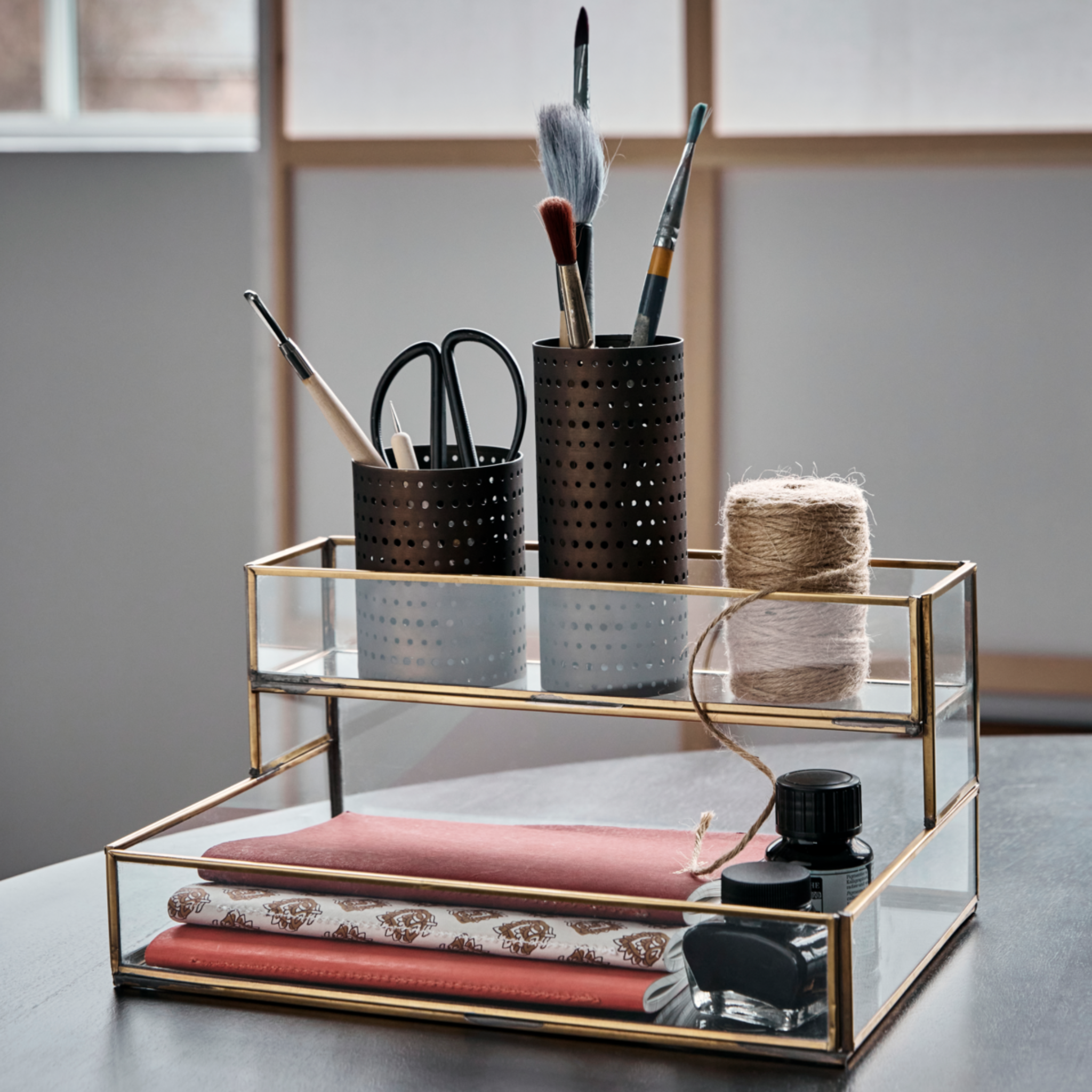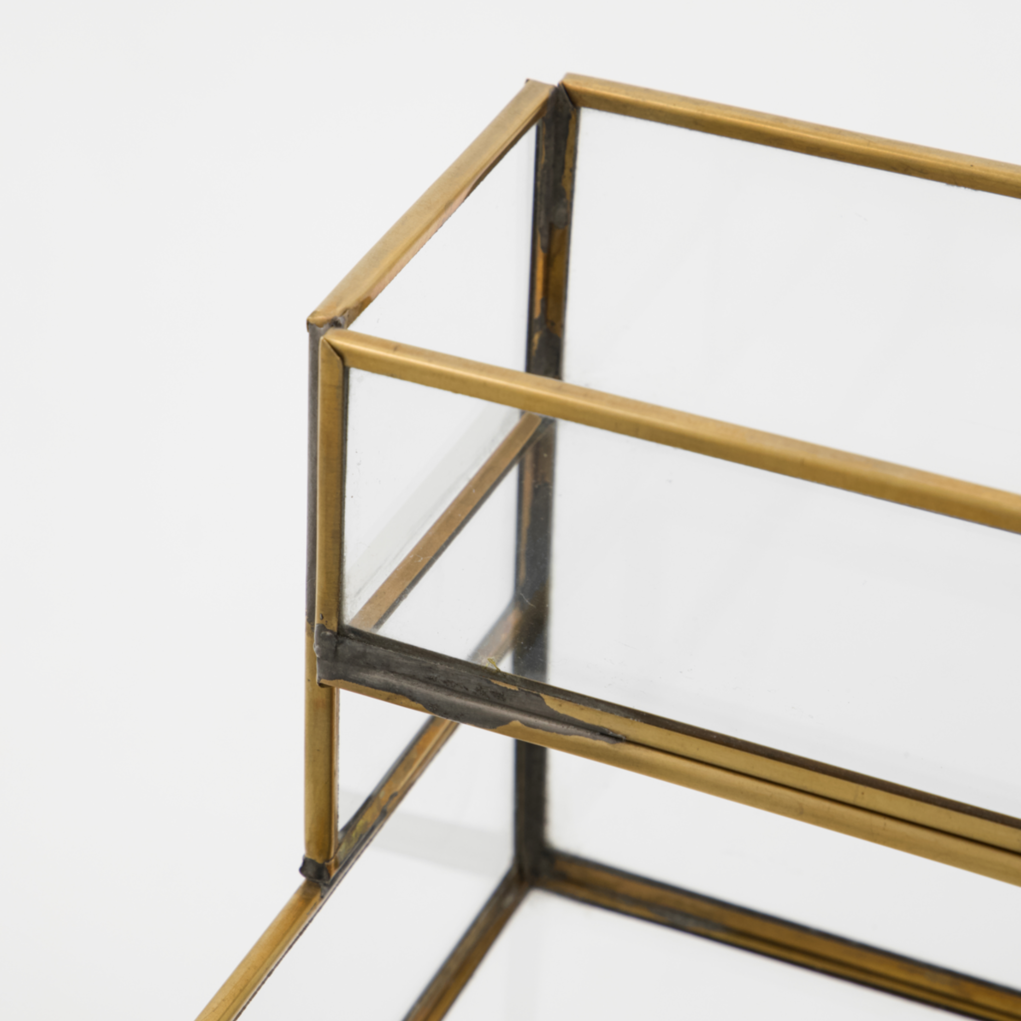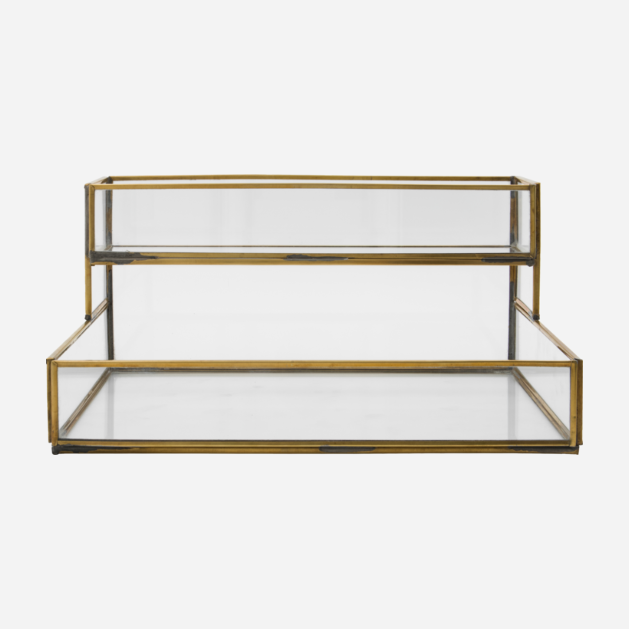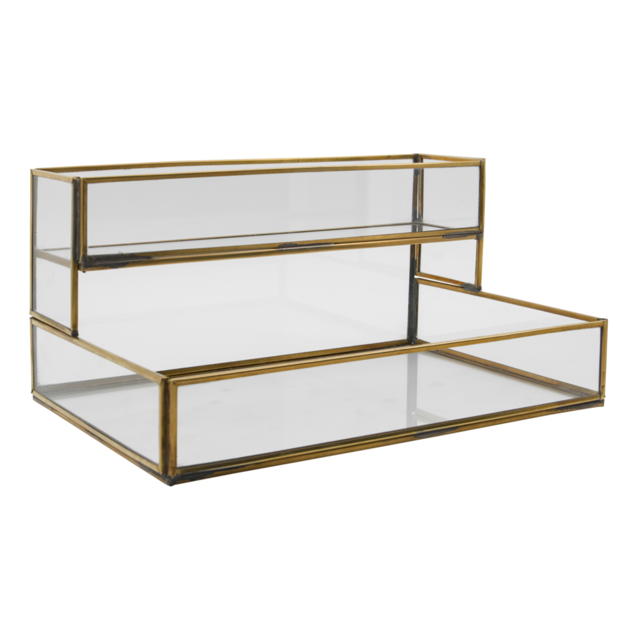 Dieses zweistöckige Tablett aus Glas und Messing vereint Eleganz und Funktionalität. Perfekt zur Aufbewahrung von Make-up, Bürobedarf oder Badezimmeraccessoires – eine raffinierte und praktische Ergänzung für jeden Raum!
