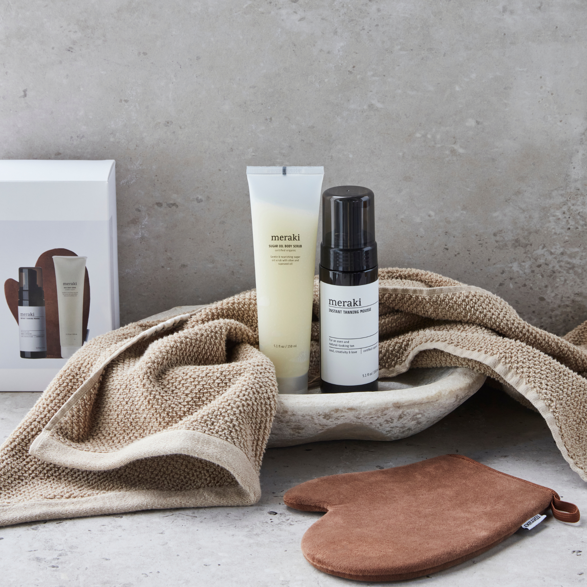 Das Meraki Tanning Kit ist perfekt für alle, die sich mit minimalem Aufwand einen gesunden, goldenen Teint wünschen. Das Kit kombiniert Pflege und Farbe für eine gleichmäßige, langanhaltende Bräune und sorgt gleichzeitig für weiche und gepflegte Haut.