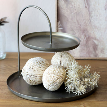 Dieses wunderschöne zweistöckige Tablett von Chic Antique eignet sich sowohl als dekorativer Mittelpunkt auf dem Esstisch als auch in der Küche. Füllen Sie das Tablett mit Kerzen, Blumen oder kleinen Schmuckstücken. Sie können es auch als abwechslungsreiche und charmante Bonbonschale zum Servieren von Süßigkeiten verwenden.