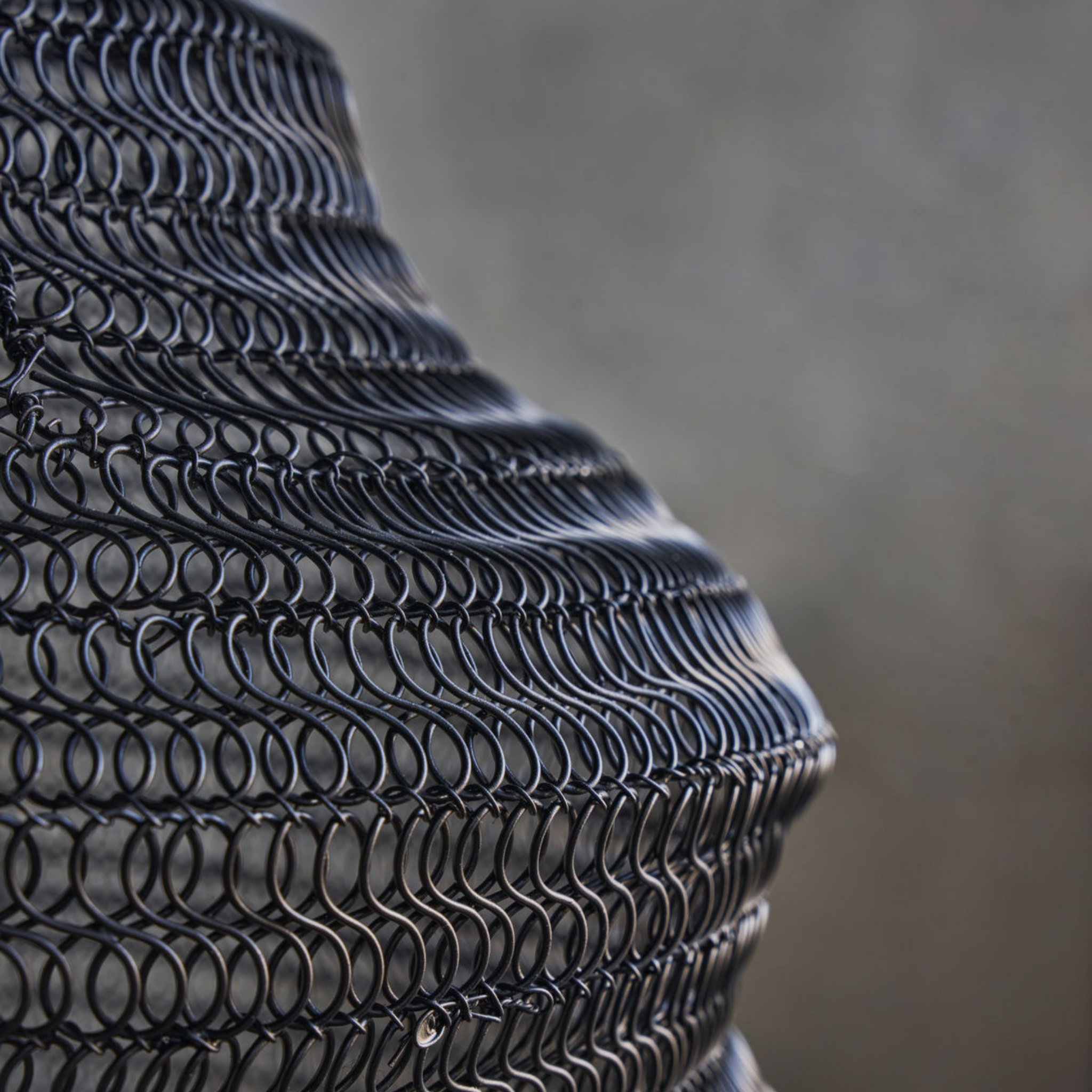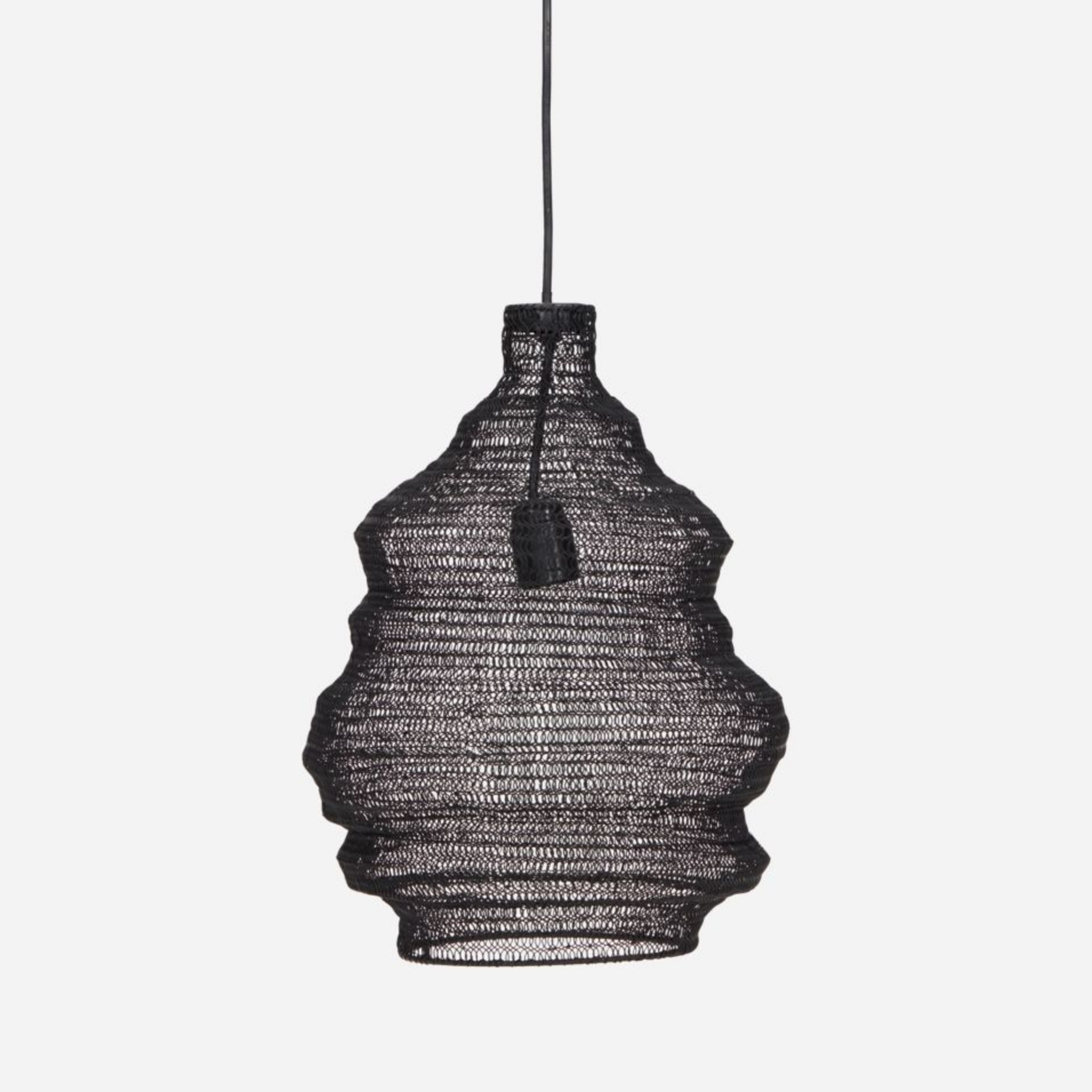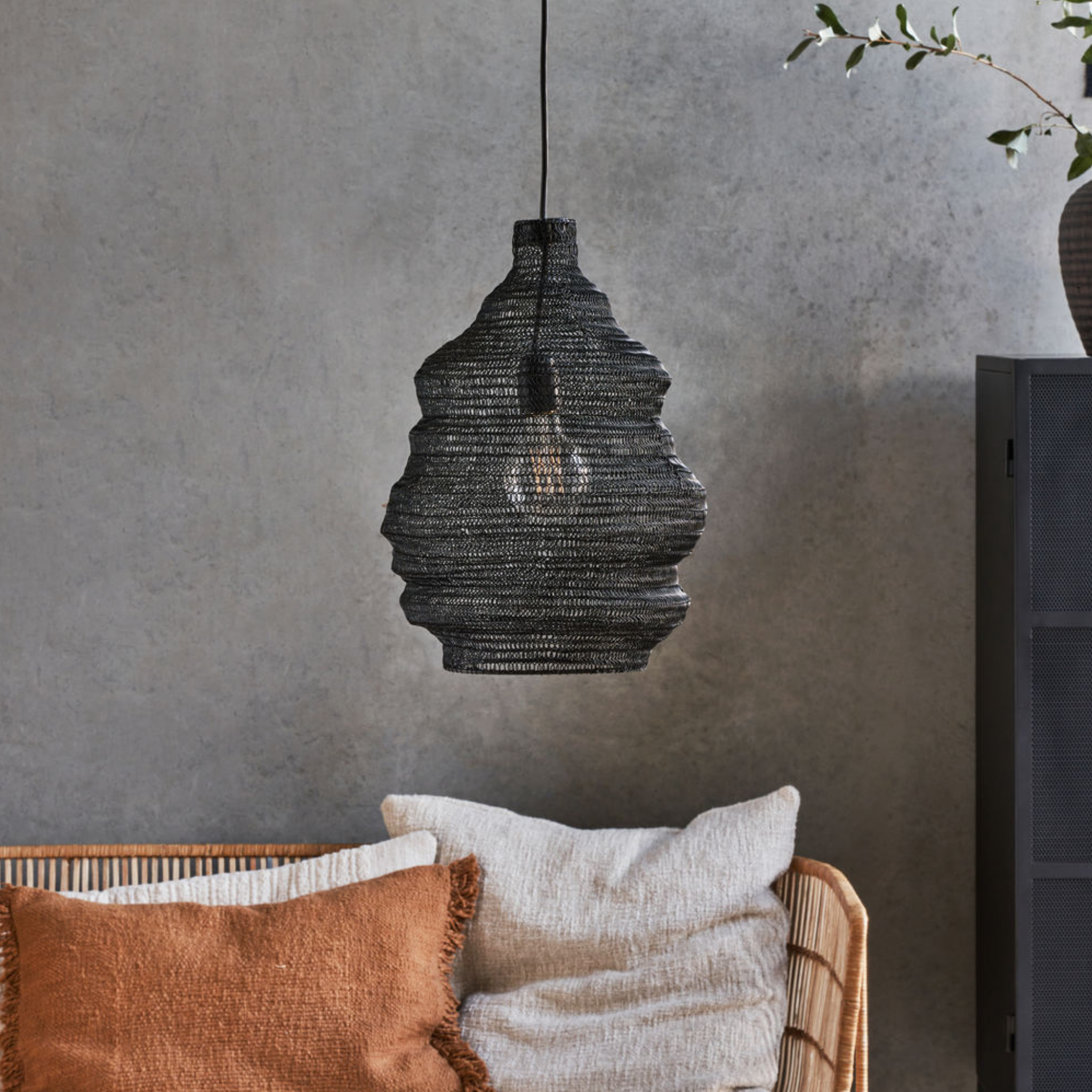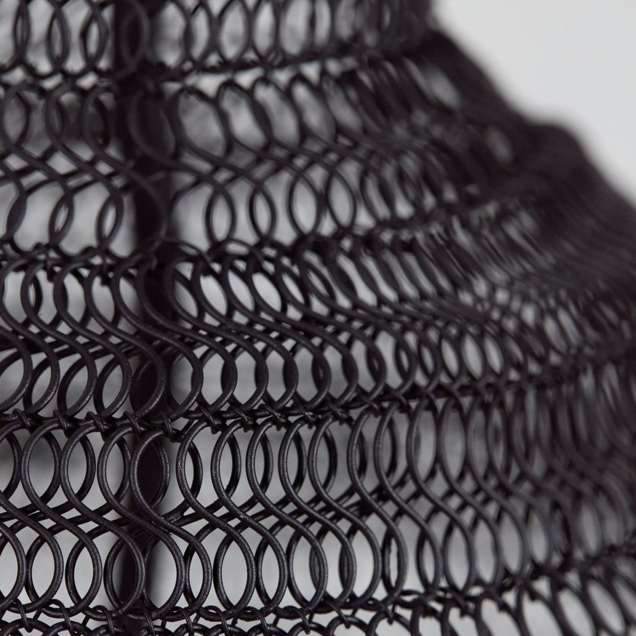 Diese Pendelleuchte aus schwarzem Mesh-Material lässt das Licht durchscheinen und schafft eine einladende Atmosphäre. Obwohl das Material einen industriellen Look hat, passt das vielseitige Design zu jedem Einrichtungsstil, von Boho bis Modern und Minimalistisch.