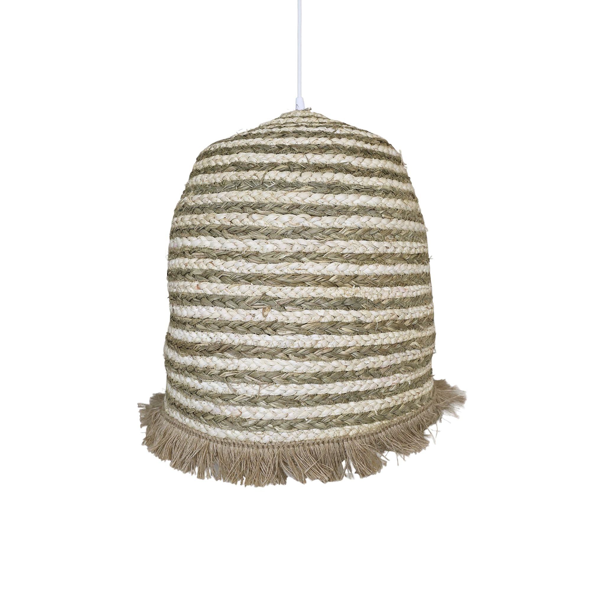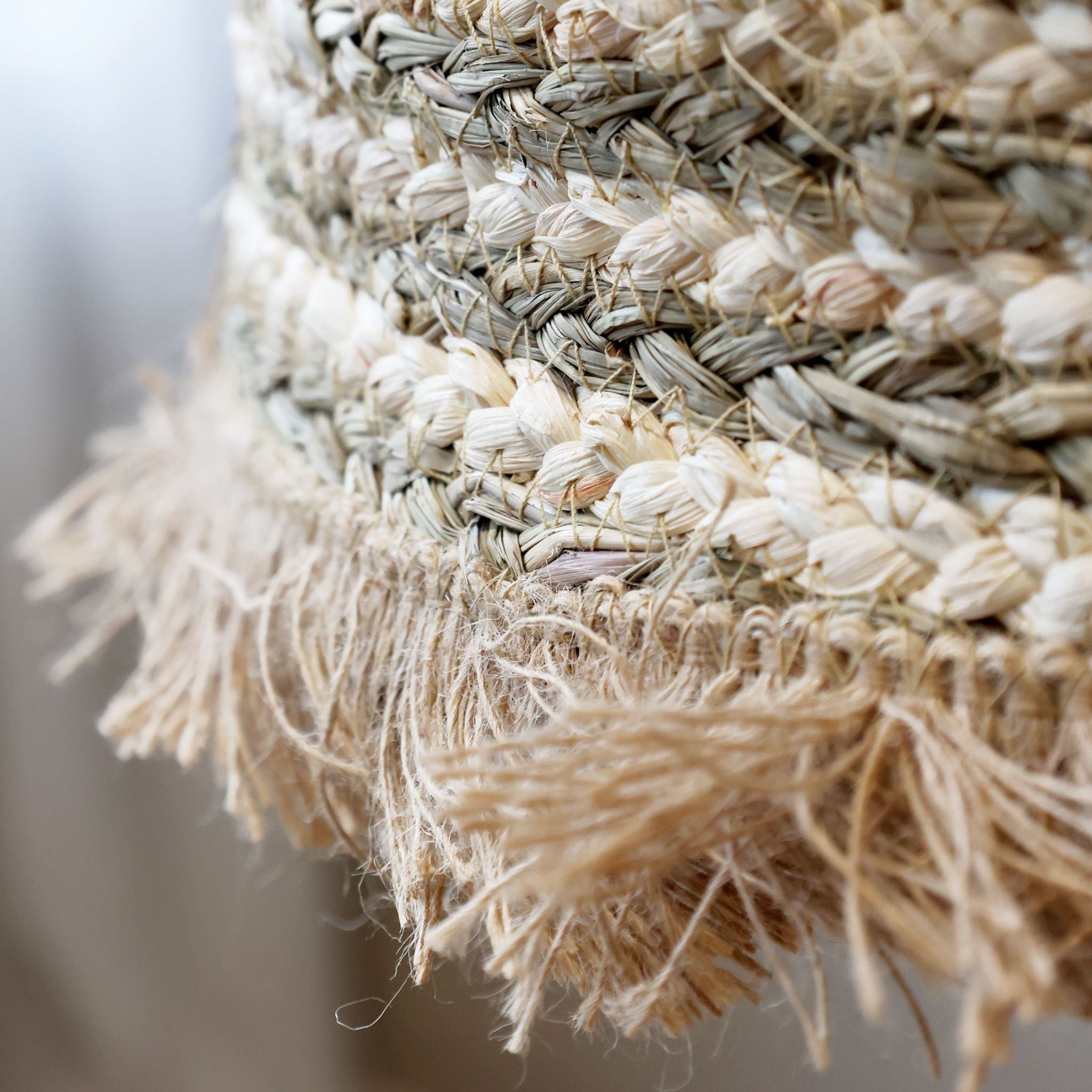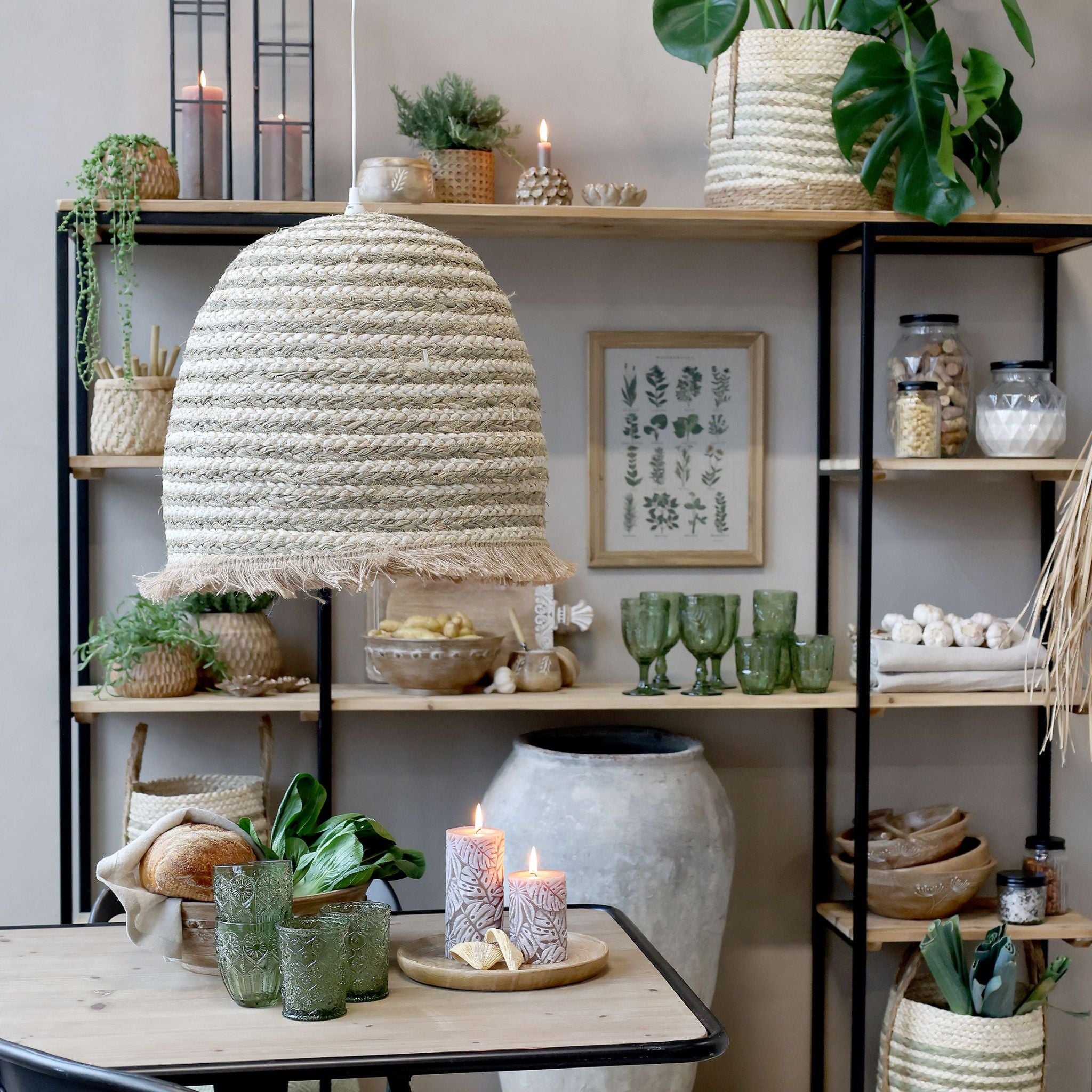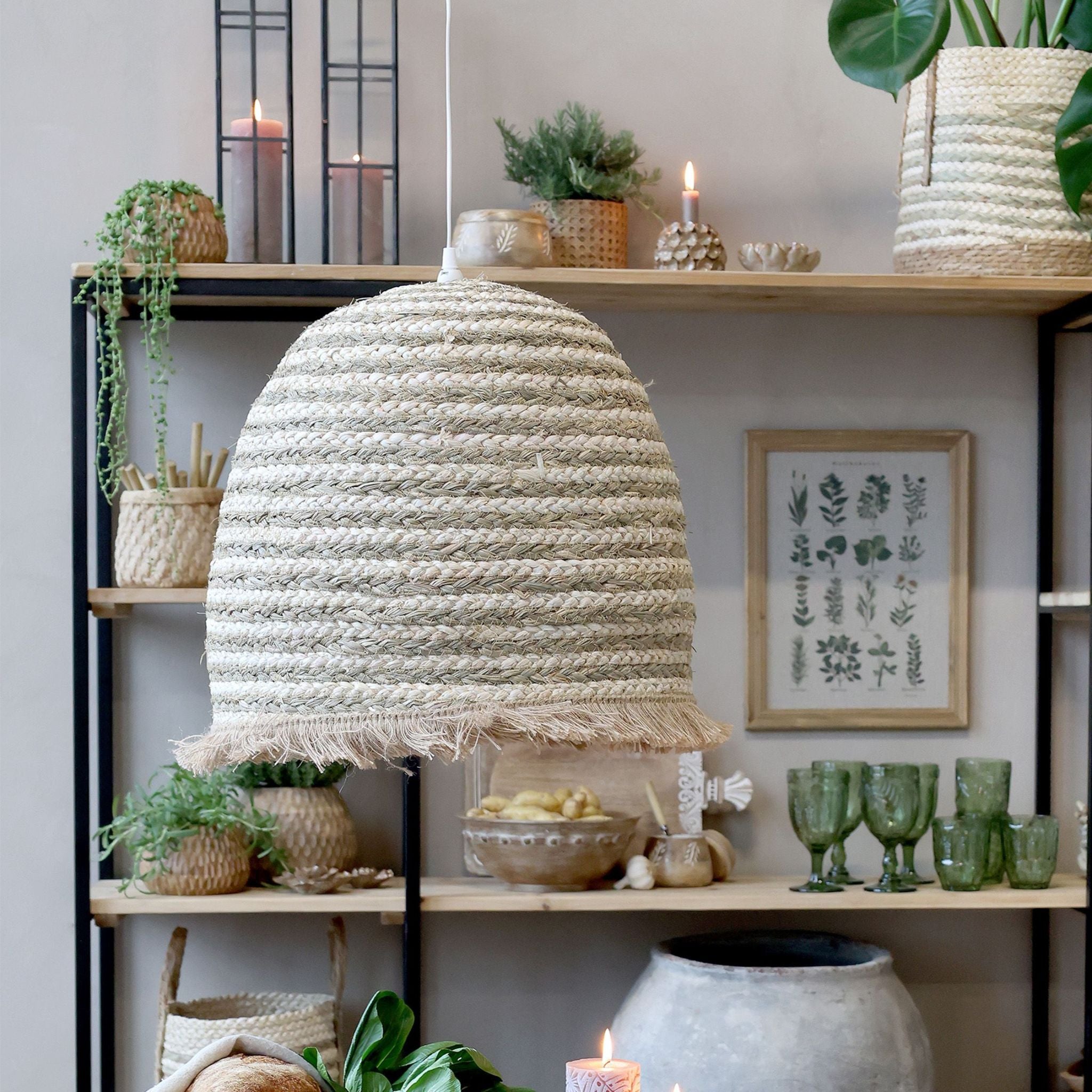 Verleihen Sie Ihrem Zuhause Wärme, Struktur und einen Hauch von Natur mit diesem wunderschönen Lampenschirm aus geflochtenem Mais- und Grasseil. Die filigrane, handgefertigte Struktur erzeugt ein weiches und gemütliches Licht, das perfekt über den Esstisch, in die Wohnzimmerecke oder überall dort passt, wo Sie entspannte und dekorative Beleuchtung wünschen.