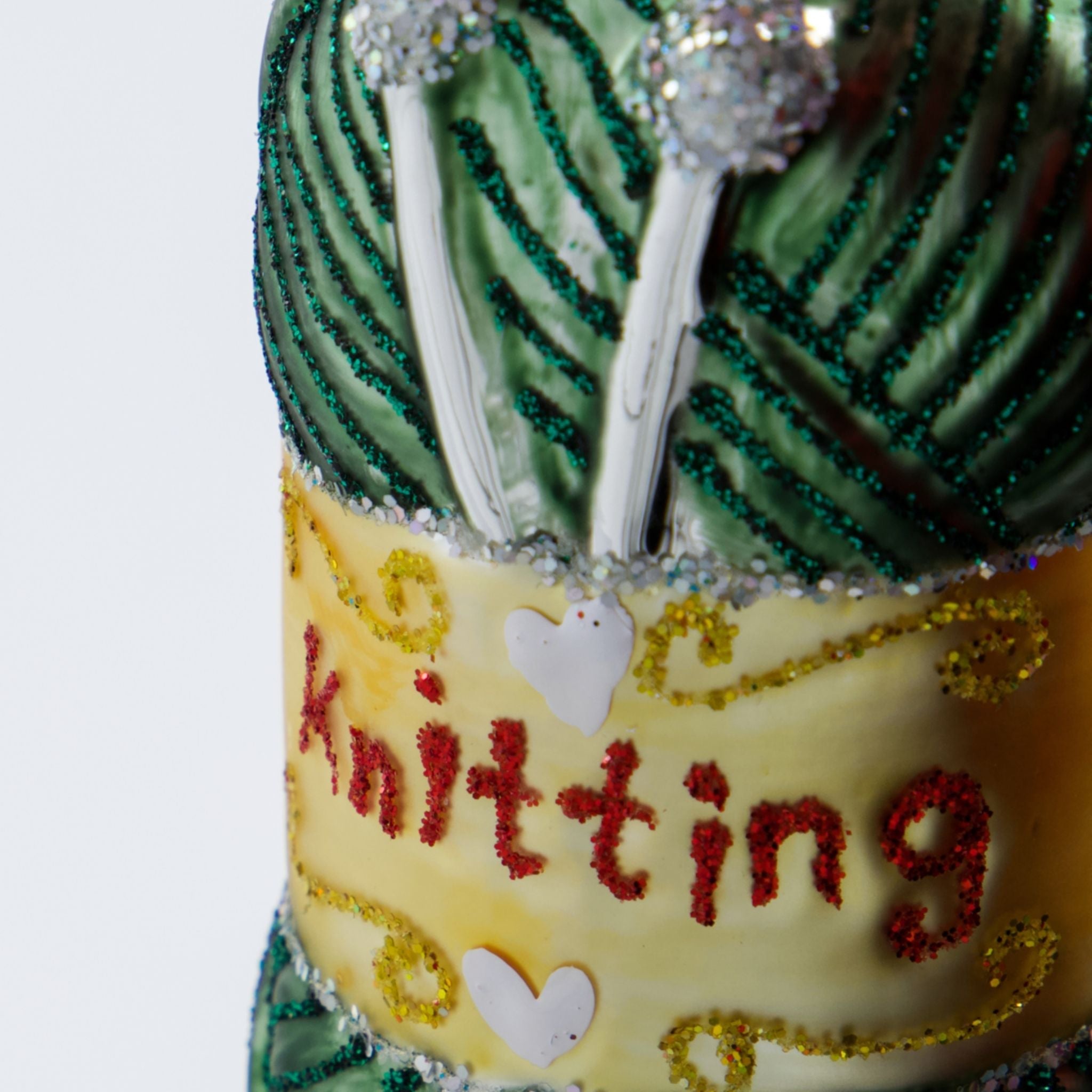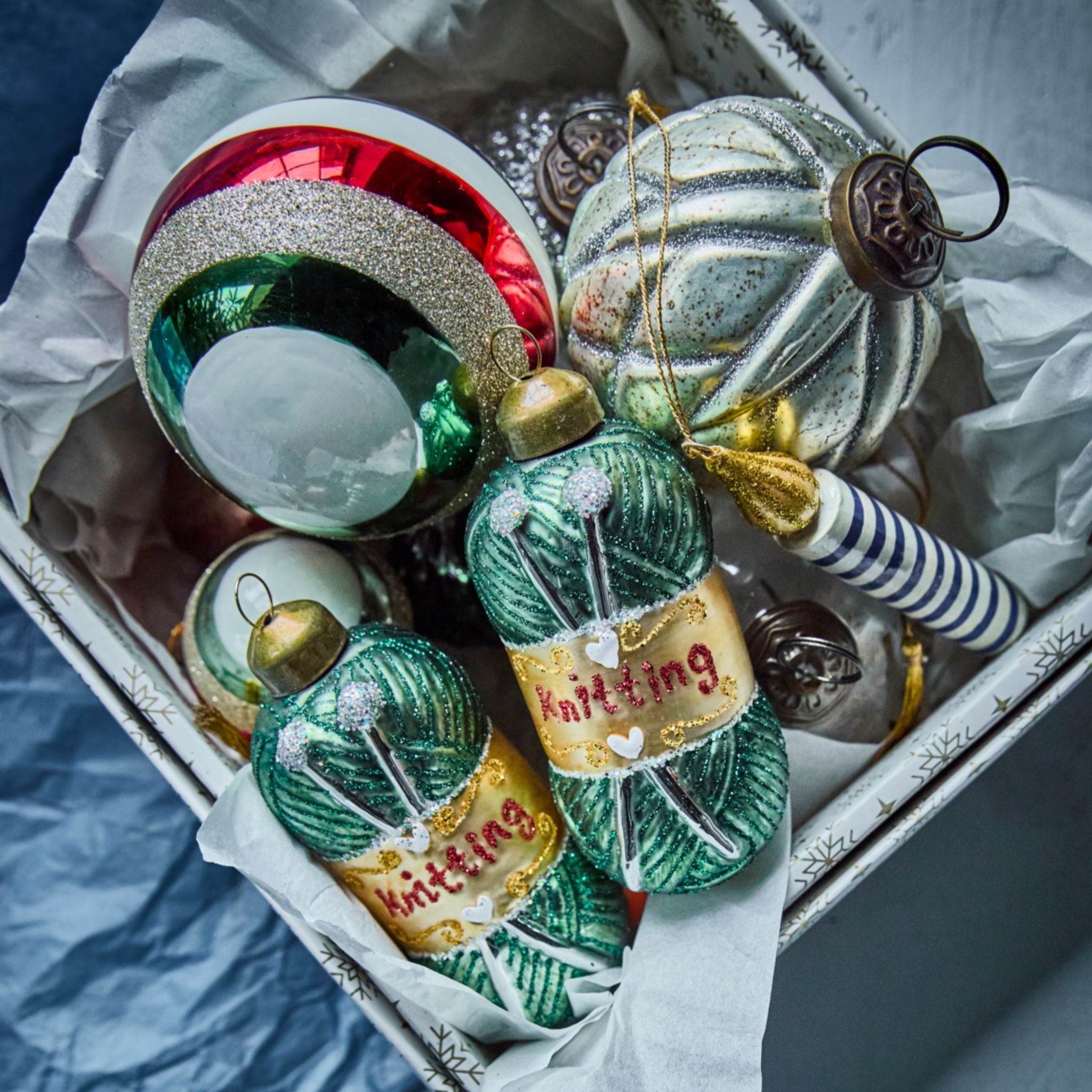 Mundblæst og håndlavet ornament formet som en garnnøgle med strikkepinde, fra House Doctor.