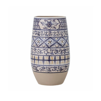 Die Nadya Vase von Bloomingville besteht aus wunderschönem Steingut mit blauen Farbtönen und ist mit einem handgemalten grafischen Muster verziert. Jede Vase ist ein Unikat und verleiht ihr eine persönliche und künstlerische Note.