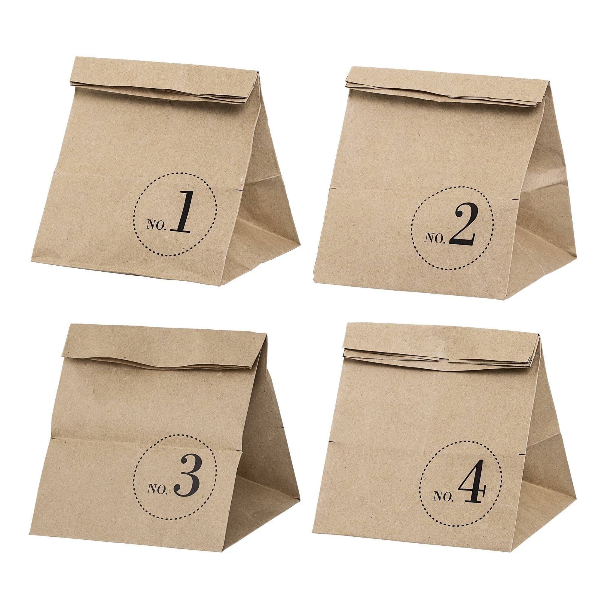 Naturfarbene Papiertüte mit den Zahlen Nr. 1-4 in Schwarz gedruckt