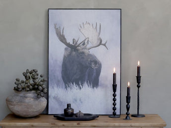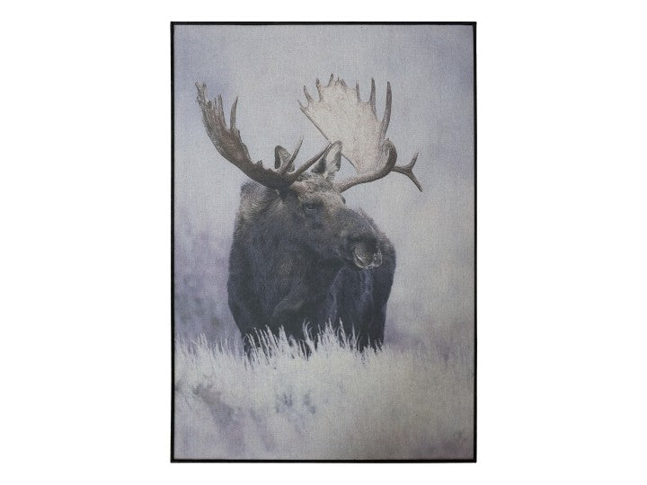 Das Kunstwerk besteht aus einer lebensechten Darstellung eines Elches und ist in einen schwarzen Rahmen eingerahmt, der das Motiv auf subtile Weise hervorhebt. Der Rahmen verleiht dem Bild einen eleganten Rahmen und trägt zu seiner Gesamtästhetik bei.