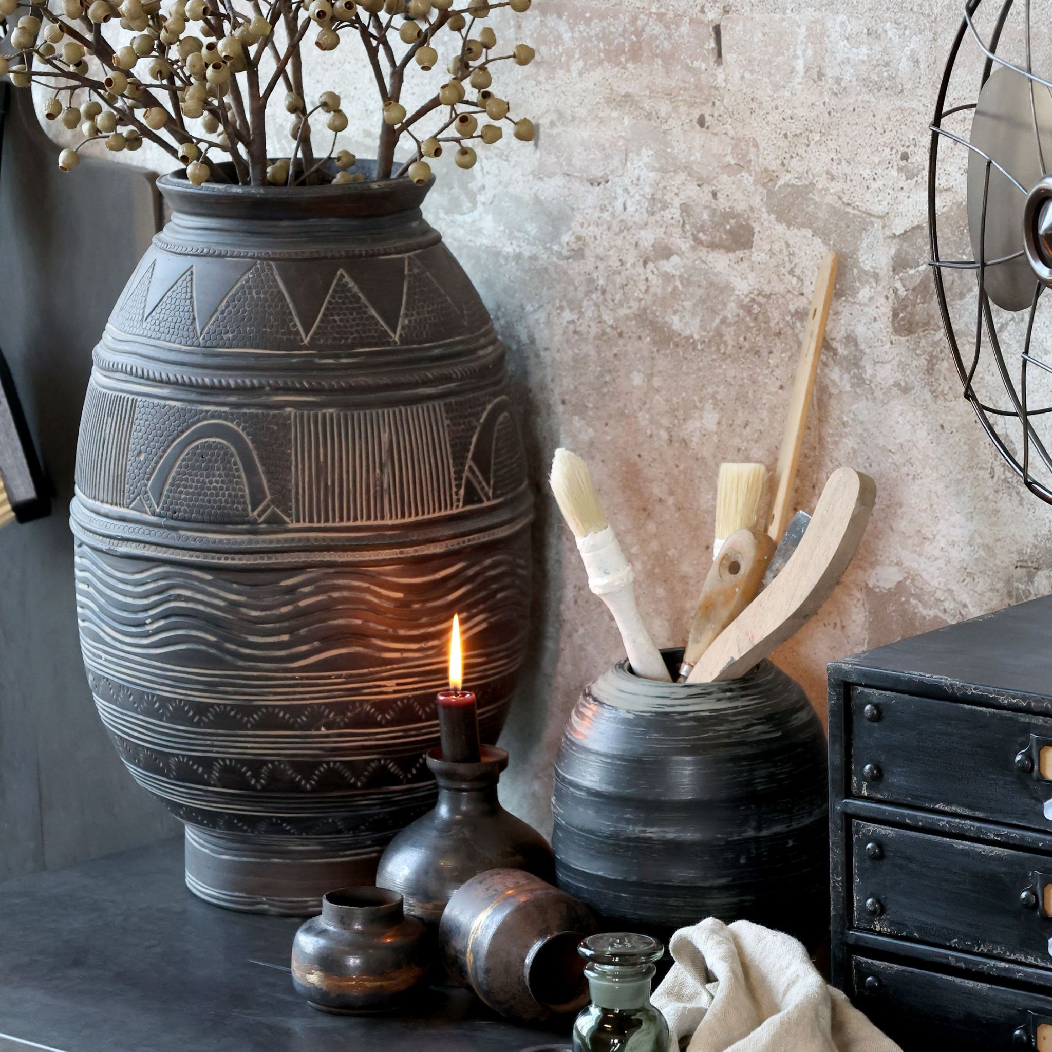 Verleihen Sie Ihrem Interieur einen Hauch von Weltgeschichte und exotischem Charme mit unseren rustikalen Gläsern in der Farbe Antique Charcoal von Chic Antique.