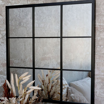 Smukt og rustikt spejl med en håndlavet antique sort jernramme der giver spejlet et råt og industrielt udtryk. Brug spejlet til dekoration på badeværelset, soveværelset eller i entréen. Du kan også sagtens bruge spejlet i stuen, hvor det vil skabe en illusion af mere lys og mere plads.