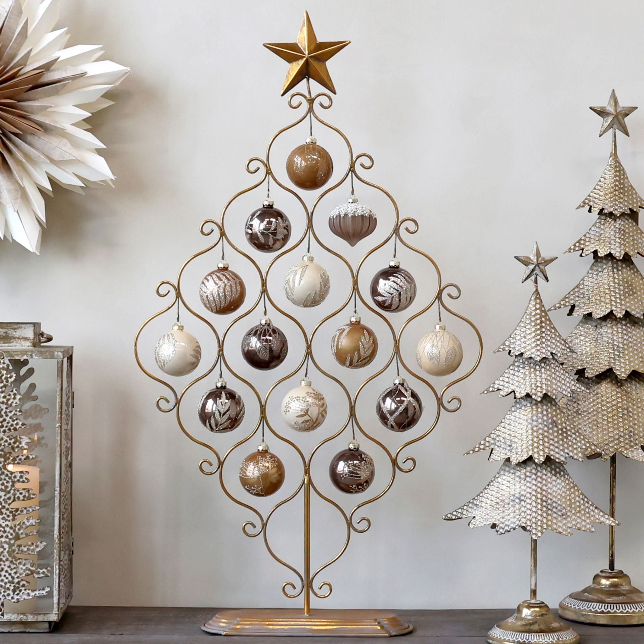 Dieser schöne Ständer hat die Form eines Weihnachtsbaums und bietet Platz zum Aufhängen von Weihnachtsdekorationen und Weihnachtskugeln. Eine tolle Möglichkeit, Ihre Lieblingsweihnachtskugeln zu präsentieren. Der Baum bietet Platz für 15 Weihnachtskugeln/-ornamente und der Ständer hat eine schöne antike Messingfarbe.