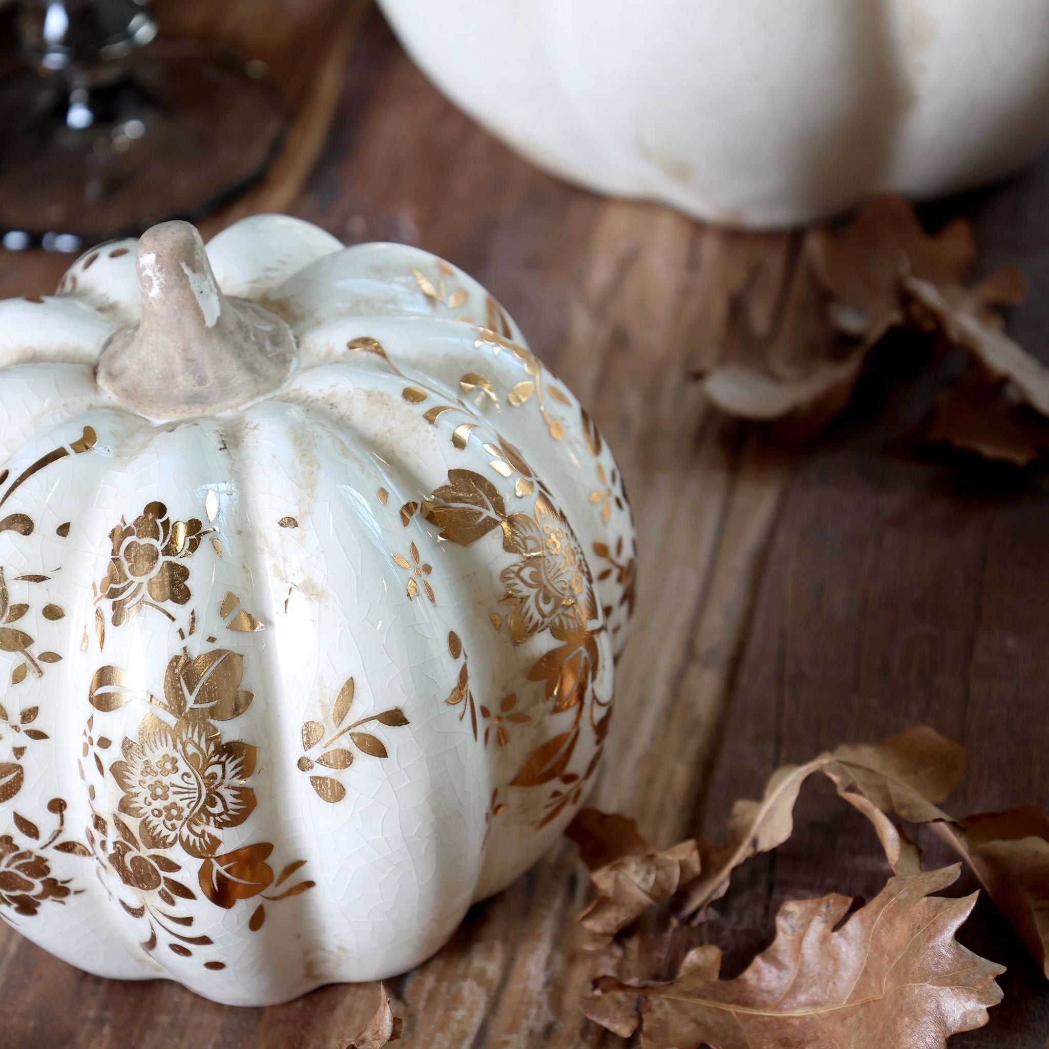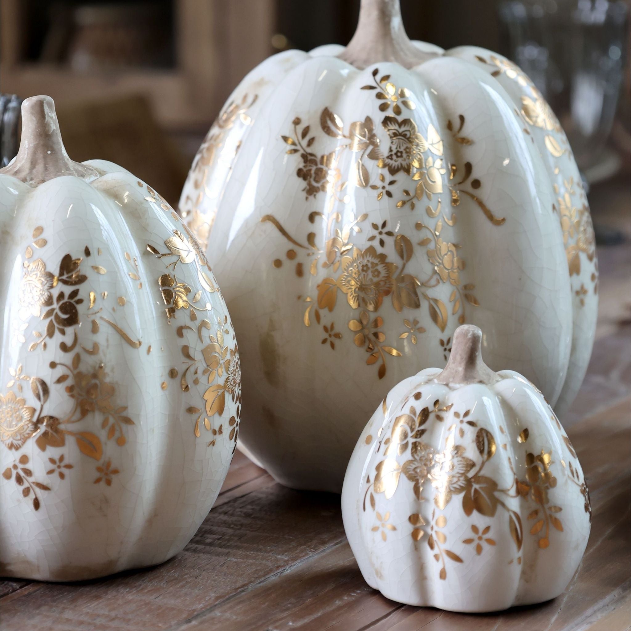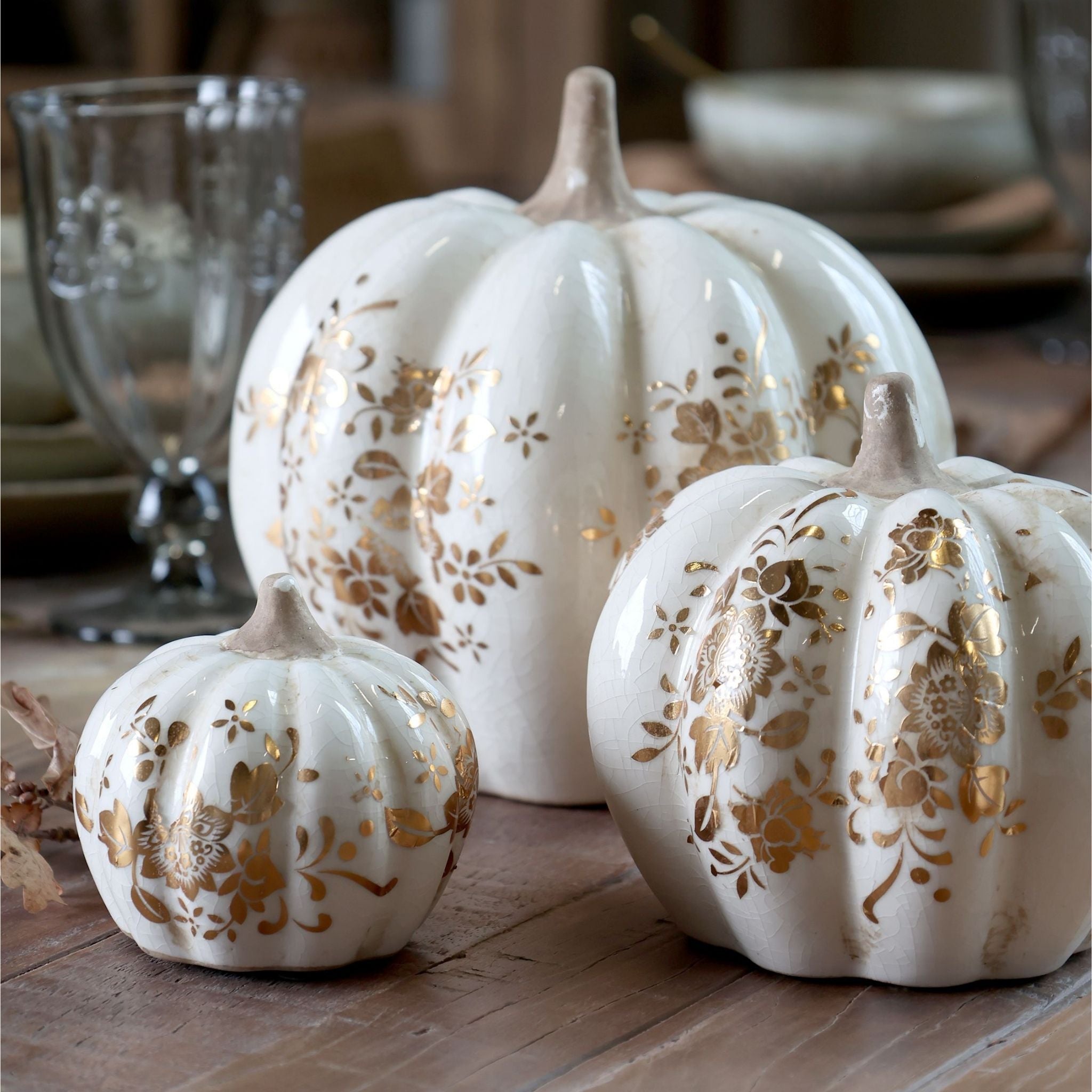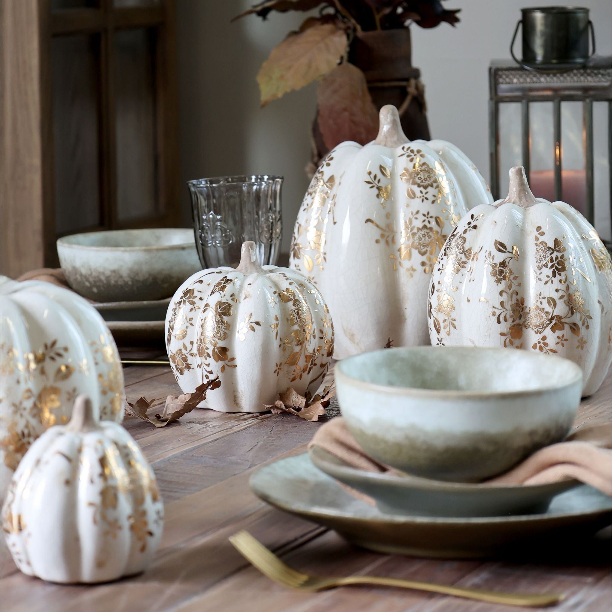 Schaffen Sie eine elegante Herbstatmosphäre mit diesen wunderschönen Deko-Kürbissen aus der beliebten Melun-Serie von Chic Antique. Die Kürbisse bestehen aus cremefarbener Keramik mit einem wunderschönen Blumenmotiv in Gold. Durch die unterschiedlichen Größen lassen sich mehrere Kürbisse leicht zu einer schönen Dekoration kombinieren – perfekt für die Tischdekoration, auf der Fensterbank oder im Regal, wo immer Sie eine schöne und gemütliche Atmosphäre schaffen möchten.