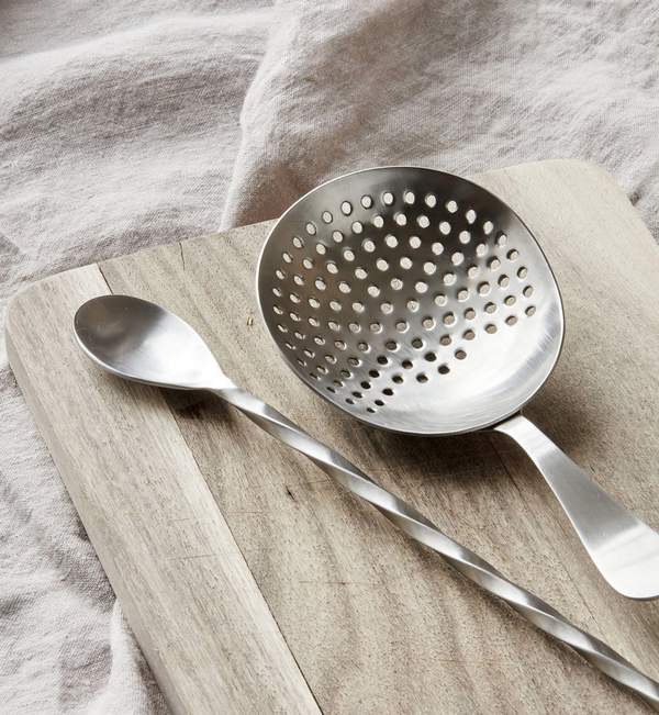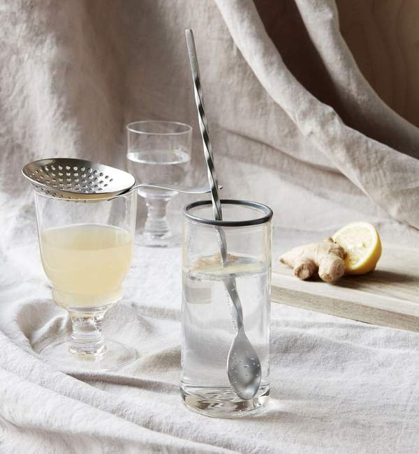 Cocktail-Set von Nicolas Vahé, bestehend aus einem langen Löffel und einem Sieb.
