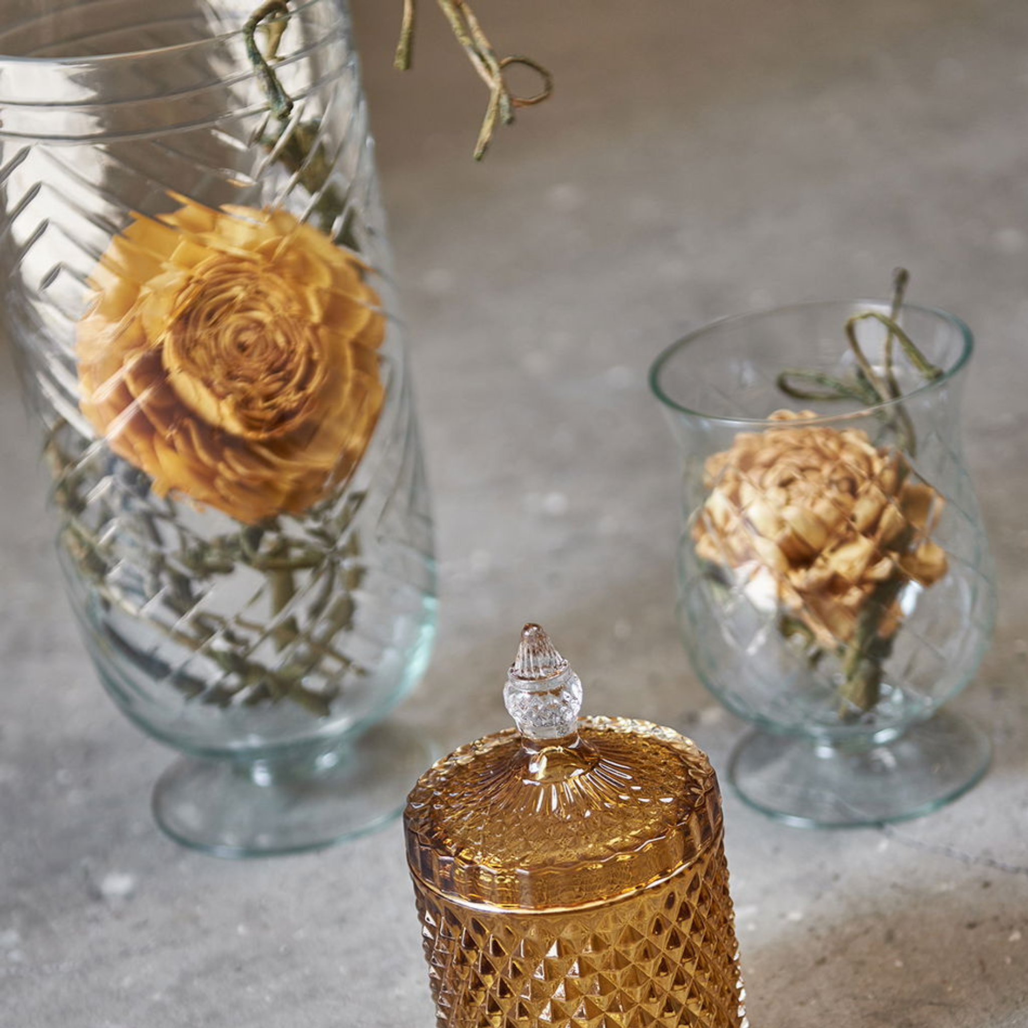Schaffen Sie eine stimmungsvolle Atmosphäre mit diesem eleganten Hurricane-Glas mit wunderschönen Schliffen, die das Licht auf atemberaubende Weise reflektieren. Perfekt für Kerzen oder als dekorative Vase verleiht es Ihrem Zuhause einen zeitlosen und stilvollen Ausdruck.