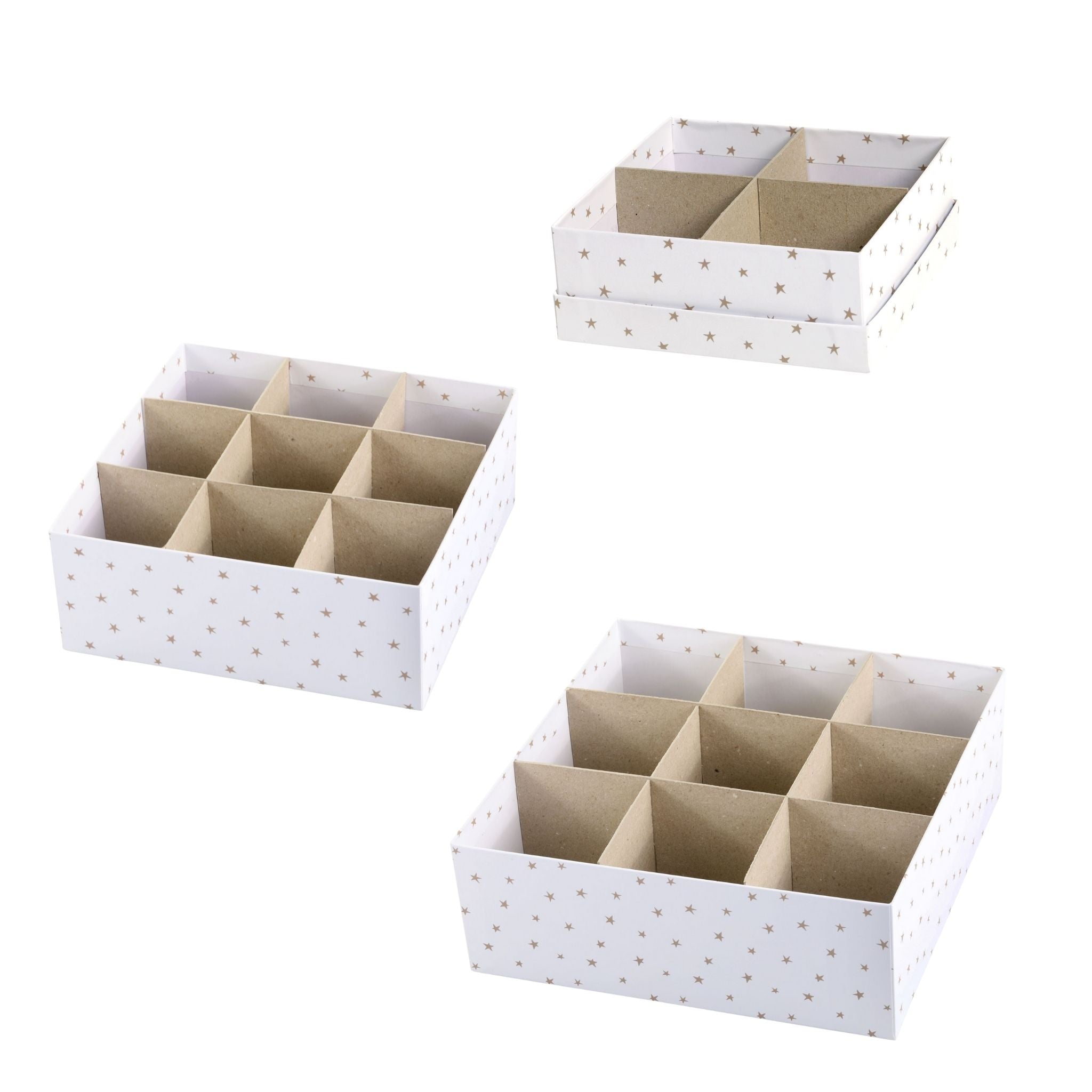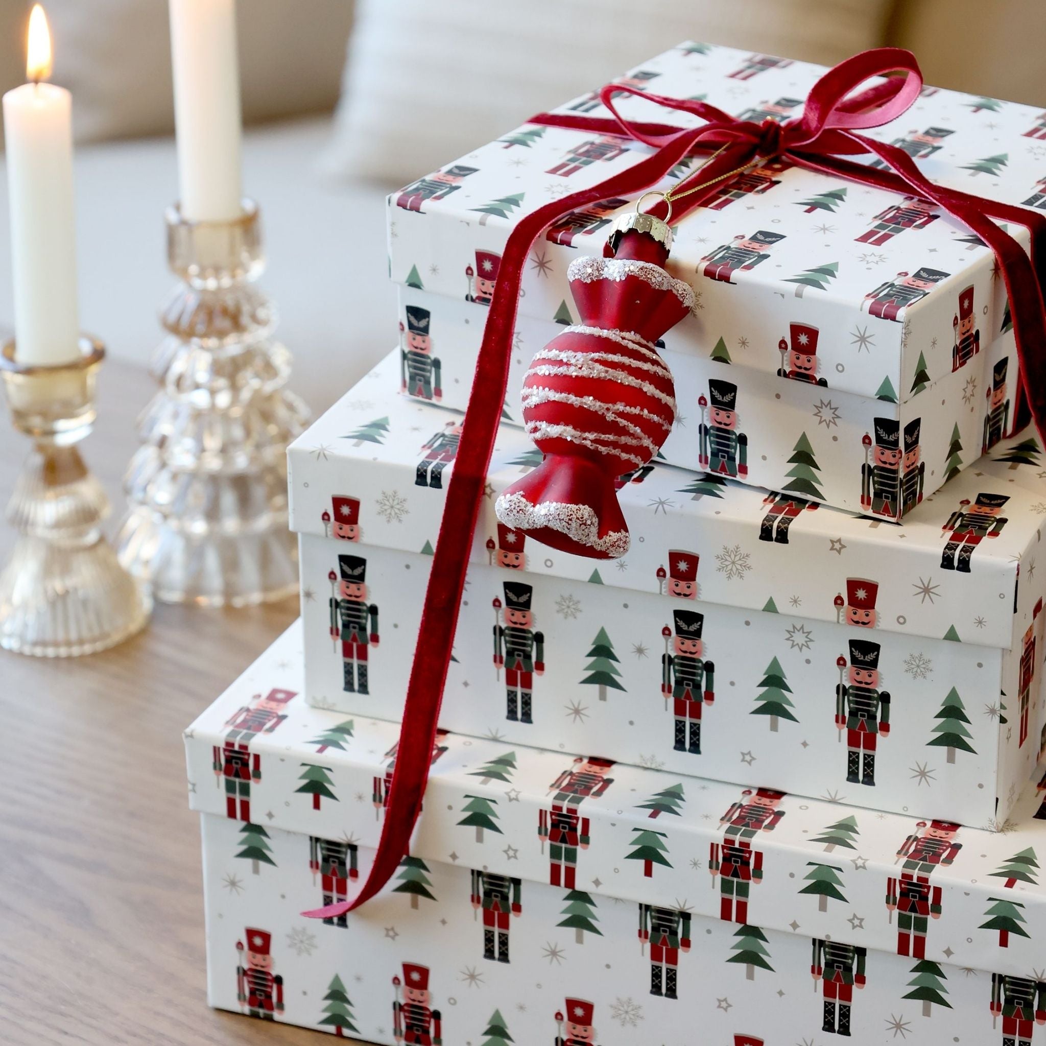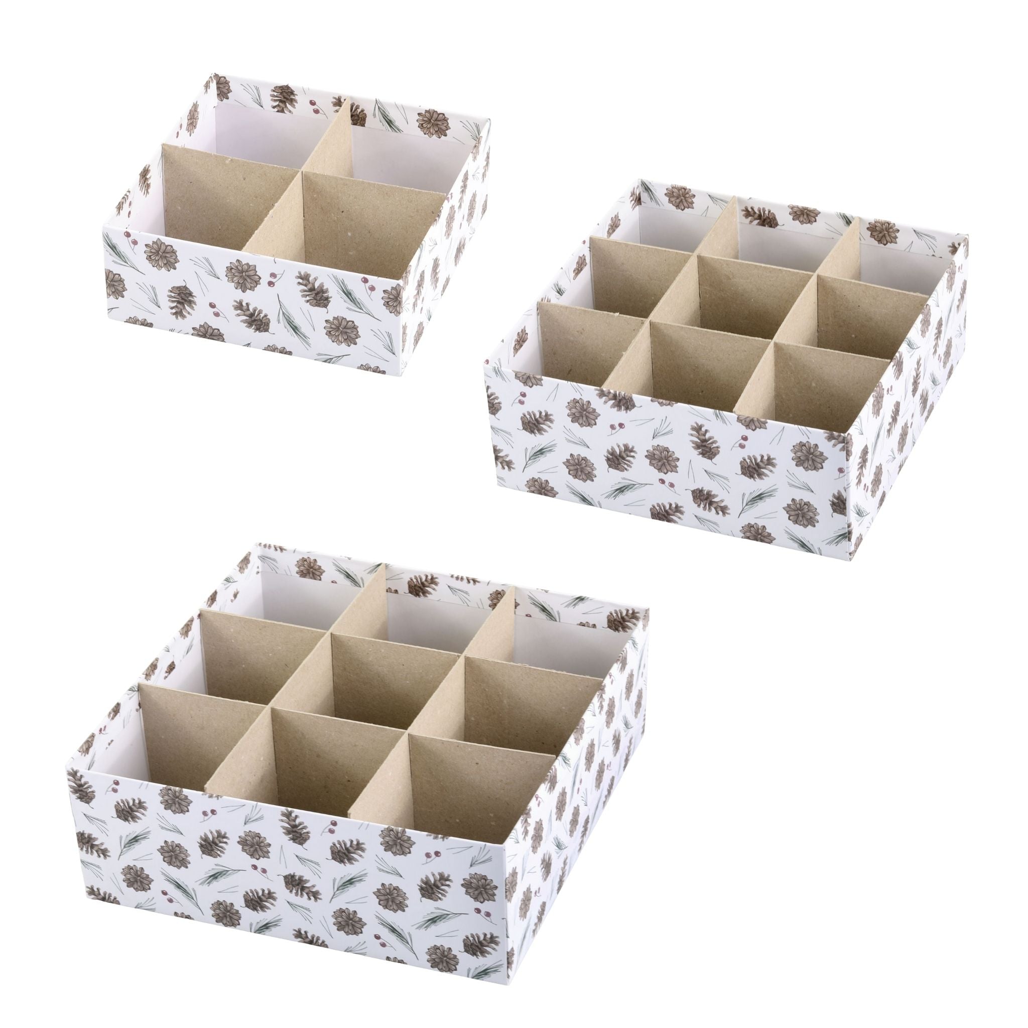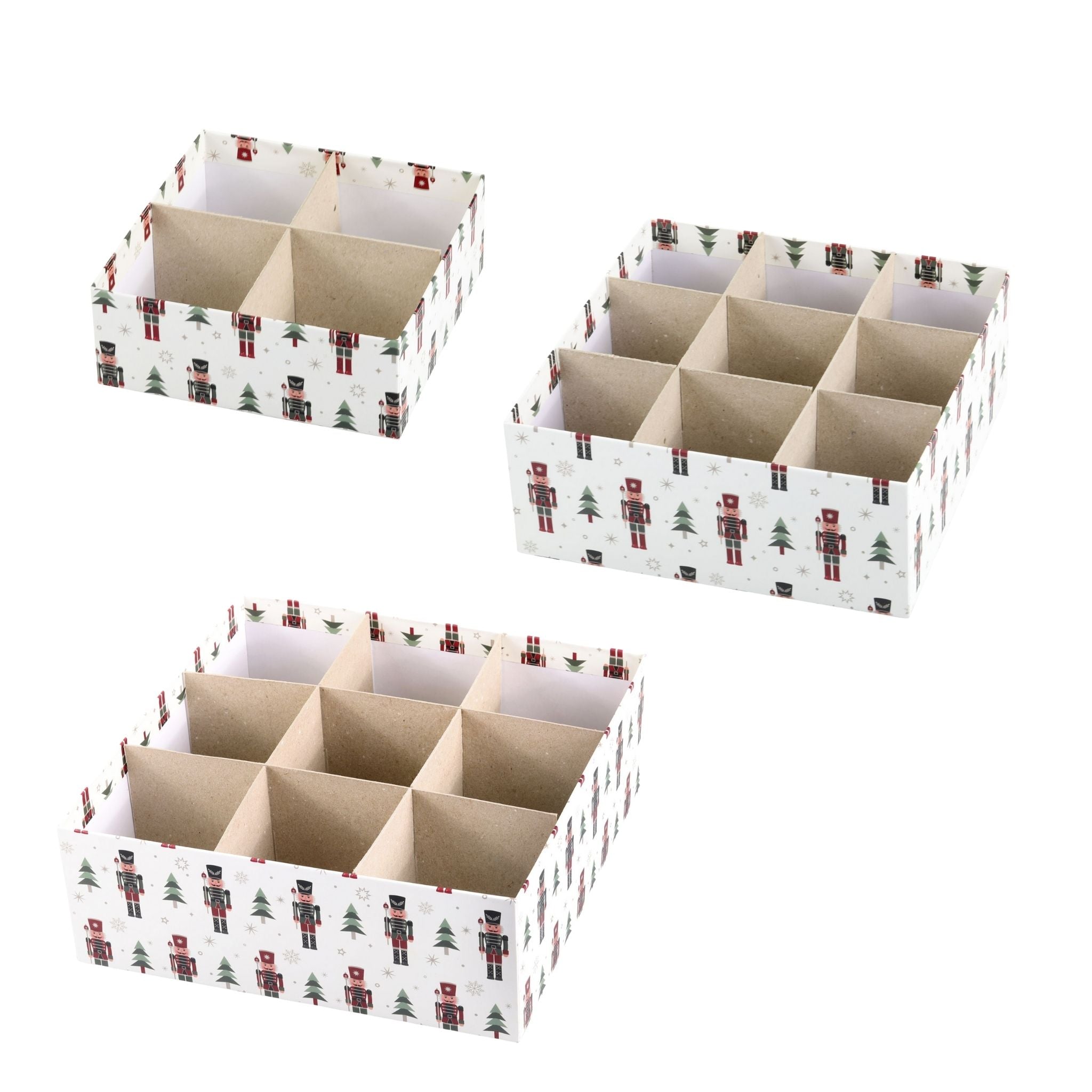 3er-Set Boxen mit weihnachtlichem Design. Die Boxen sind mit Trennwänden ausgestattet und eignen sich daher ideal zur Aufbewahrung von Weihnachtskugeln, Christbaumschmuck oder anderen Weihnachtsdekorationen. Sie können die Trennwände auch herausnehmen und die Boxen zum Verpacken von Weihnachtsgeschenken oder zur Aufbewahrung größerer Gegenstände verwenden.