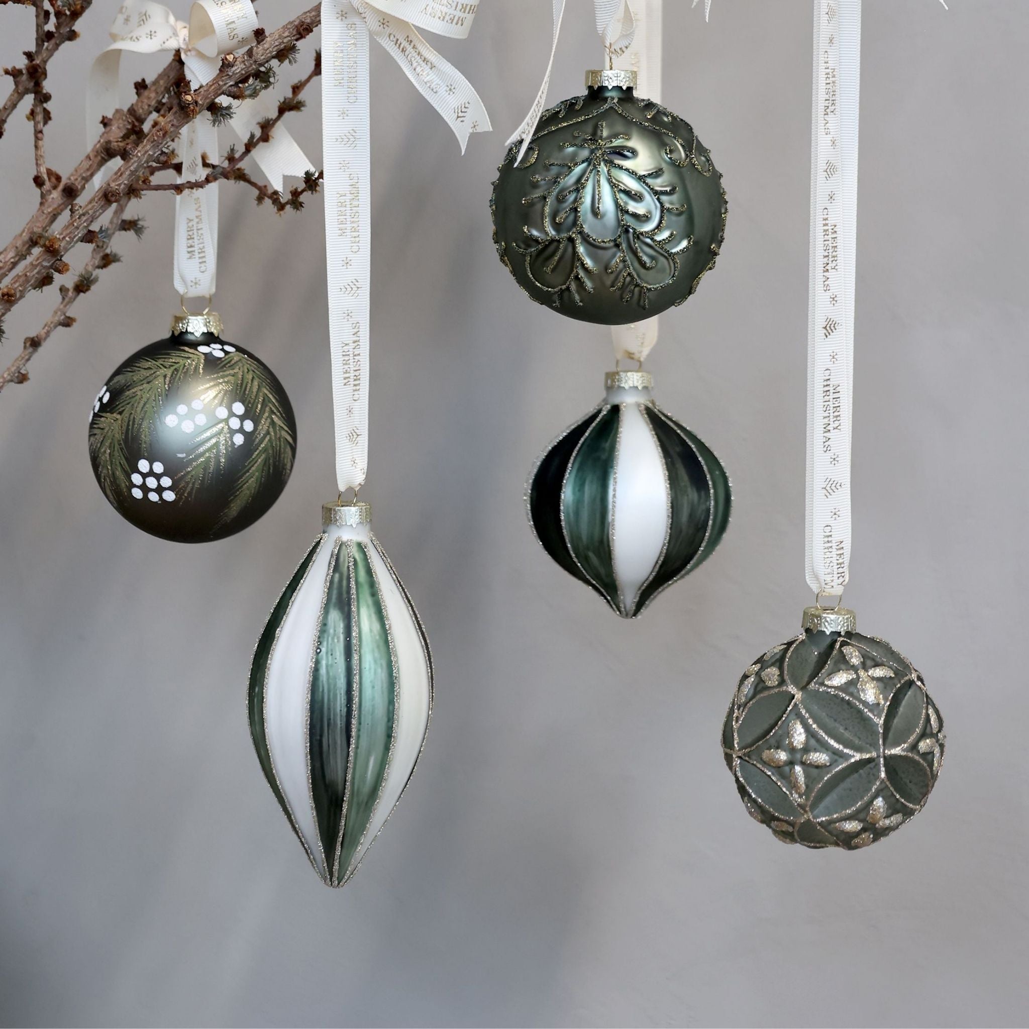 Wunderschöne Weihnachtskugel in einem schönen Moosgrün mit vielen Details und Glitzer. Die Weihnachtskugel ist handbemalt. Hängen Sie die Weihnachtskugel an Ihren Weihnachtsbaum oder dekorieren Sie ein Tablett mit verschiedenen Weihnachtskugeln, um im Dezember eine gemütliche Weihnachtsstimmung zu schaffen.