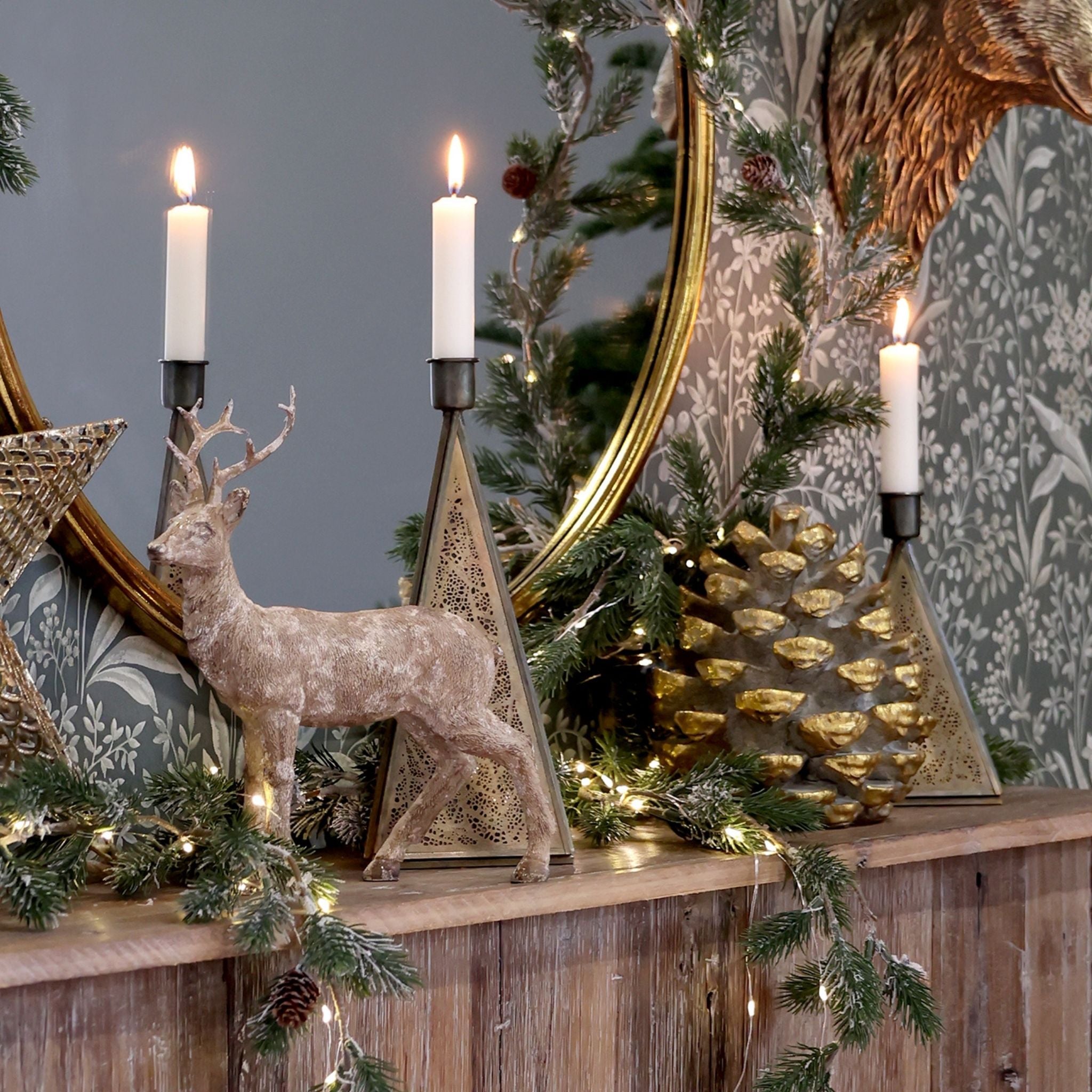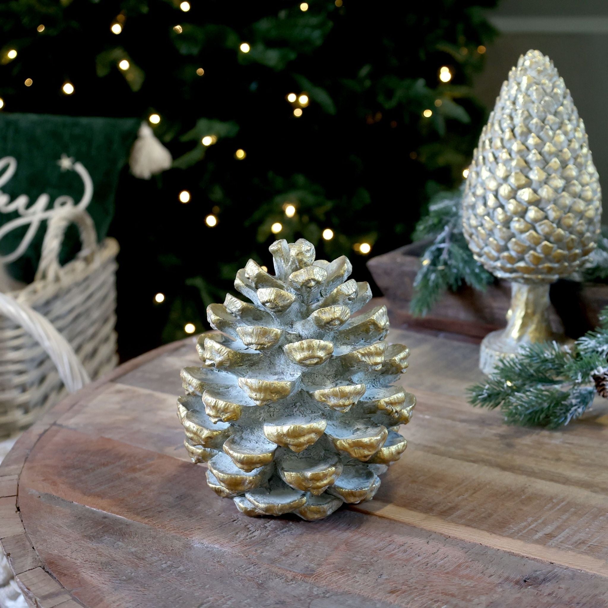 Großer Deko-Kegel von Chic Antique. Kann als Teil der Weihnachtsdekoration verwendet werden, eignet sich aber auch hervorragend als Dekoration im Herbst und Winter. Lackiert in Antikmessing, was ihm ein antikes und exklusives Aussehen verleiht.
