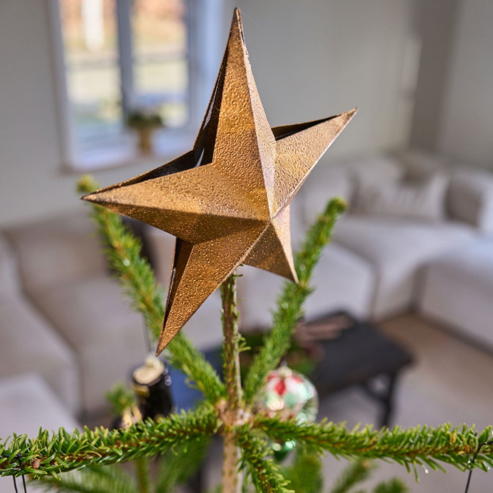 Verleihen Sie Ihrem Weihnachtsbaum mit diesem goldenen Stern den letzten Schliff. Erhältlich in zwei Größen, können Sie diejenige wählen, die am besten zu Ihrem Baum passt und Ihrer Weihnachtsdekoration eine elegante und festliche Note verleiht.