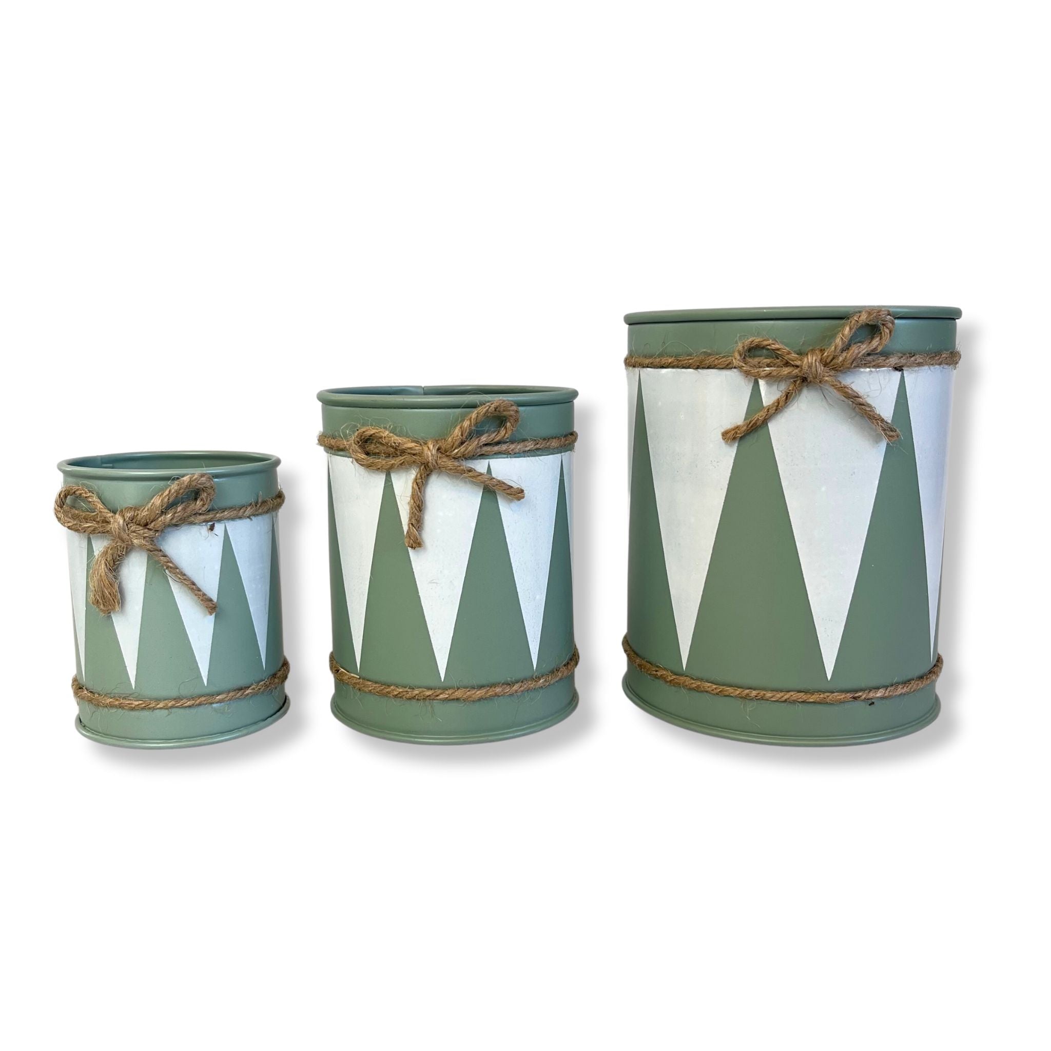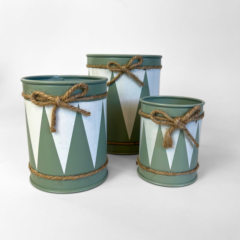 Søde urtepotter i metal malet som trommer i støvet grøn. Pynt skjulerne med et lille grantræ, en blomst eller kogler. Kun fantasien sætter grænser.