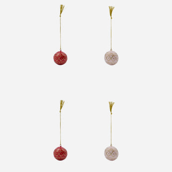 Verleihen Sie Ihrem Zuhause mit diesen handgefertigten Pappmaché-Ornamenten eine einzigartige und festliche Note. Das Set besteht aus vier Ornamenten in zwei verschiedenen Designs in wunderschönen Rot- und Rosatönen oder Dunkel- und Mintgrün. Jedes Ornament ist mit einem handgemalten Goldmuster verziert, das Eleganz und ein exklusives Aussehen verleiht – perfekt für den Weihnachtsbaum, die Tischdekoration oder als kleine Dekoration im Haus.
