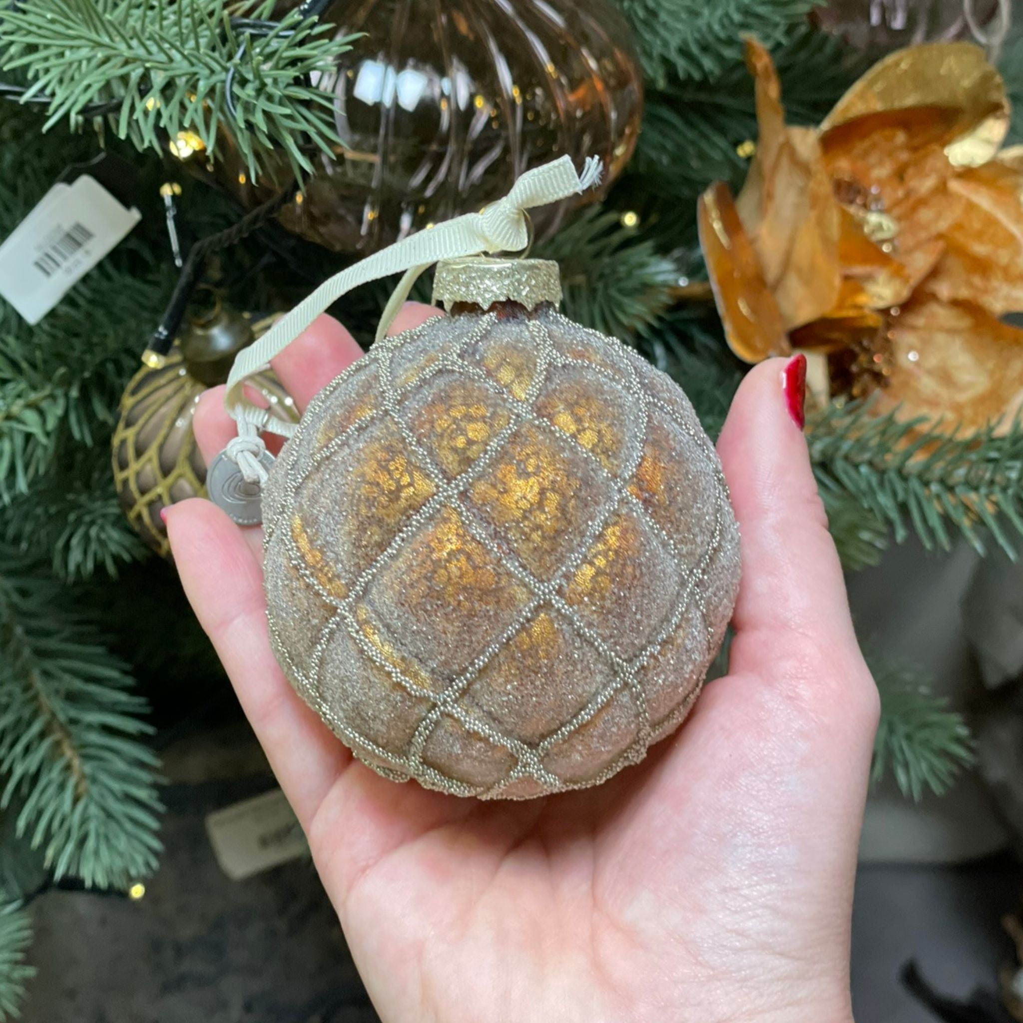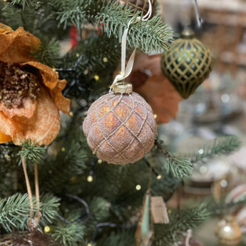 Verleihen Sie Ihrem Weihnachtsbaum eine einzigartige Note mit dieser wunderschönen handgefertigten Weihnachtskugel in einem schönen warmen Farbton. Die Kugel besteht aus Glas und ist 8 cm groß.