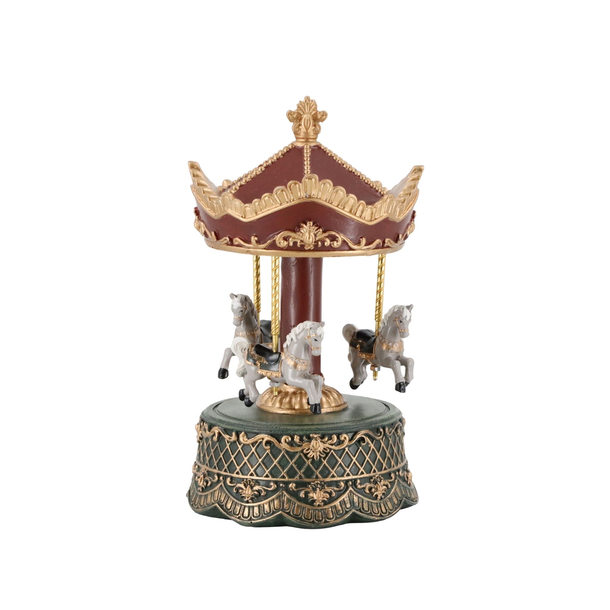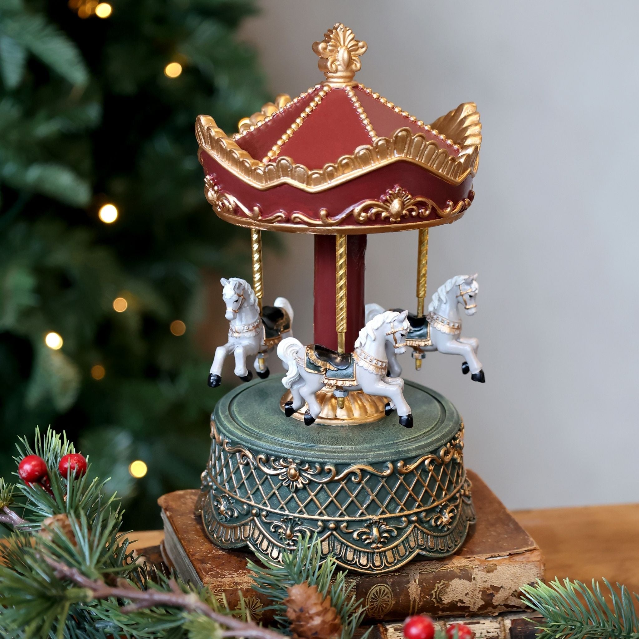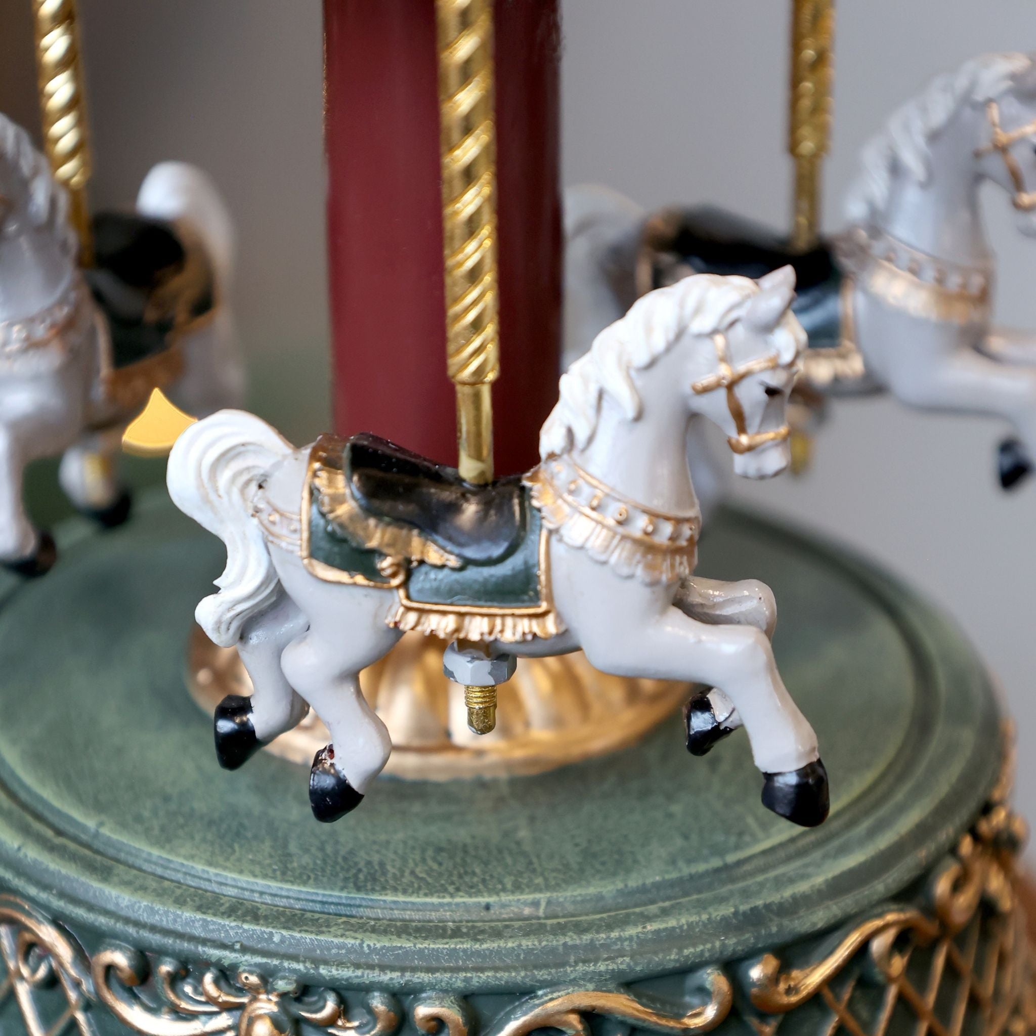Skab ægte julestemning i hjemmet med denne smukke julespilledåse i antikt design, der forestiller en klassisk karrusel med hvide heste der drejer roligt rundt, mens en fin julemelodi spiller.