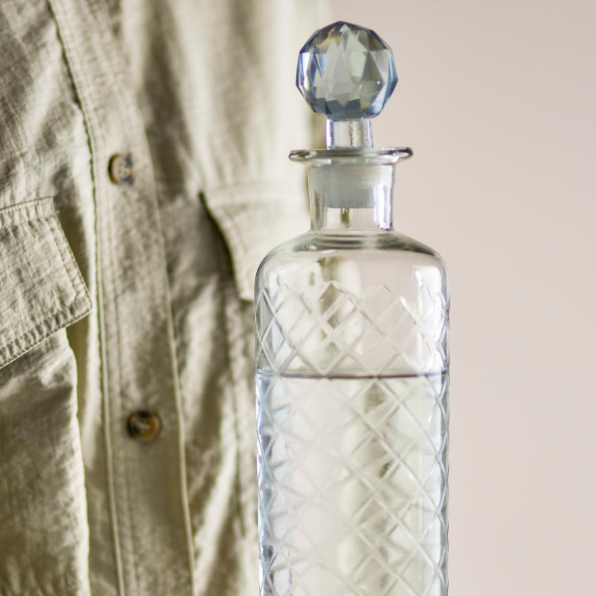Die Karaffe von Bloomingville besteht aus klarem Glas mit einem wunderschönen geschnitzten Muster, das ihr ein elegantes und klassisches Aussehen verleiht.