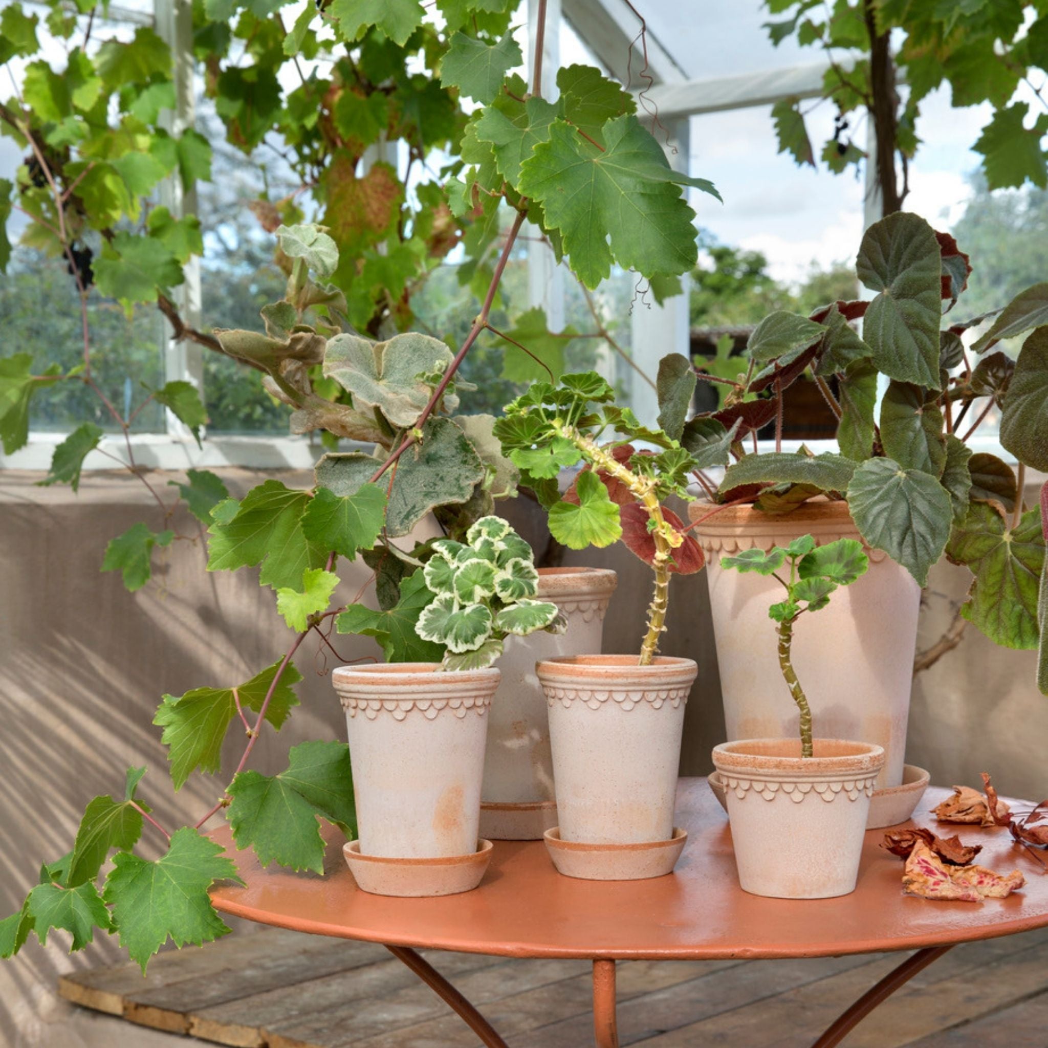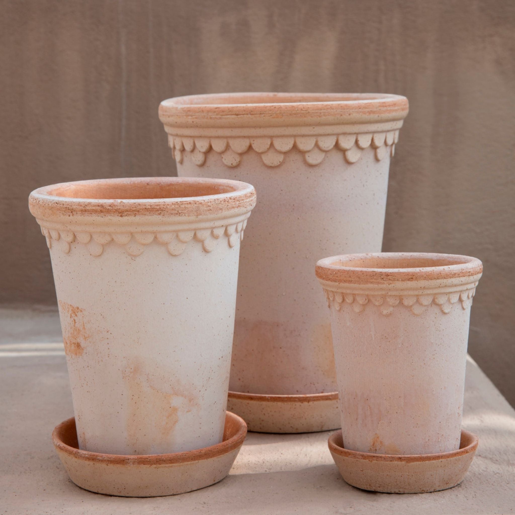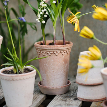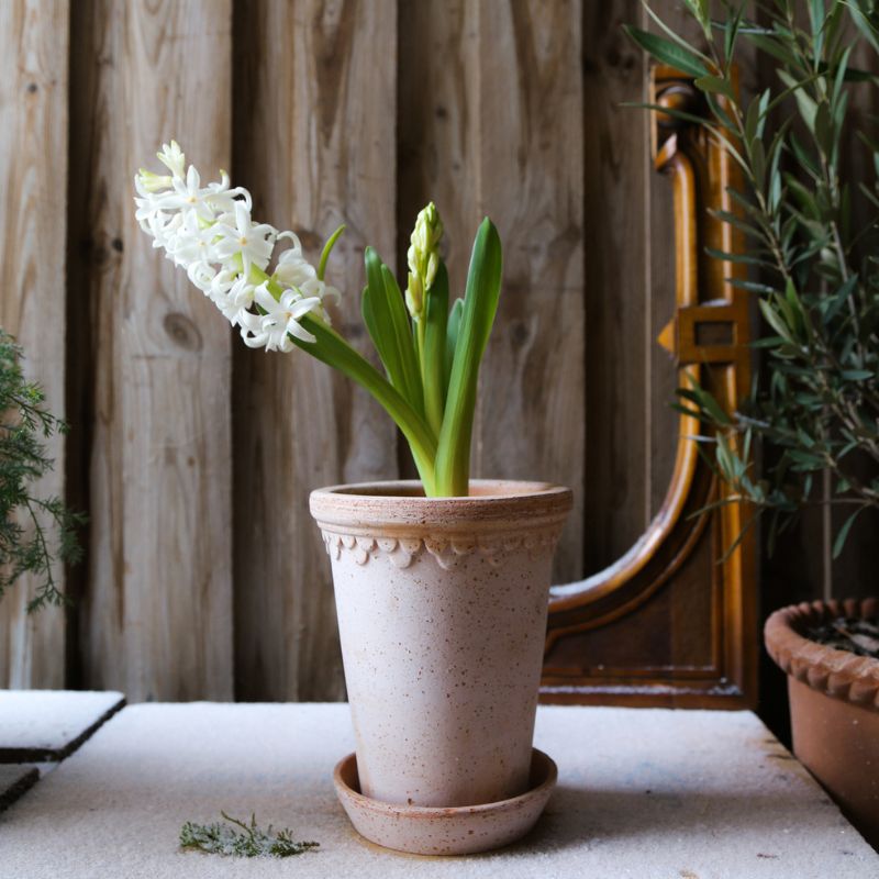 Schöne Blumentöpfe von Bergs Potter aus hochwertigem Ton aus Italien. Die Töpfe können sowohl drinnen als auch draußen aufgestellt werden, da der Ton frostbeständig ist. Die Töpfe sind nicht glasiert, werden aber mit der Zeit schöner und erhalten mehr Patina. Ein schöner Untersetzer ist im Lieferumfang enthalten.