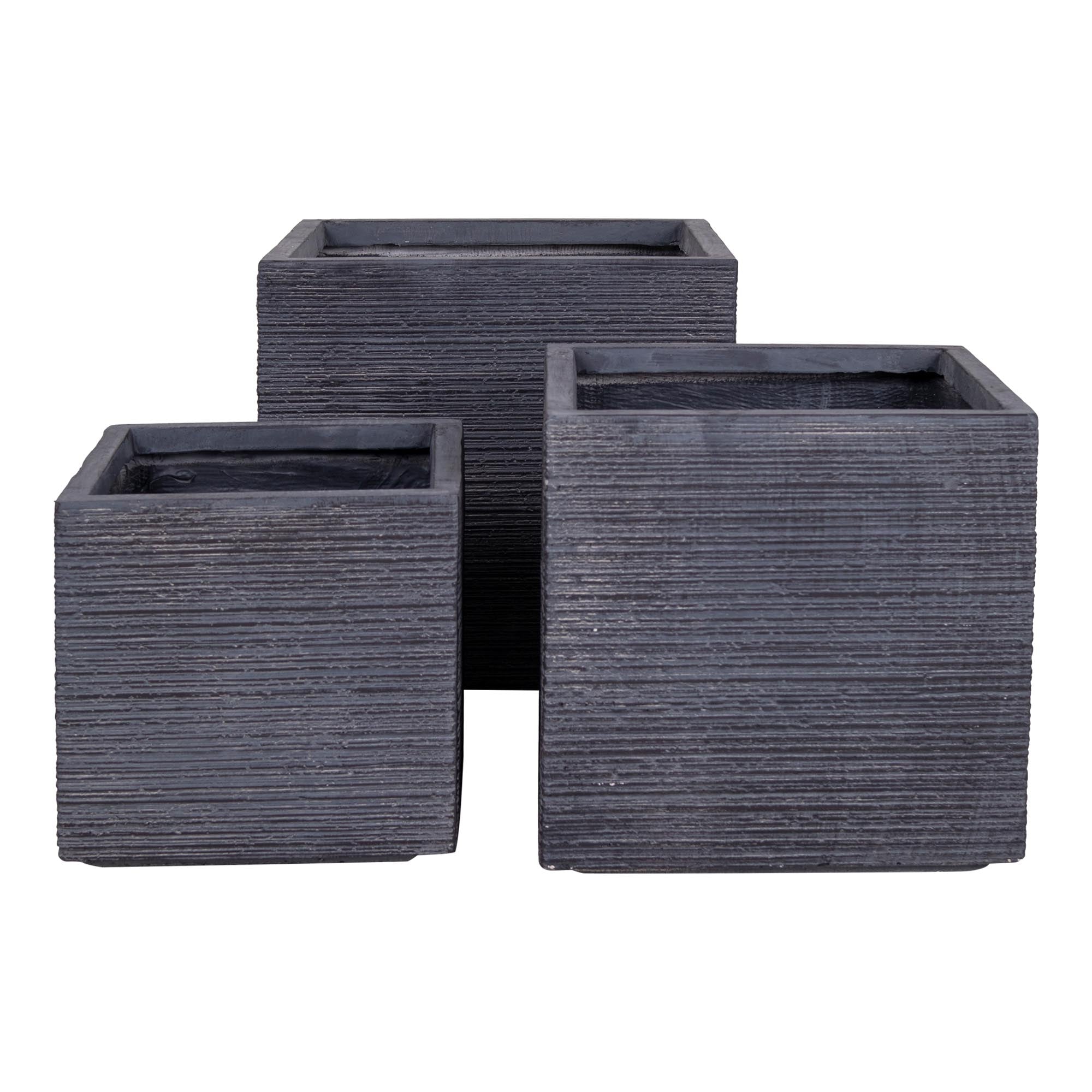 Quadratische Blumentöpfe aus grauem Fiberclay mit Struktur. Das Topfset besteht aus drei Teilen in verschiedenen Größen - Ø/H 27/25 - 32/32 - 38/36 - 44/44. Die Töpfe bestehen aus Fiberclay, sind dadurch frostsicher und können ganzjährig im Freien stehen.