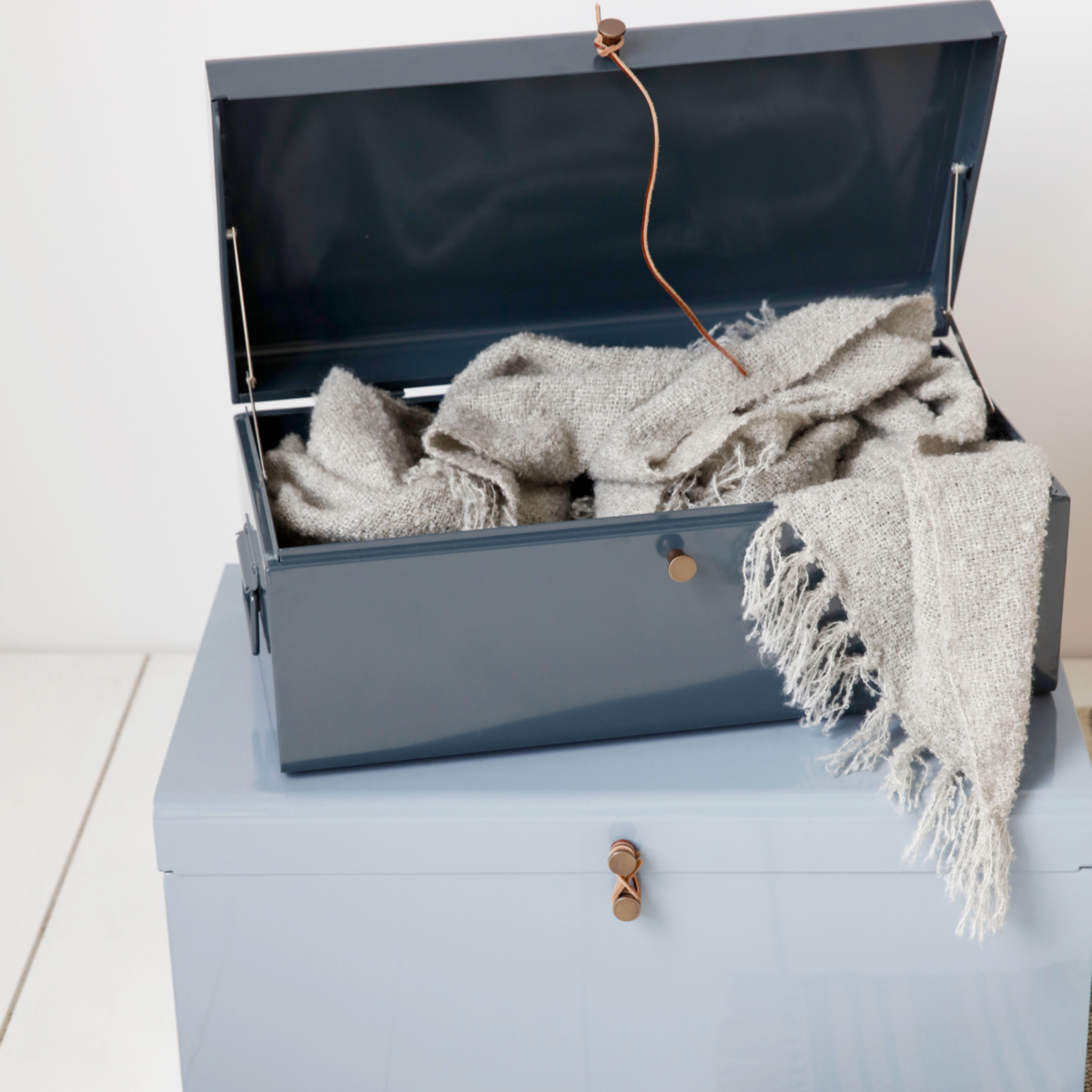Behalten Sie den Überblick über Ihre kleinen Gegenstände mit Aufbewahrungsboxen aus Metall in Beige/Rosa oder Blautönen.