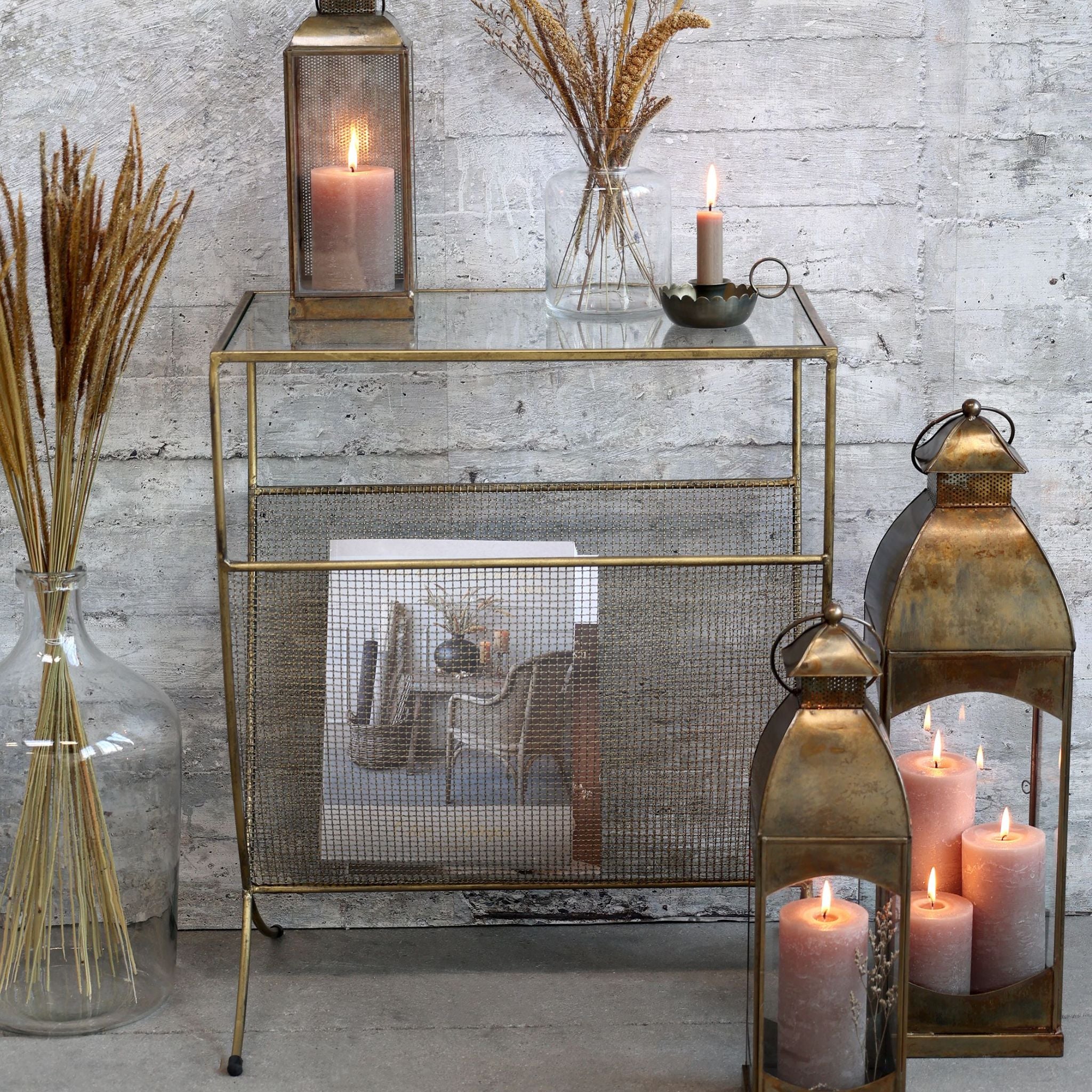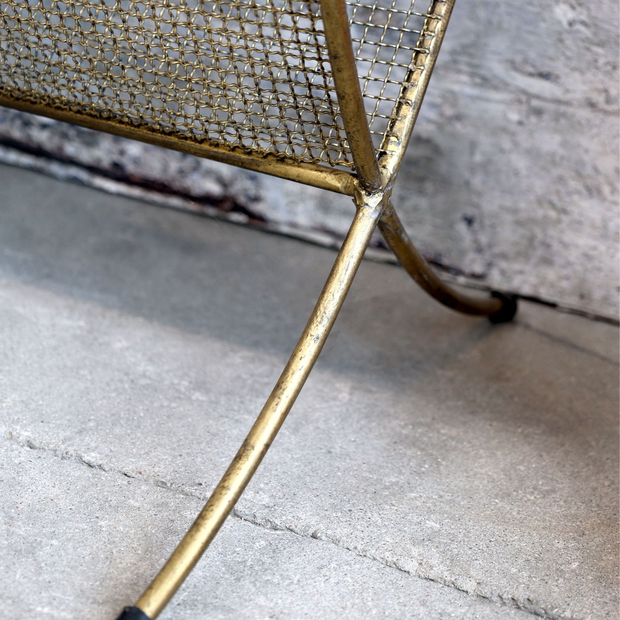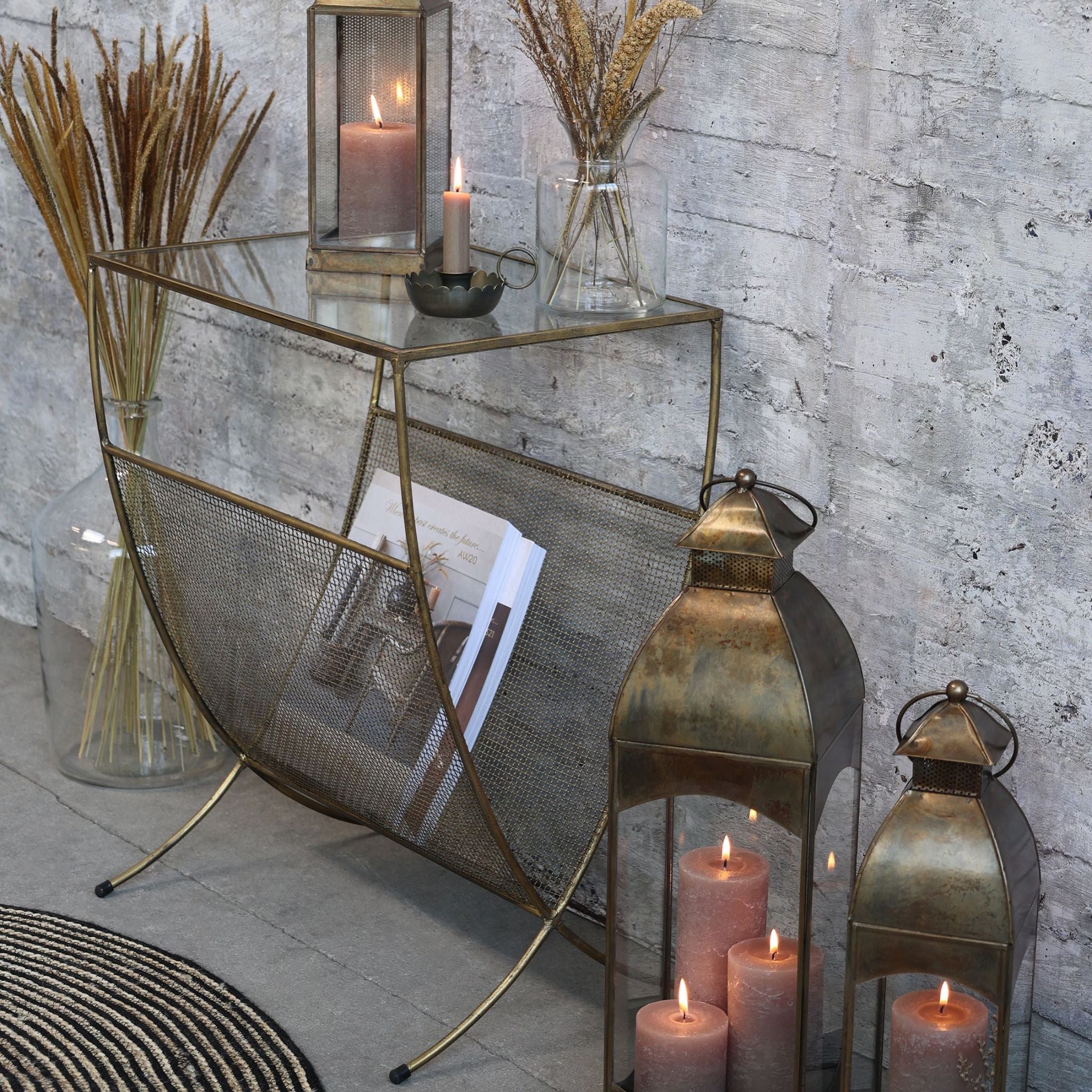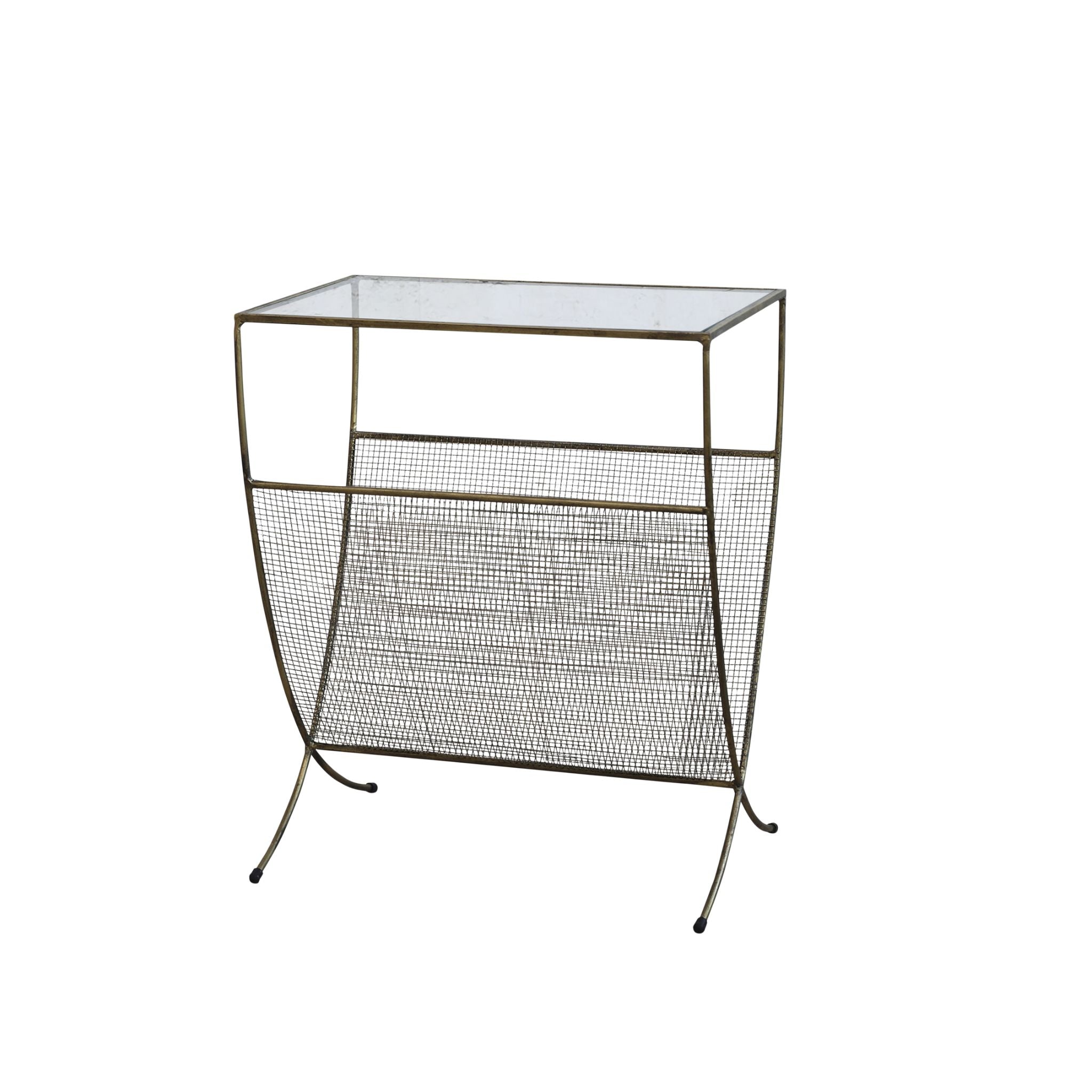 Schöner Zeitschriftenhalter kombiniert praktische Aufbewahrung und stilvolles Design. Hergestellt aus metallfarbenem Antikmessing mit einer Glasplatte, sodass der Zeitschriftenhalter auch als kleiner Beistelltisch fungiert.