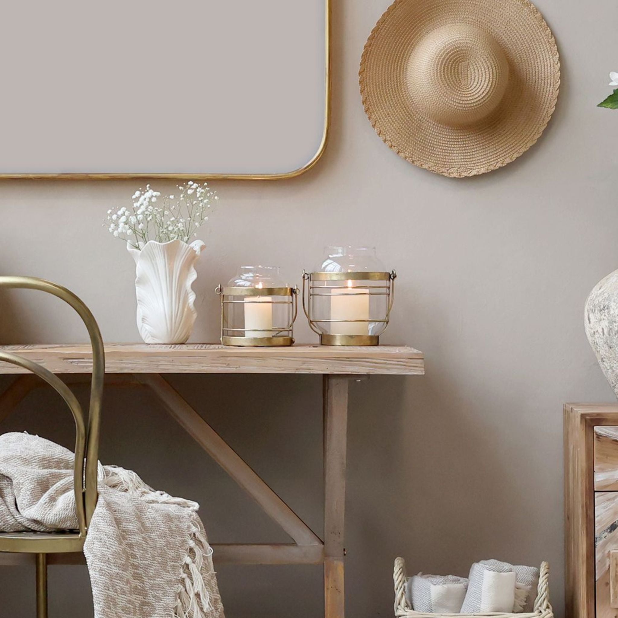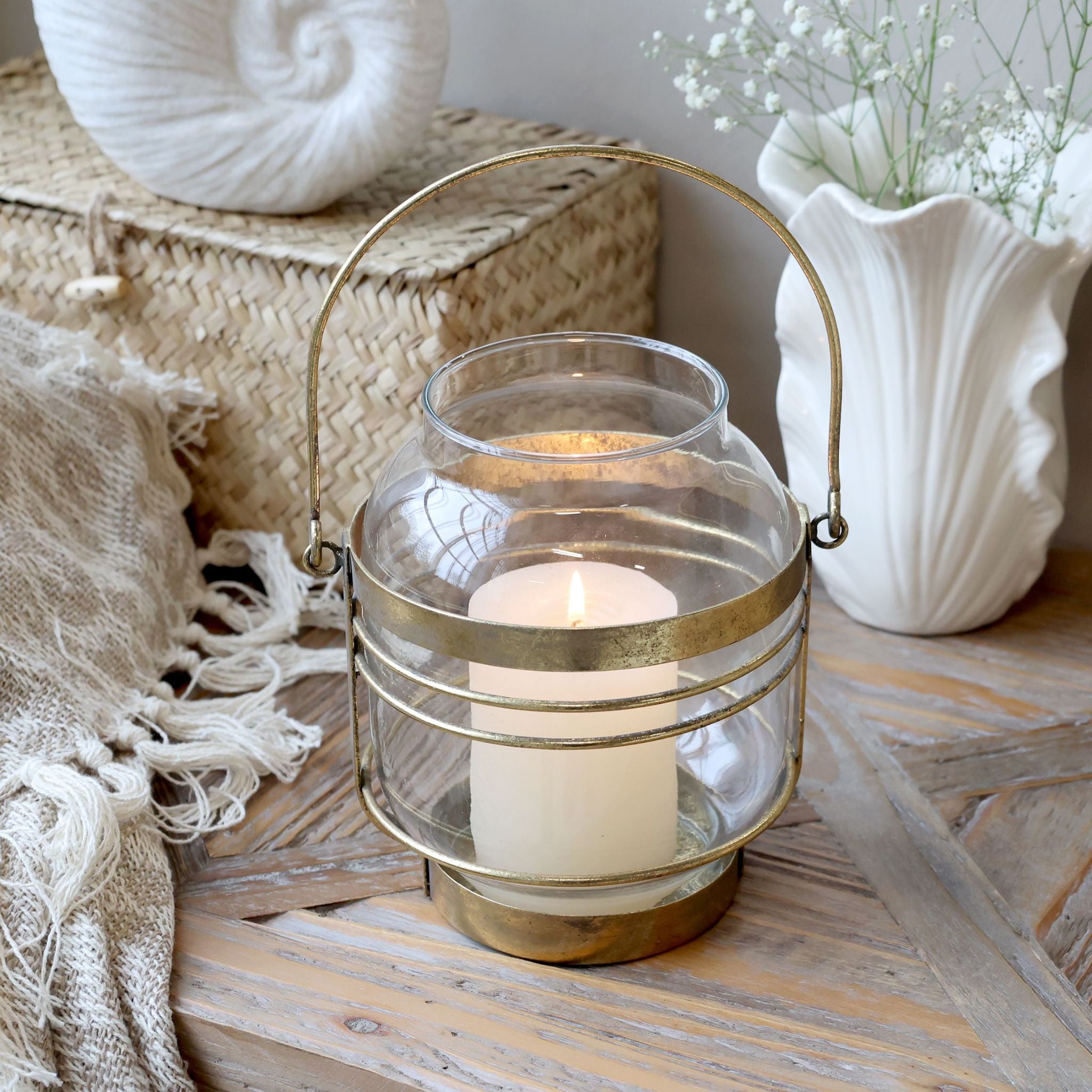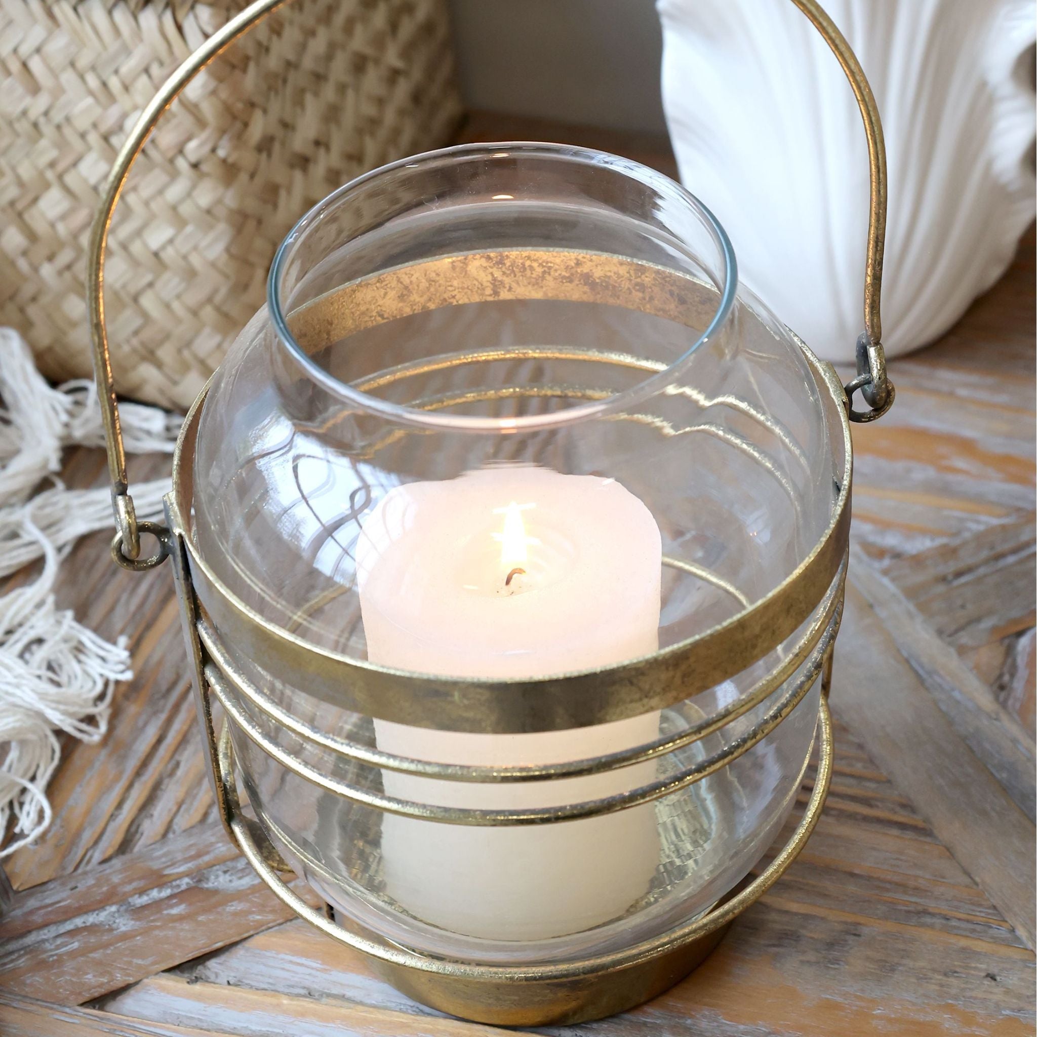 Schaffen Sie Atmosphäre und Eleganz mit diesen wunderschönen Windlichtern von Chic Antique. Die Laternen bestehen aus Glas und Eisen, wobei das antikmessingfarbene Metall einen exklusiven und zeitlosen Ausdruck verleiht. Das schlichte Design mit klaren Linien und warmen Tönen macht sie perfekt für klassische und moderne Einrichtungen.