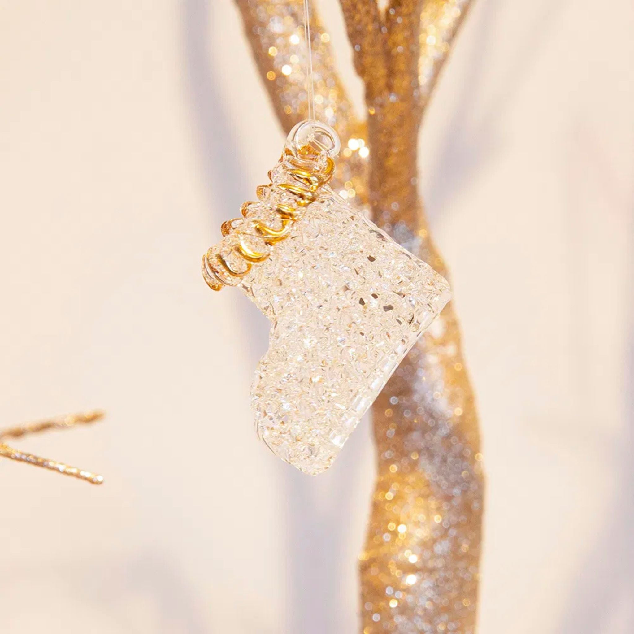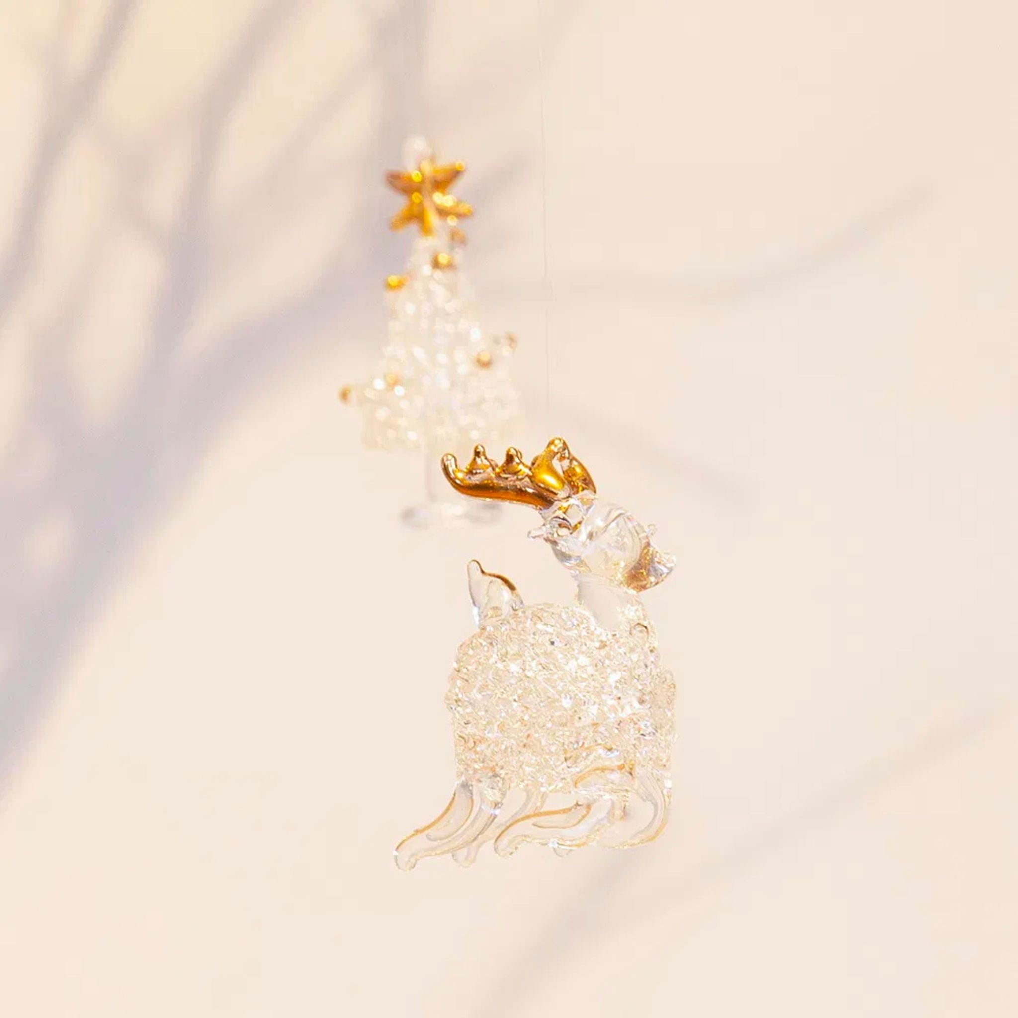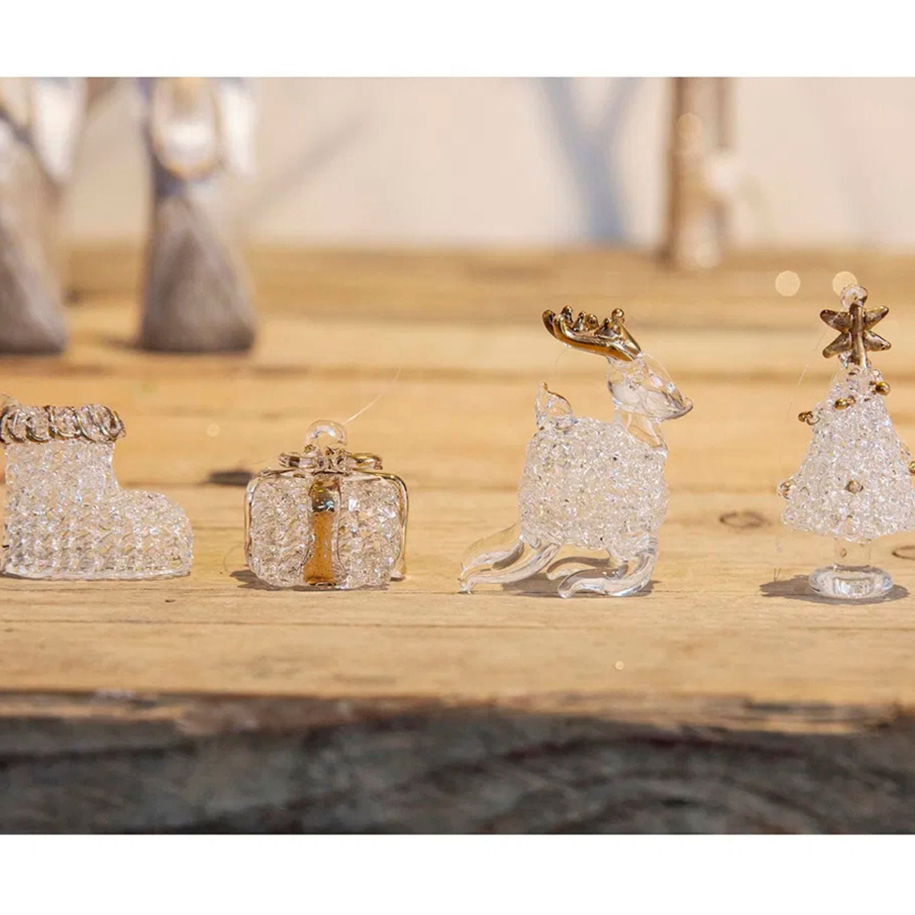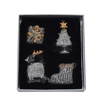 Niedliche Glasaufhänger für den Weihnachtsbaum. Das klare Glas verleiht ihnen ein kristallähnliches Aussehen. Jedes Set enthält 4 Teile, die einen Weihnachtsbaum, ein Rentier, ein Geschenk und einen Stiefel darstellen.