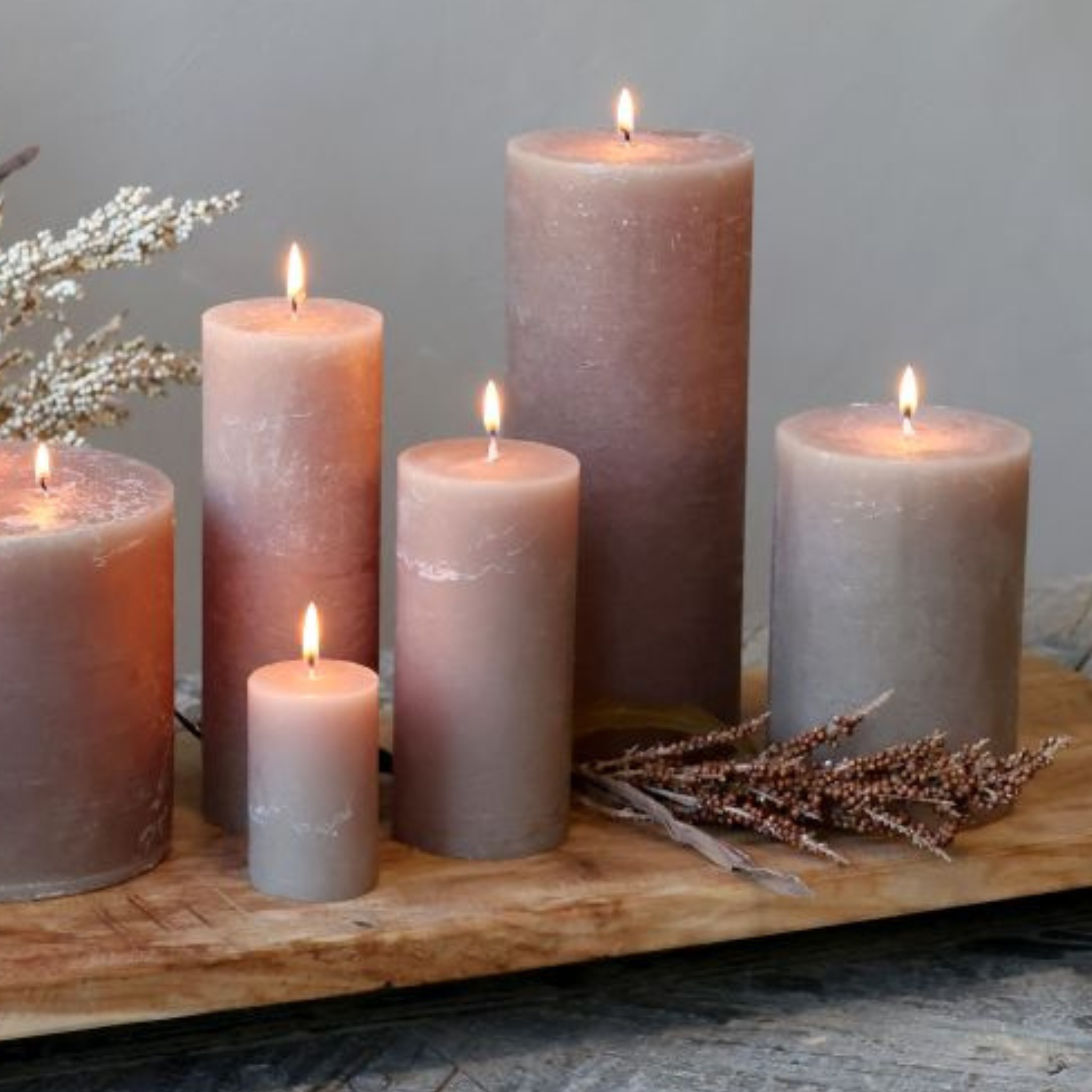 Wunderschöne, dekorative und rustikale Blockkerzen in einer schönen Leinenfarbe von Chic Antique.