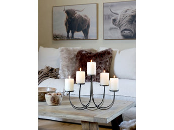 Dieser Kerzenhalter ist für die Aufnahme von fünf Blockkerzen konzipiert und sorgt so für einen beeindruckenden optischen Effekt. Der strukturierte Aufbau der Leuchtenhalter sorgt für eine harmonische Balance und sorgt dafür, dass das Licht eine einladende Atmosphäre im Raum schafft.
