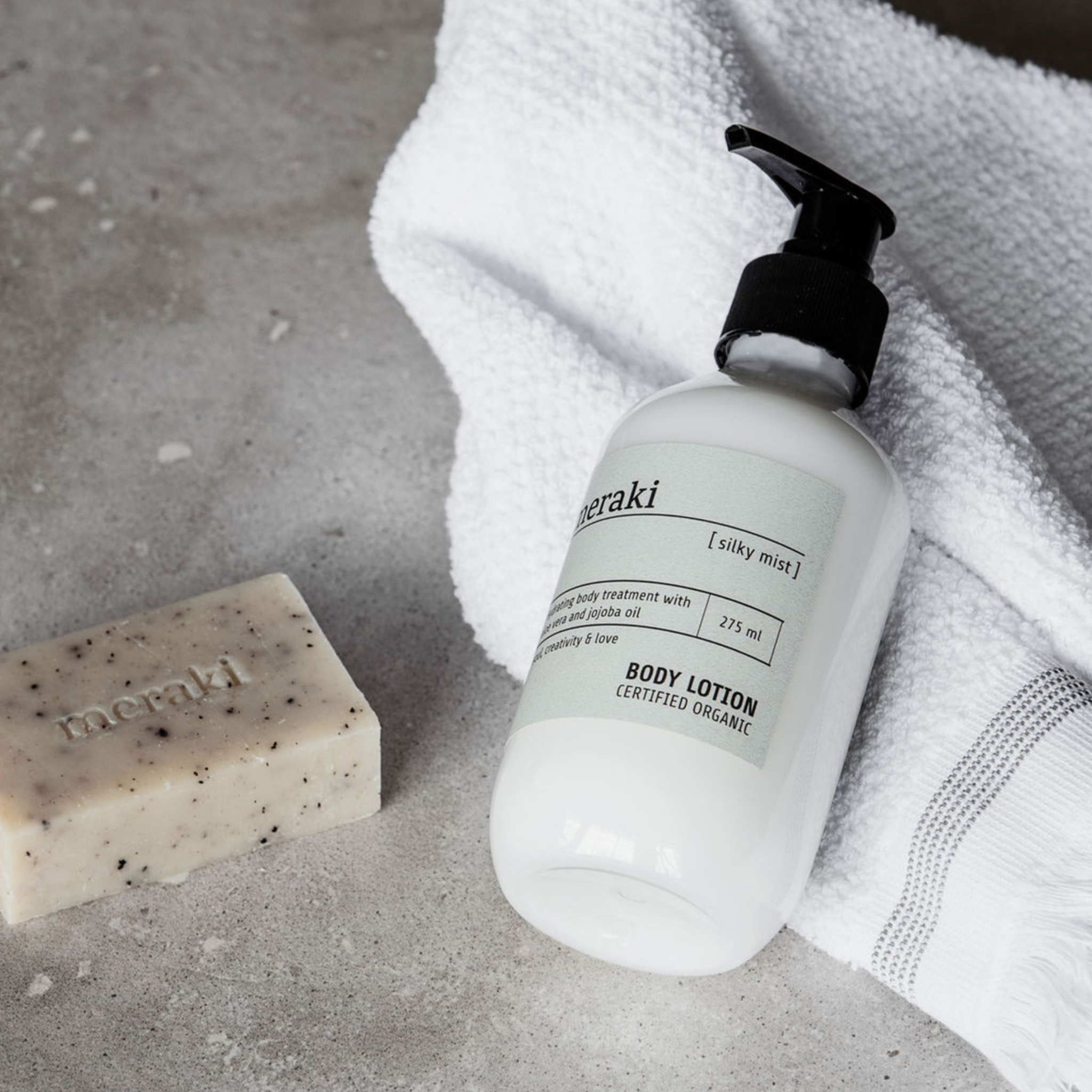 Erhalten Sie weiche, gepflegte und gut mit Feuchtigkeit versorgte Haut mit dieser Silky Mist-Körperlotion von Meraki. Sein Gehalt an Bio-Inhaltsstoffen wie Aloe Vera und insbesondere Jojobaöl spendet Nährstoffe und beugt dem Austrocknen vor. Kakaobutter pflegt auch die Haut. Zertifiziertes COSMOS-Bio-Produkt von Ecocert.