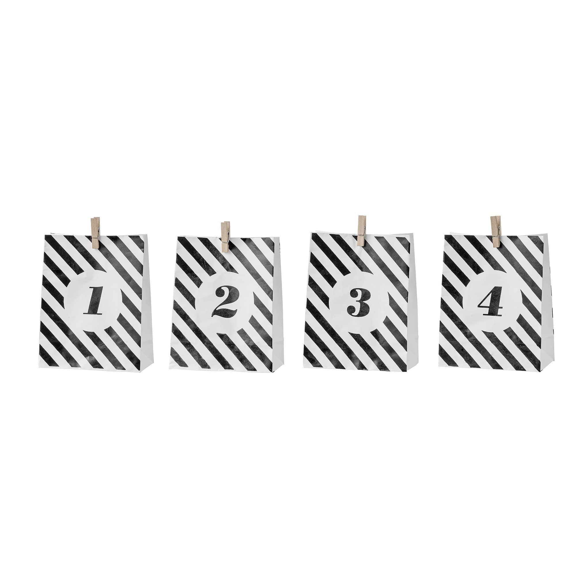 Kleine schwarz-weiß gestreifte Papiertüten für Adventsgeschenke.