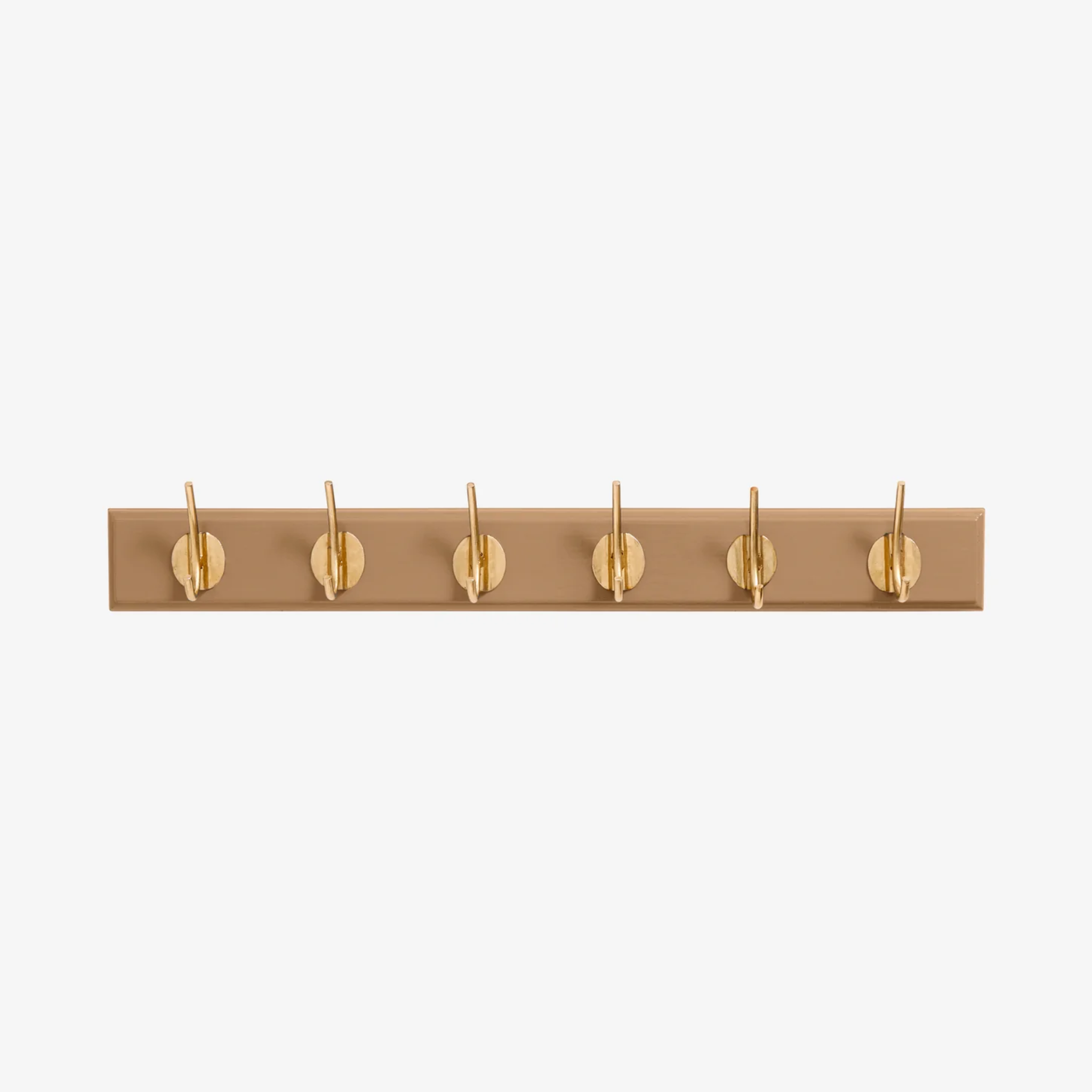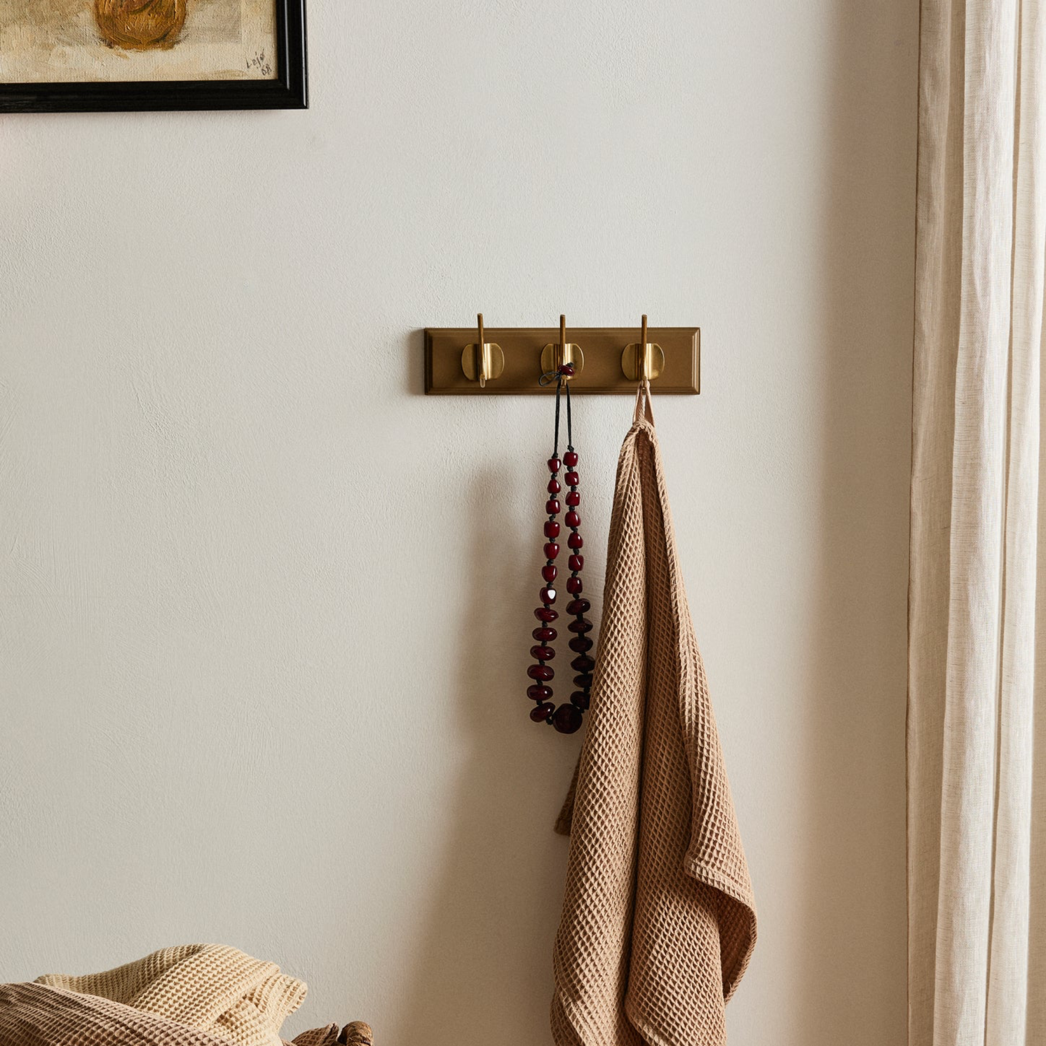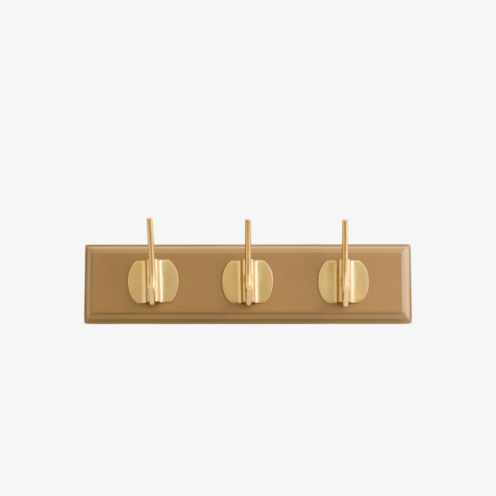 EDGY ist eine stilvolle und funktionale Garderobe mit drei massiven Eisenhaken, montiert auf einem dunkelbraunen Sockel. Die Kombination aus warmer Holzoptik und goldenen Details schafft einen eleganten und modernen Look, der perfekt in Flur, Schlafzimmer oder Kleiderschrank passt.