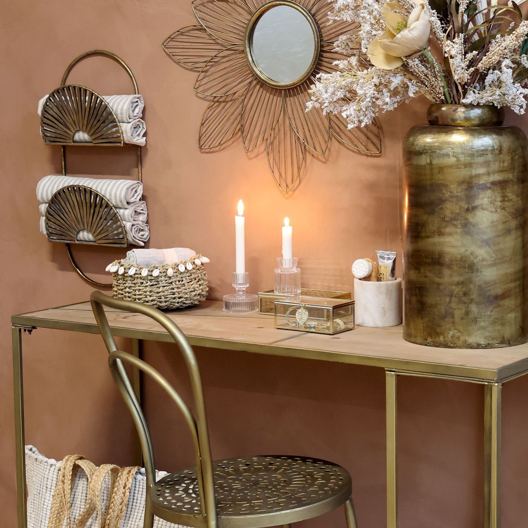 Dieses elegante Regal von Chic Antique in wunderschönem Antikmessing-Finish verleiht Ihrem Zuhause Wärme und Charme. Das Regal vereint praktische Aufbewahrung mit dekorativem Design und verfügt über feine Details, die es zu einem einzigartigen Blickfang in Ihrer Einrichtung machen.