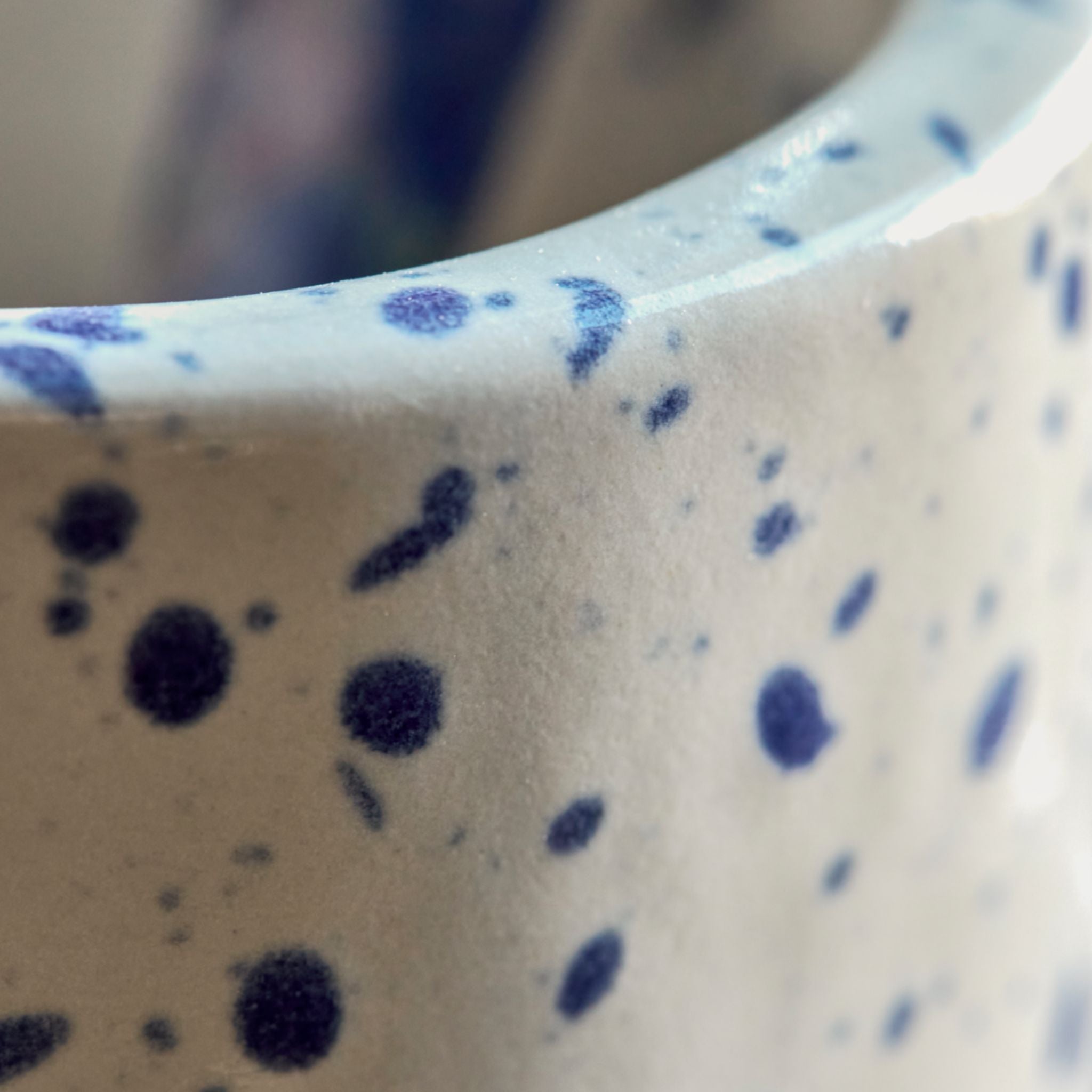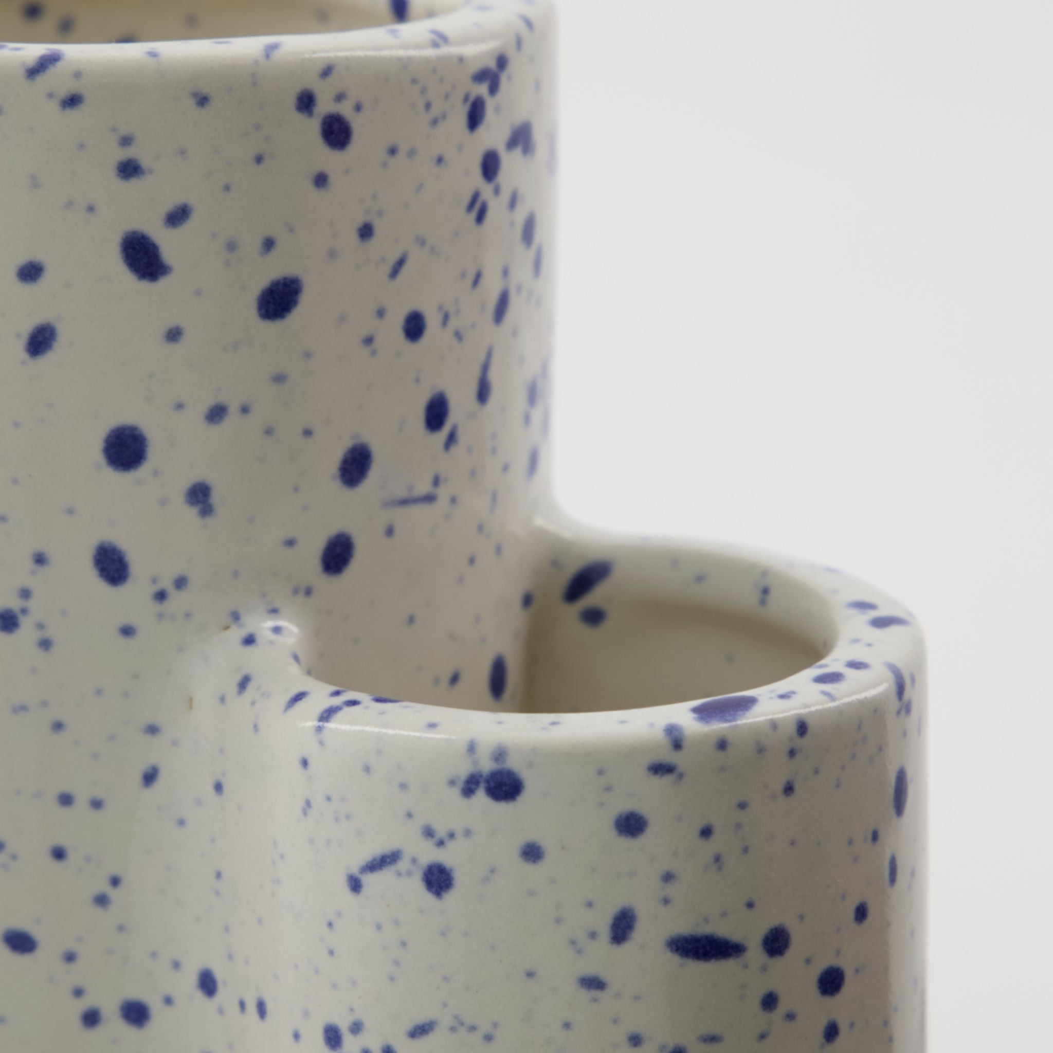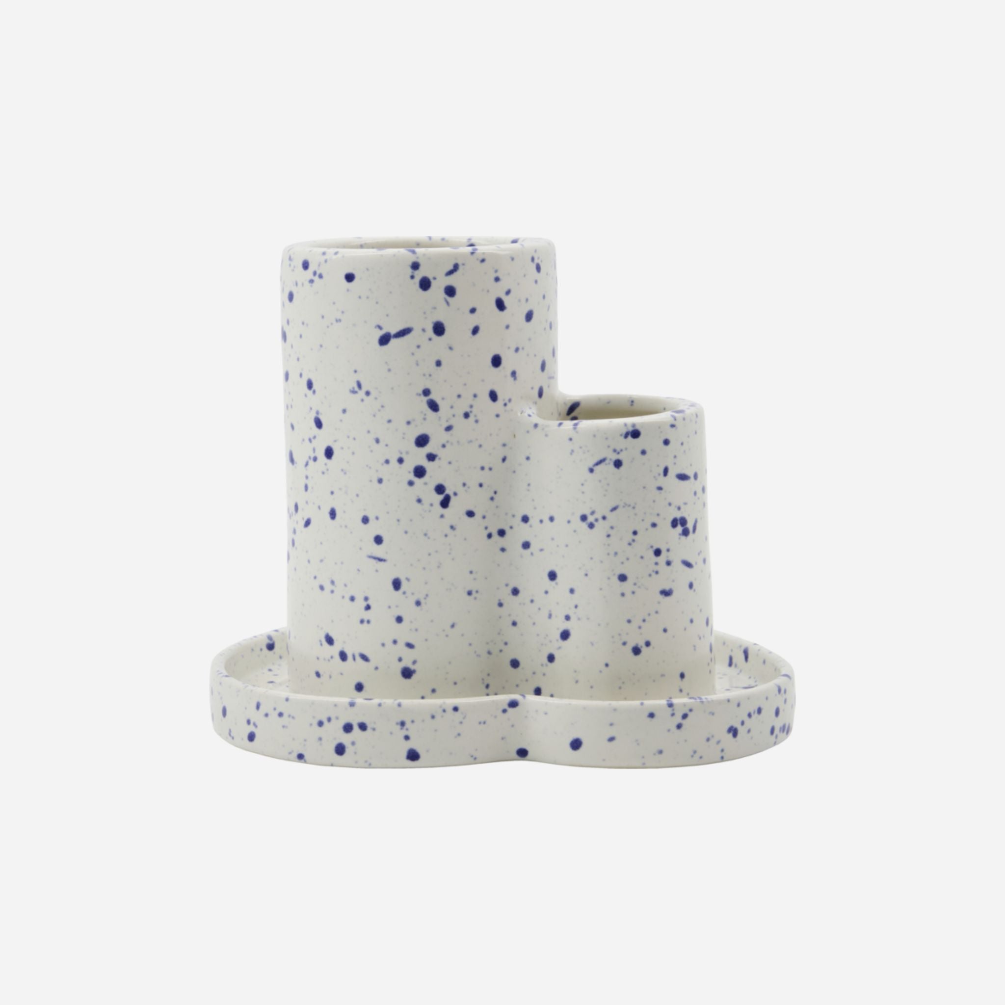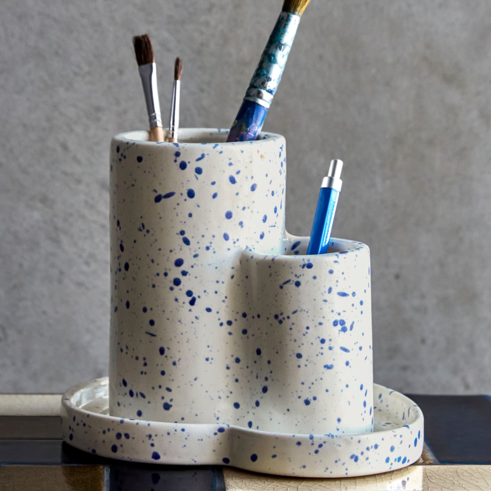 Dieser einzigartige Organizer, handgefertigt aus Keramik, vereint Funktionalität mit stilvollem Design. Der cremefarbene Sockel ist mit einem wunderschönen blauen Spritzmuster verziert und verleiht Ihrem Homeoffice, Ihrer Küche oder Ihrem Wohnzimmer einen modernen Touch. Perfekt zur Aufbewahrung von Scheren, Stiften und Kleinigkeiten. Die beiden zylindrischen Halter in unterschiedlichen Größen bieten Flexibilität und einen eleganten Ausdruck.