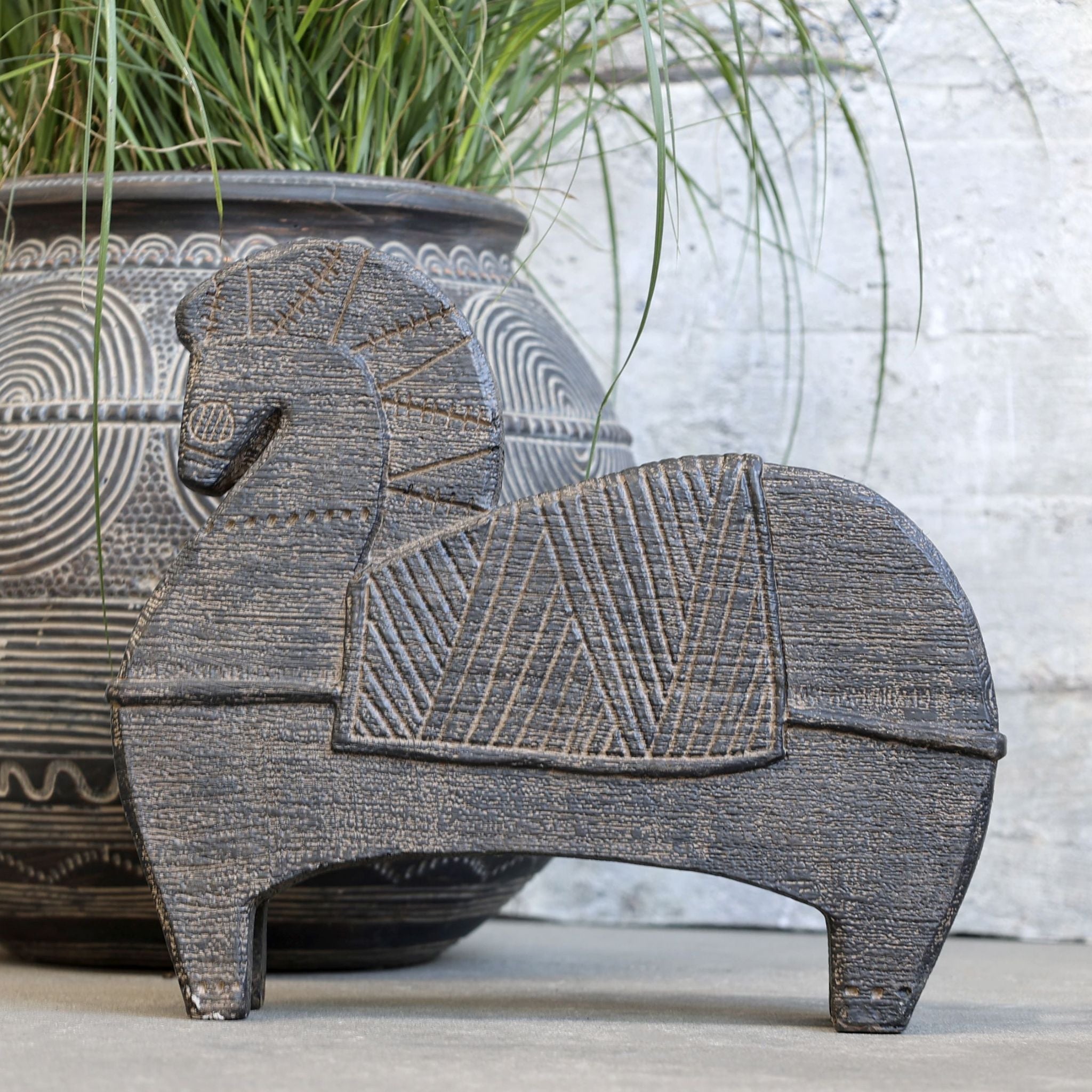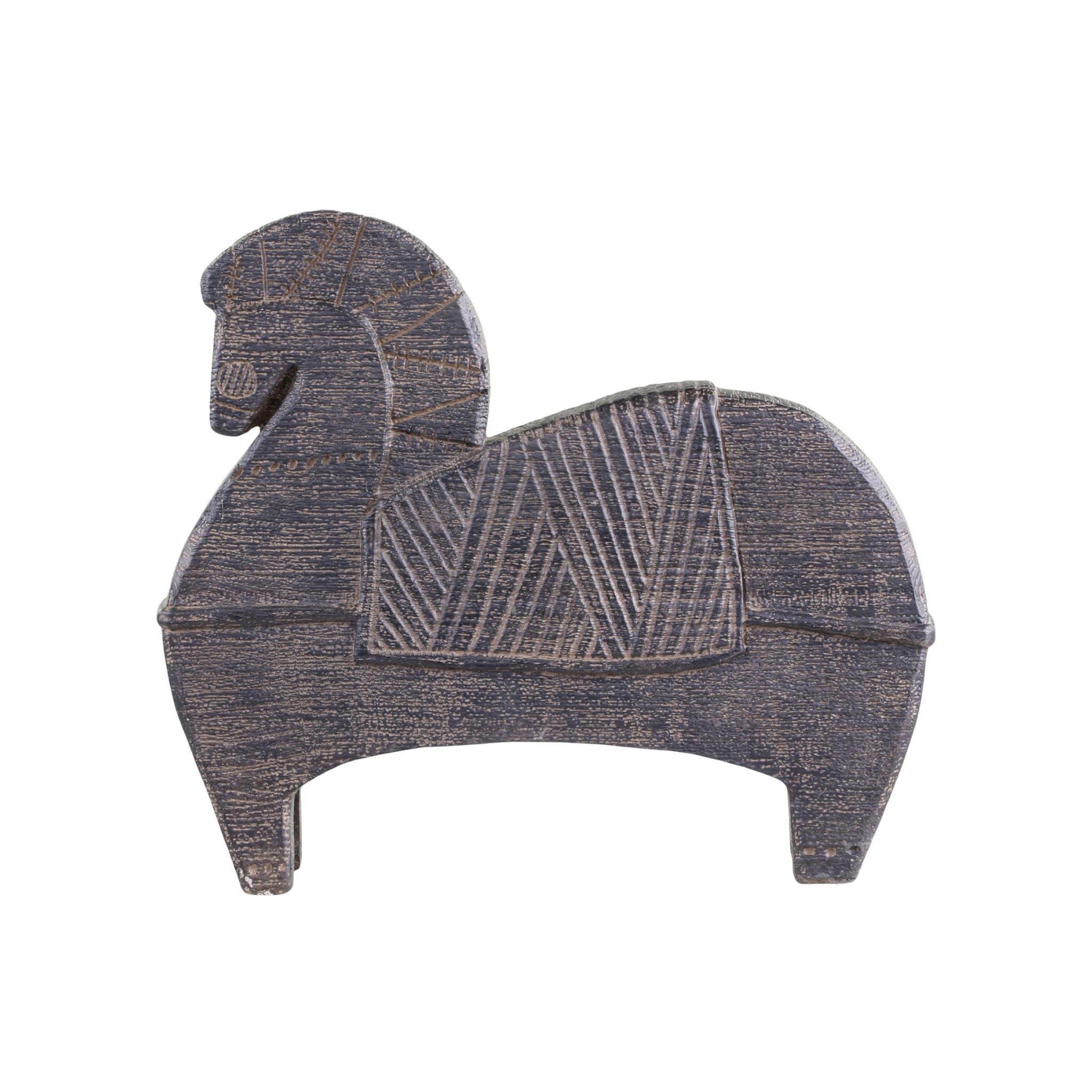 Schaffen Sie mit diesem wunderschönen Dekopferd eine stimmungsvolle und historische Atmosphäre in Ihrem Zuhause. Das Pferd ist von römischer Kunst und Symbolik inspiriert und verfügt über ein detailreiches geschnitztes Muster. Die antikbraune Farbe und die robuste Optik verleihen dem Pferd einen rustikalen und charaktervollen Ausdruck.