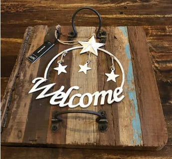 Auf dem Schild ist der Text „Willkommen“ in einer eleganten Schriftart aufgedruckt, der die Gäste mit Wärme und Freundlichkeit einlädt. Unter dem Text sind vier wunderschöne Sterne abgebildet, die ein willkommenes und bedeutungsvolles Erlebnis für Ihre Gäste symbolisieren.