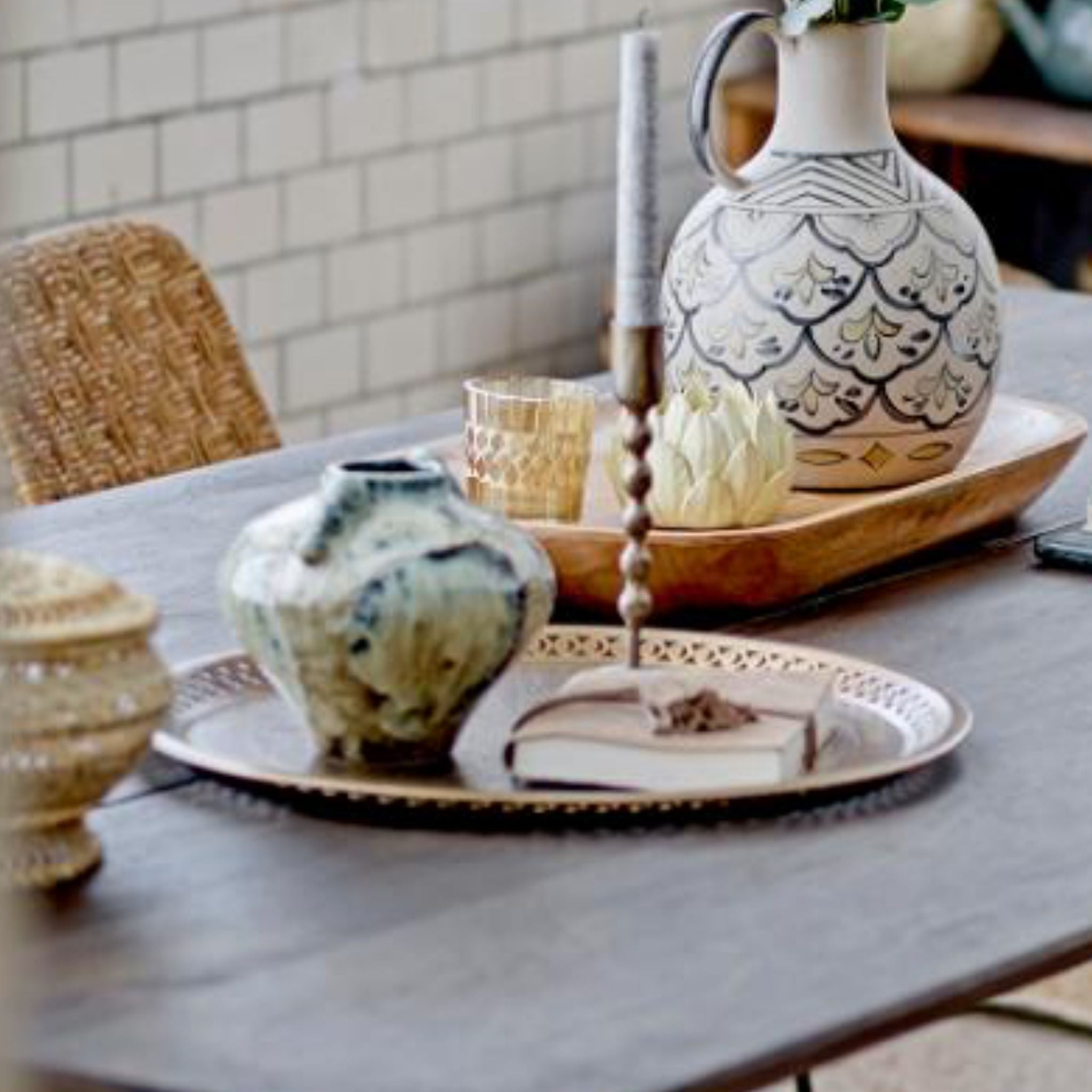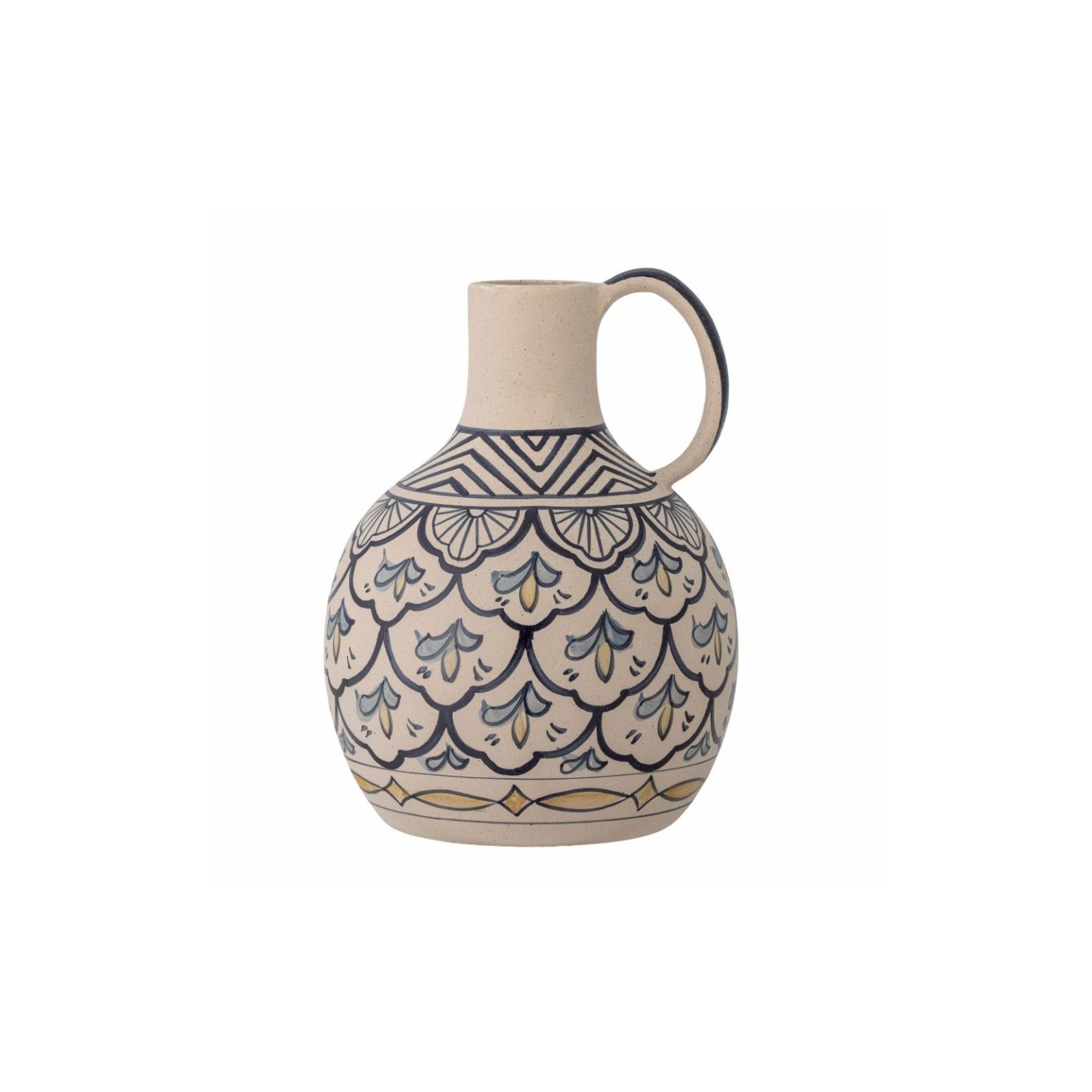 Die Nadya Vase von Bloomingville besteht aus wunderschönem Steingut mit Blautönen, die jedem Interieur einen ruhigen und stilvollen Ausdruck verleihen. Die Vase hat ein organisches, elegantes Design mit einem runden Henkel und einem dekorativen Muster, das sie zu einem dekorativen Blickfang macht.