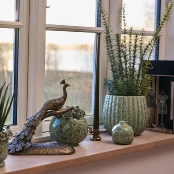 Schöne und romantische Keramikvase mit schöner grüner Glasur und Blumen am Rand.