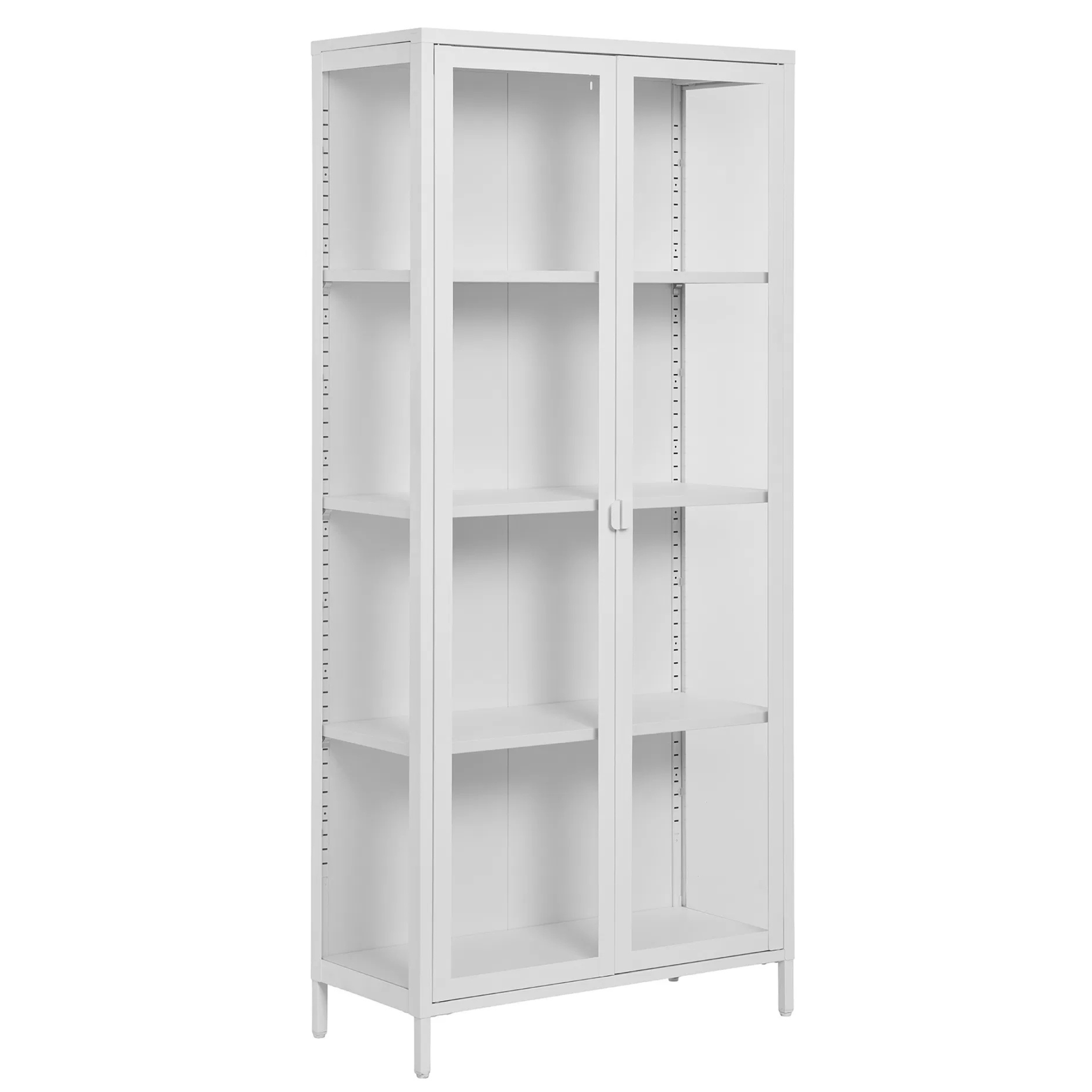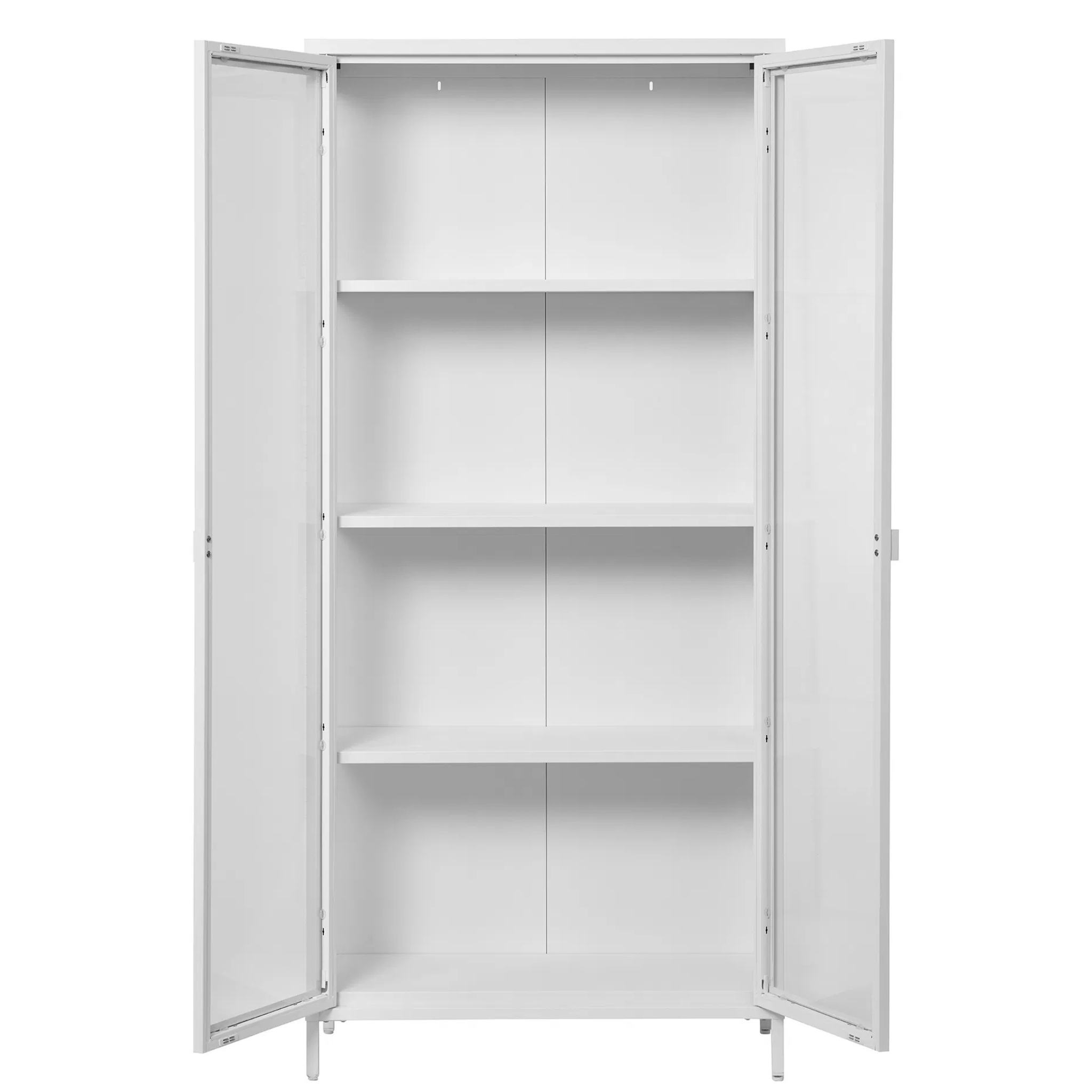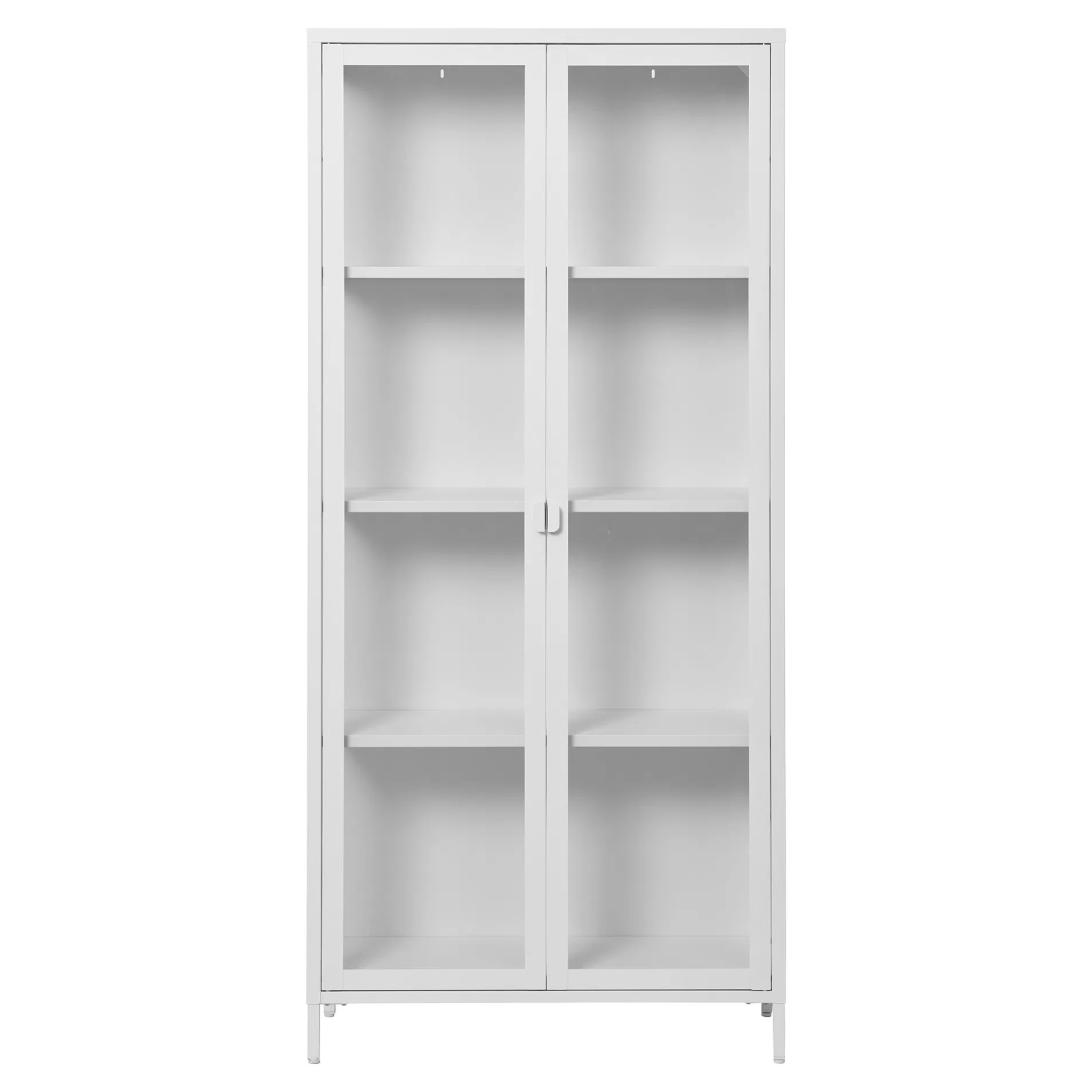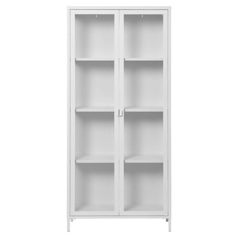 Der Schrank besteht aus weiß lackiertem Stahl mit Glastüren.