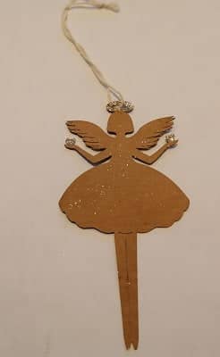 Der Heiligenschein des Engels ist mit feinem silbernen Glitzer verziert und in jeder Hand hält er einen silbernen Stern