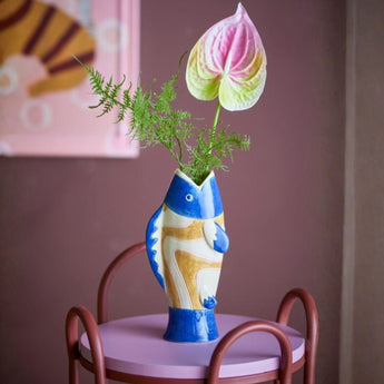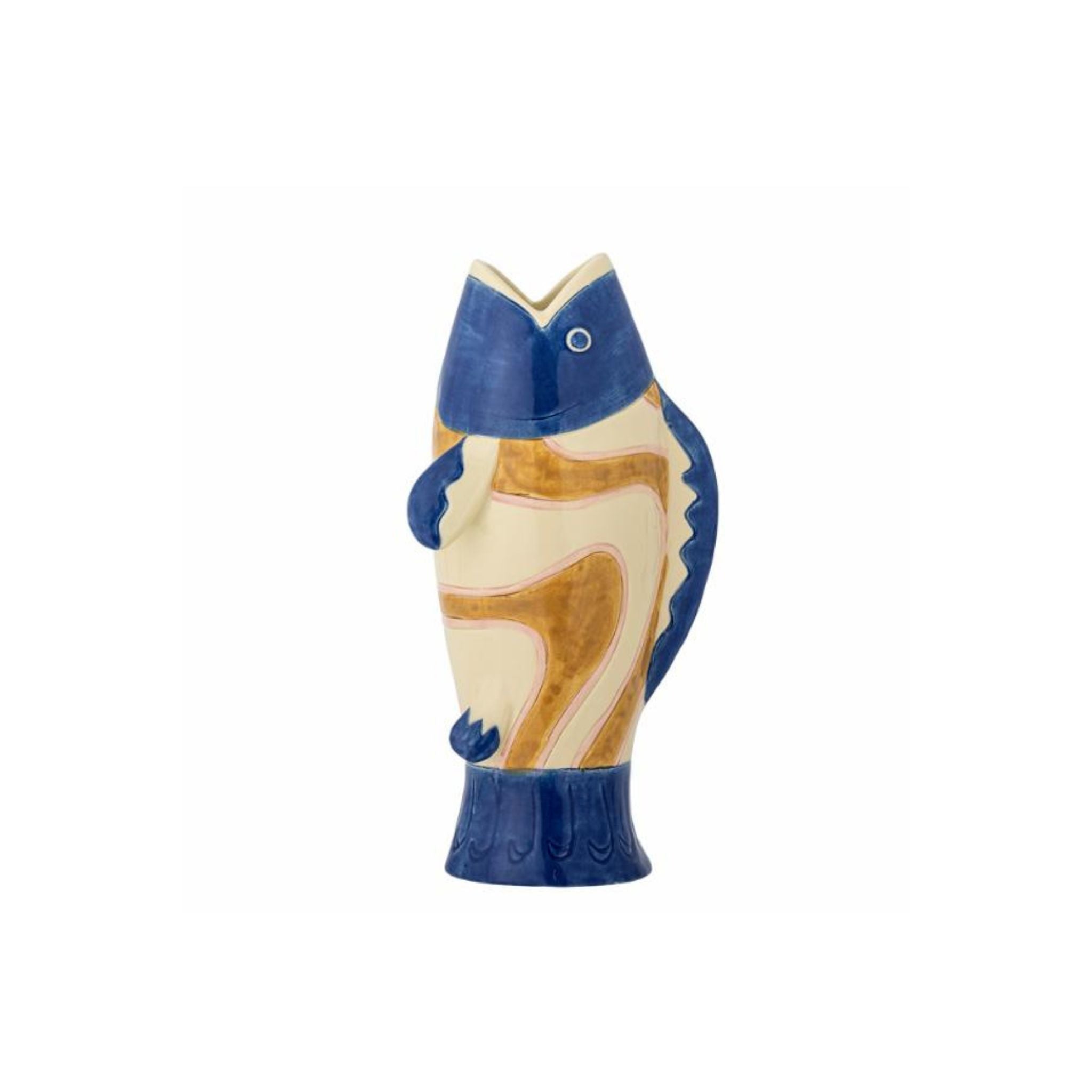 Oplev kunst og natur med denne håndmalede vase i stenstøj, formet som en fisk.
