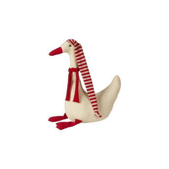 Schaffen Sie Weihnachtsstimmung mit dieser bezaubernden Stoffgans mit rot gestreifter Mütze und rotem Schal.