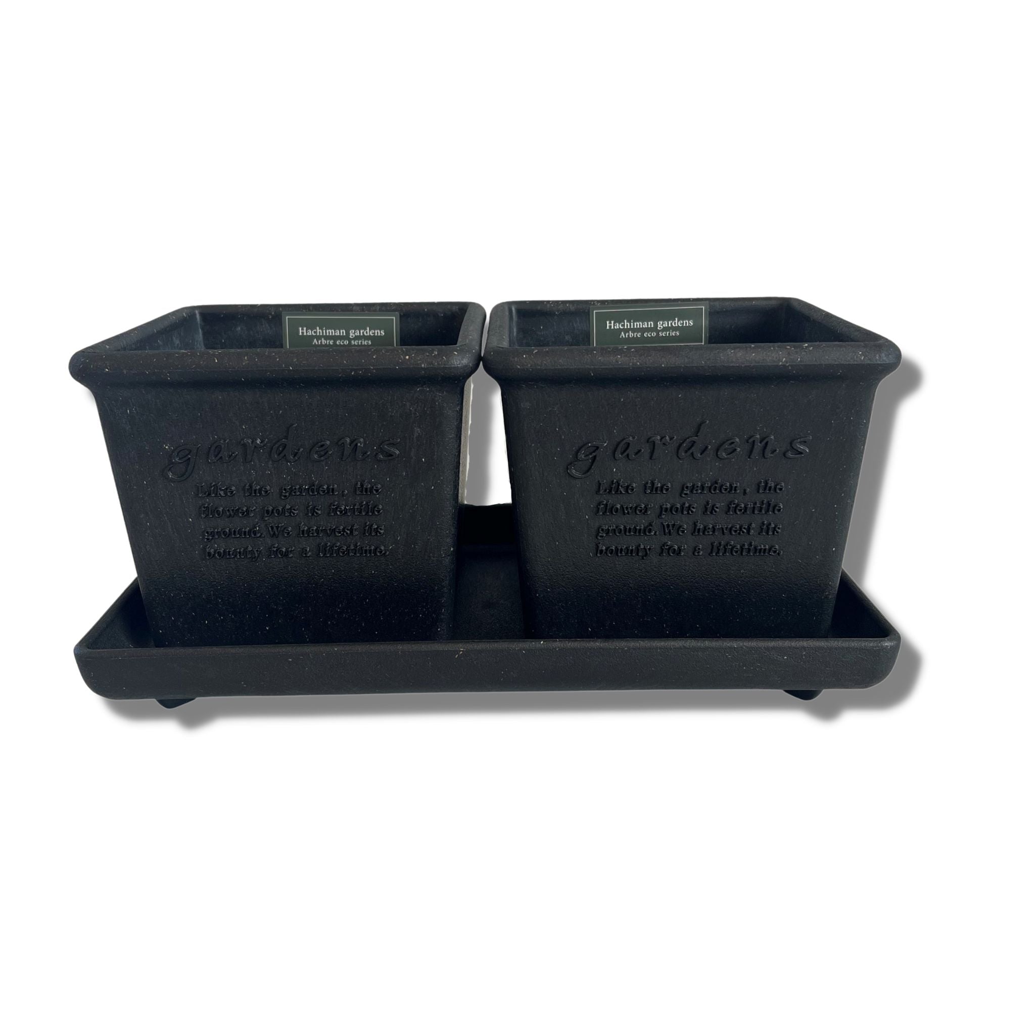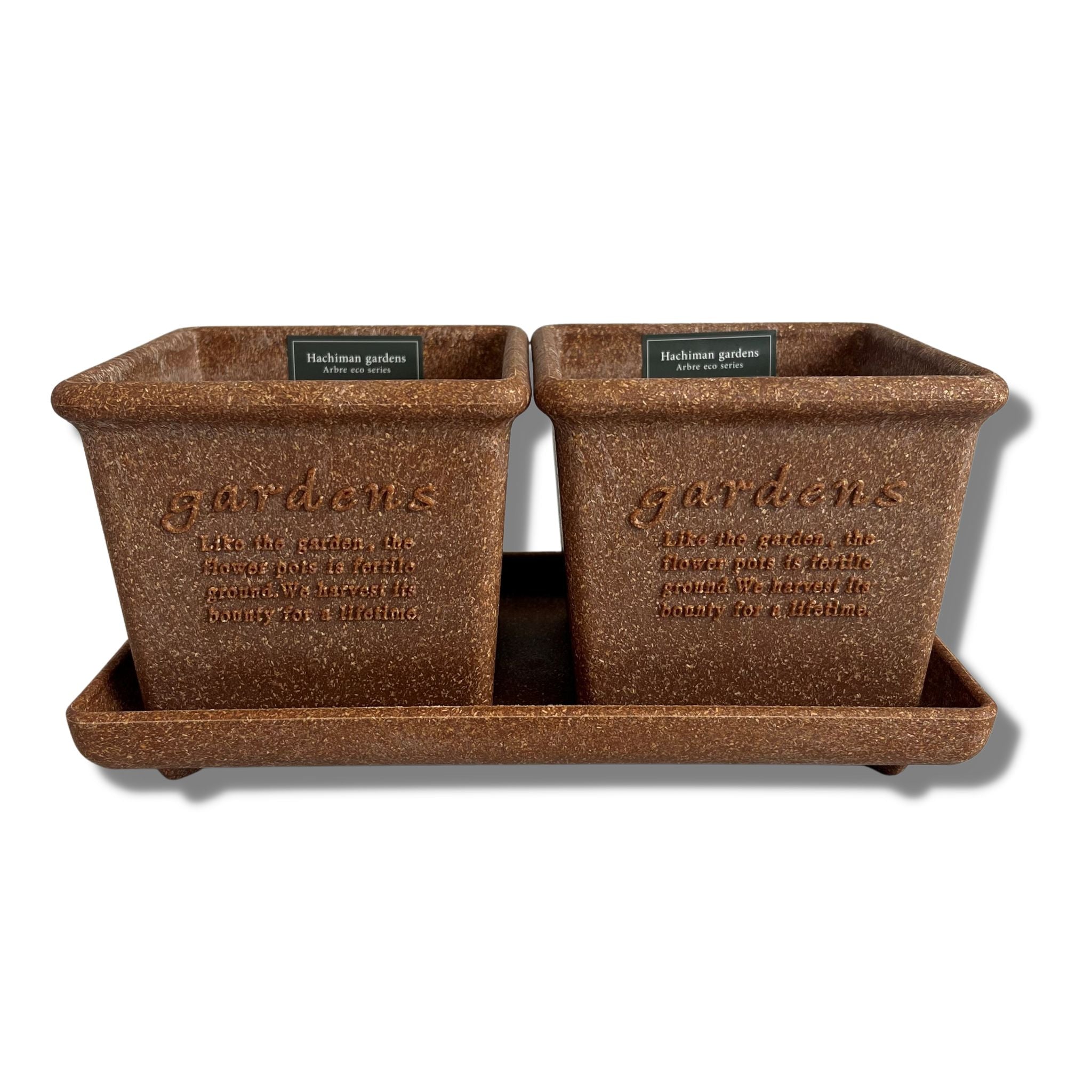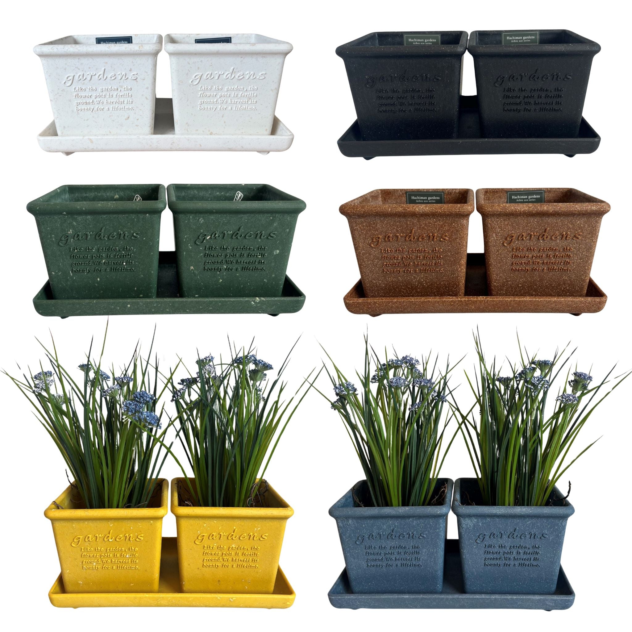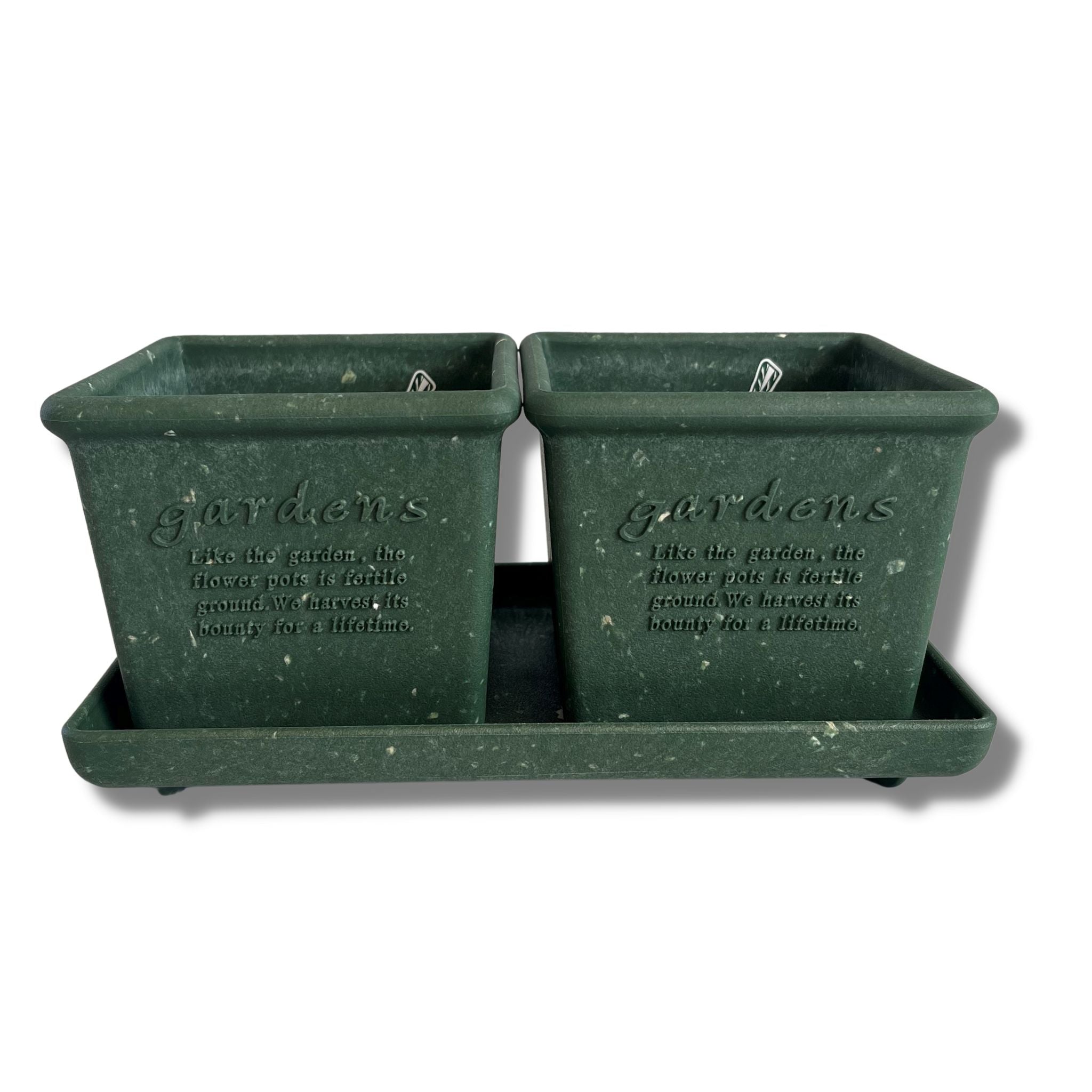 Flotte urtepotteskjulere produceret af 50% polypropylen PP (den gode plast) og 50% overskudstræ/papir. Dette sæt består af 2 firkantede potter med en underskål til.