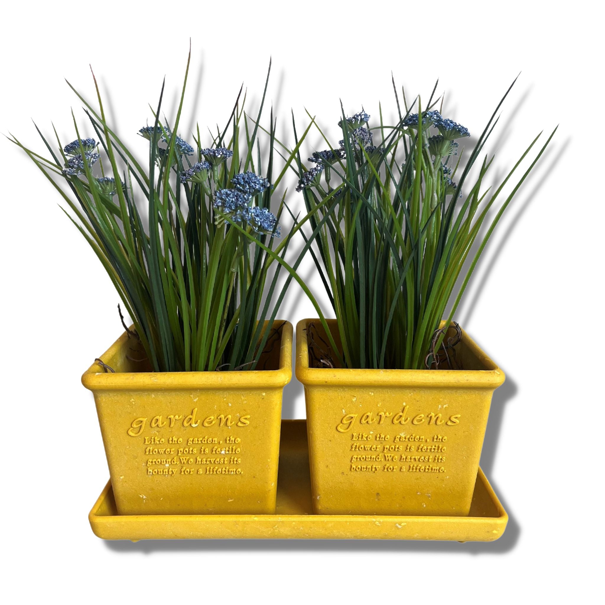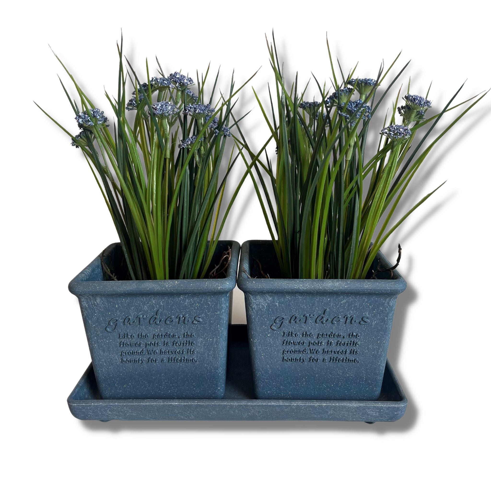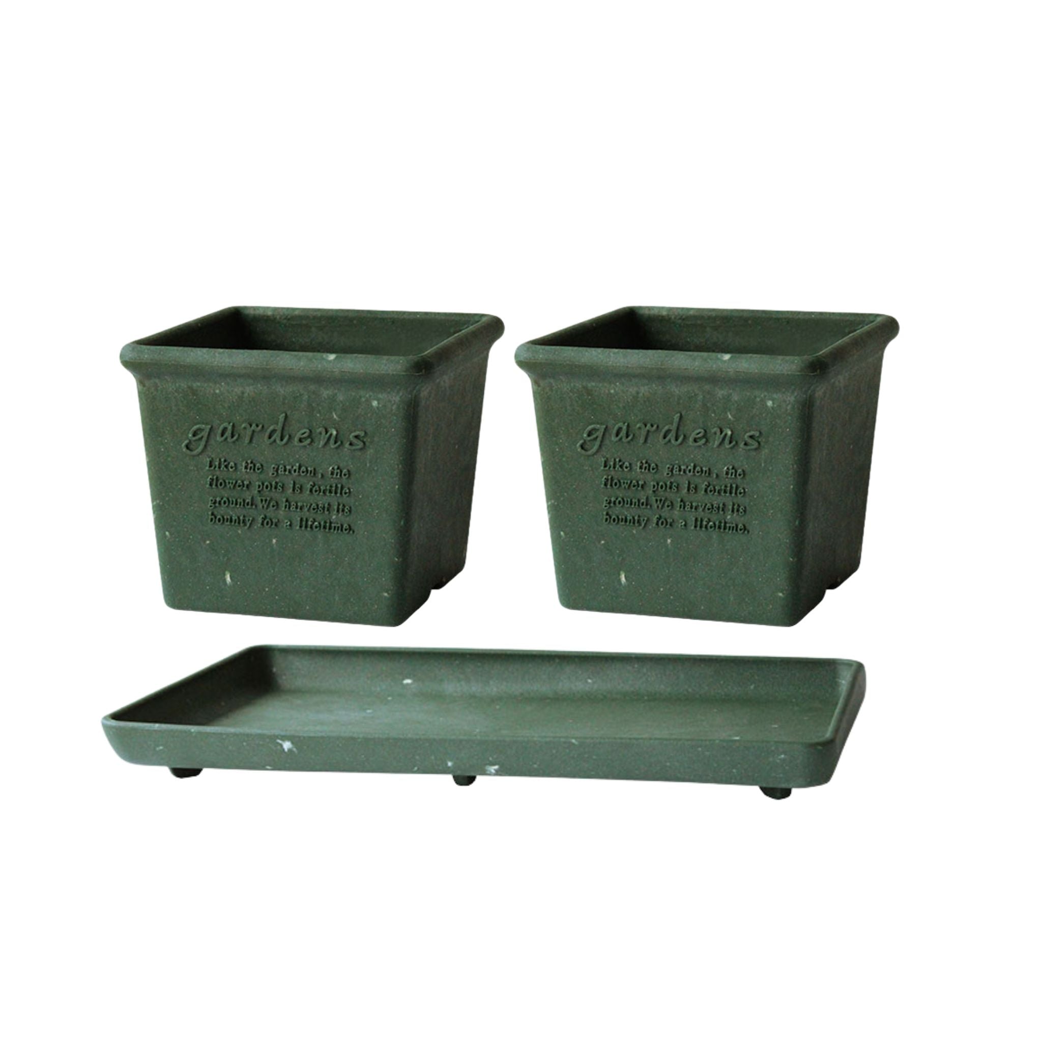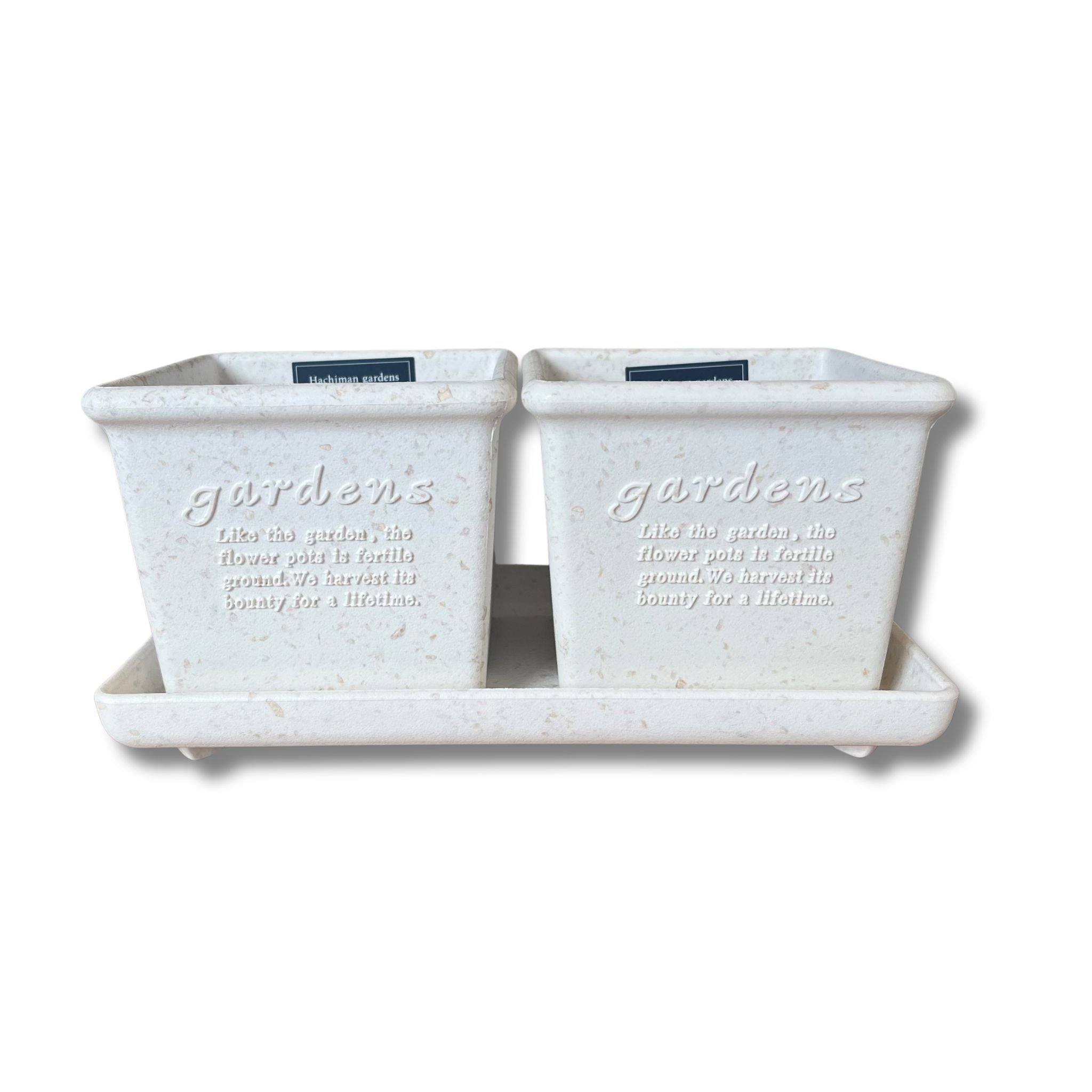 Flotte urtepotteskjulere produceret af 50% polypropylen PP (den gode plast) og 50% overskudstræ/papir. Dette sæt består af 2 firkantede potter med en underskål til.