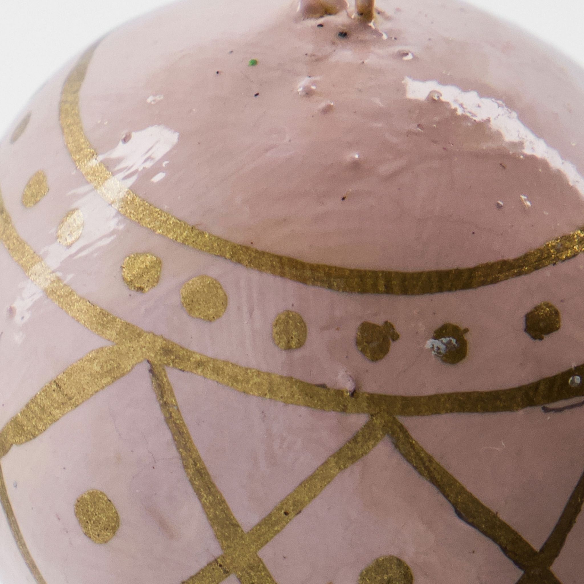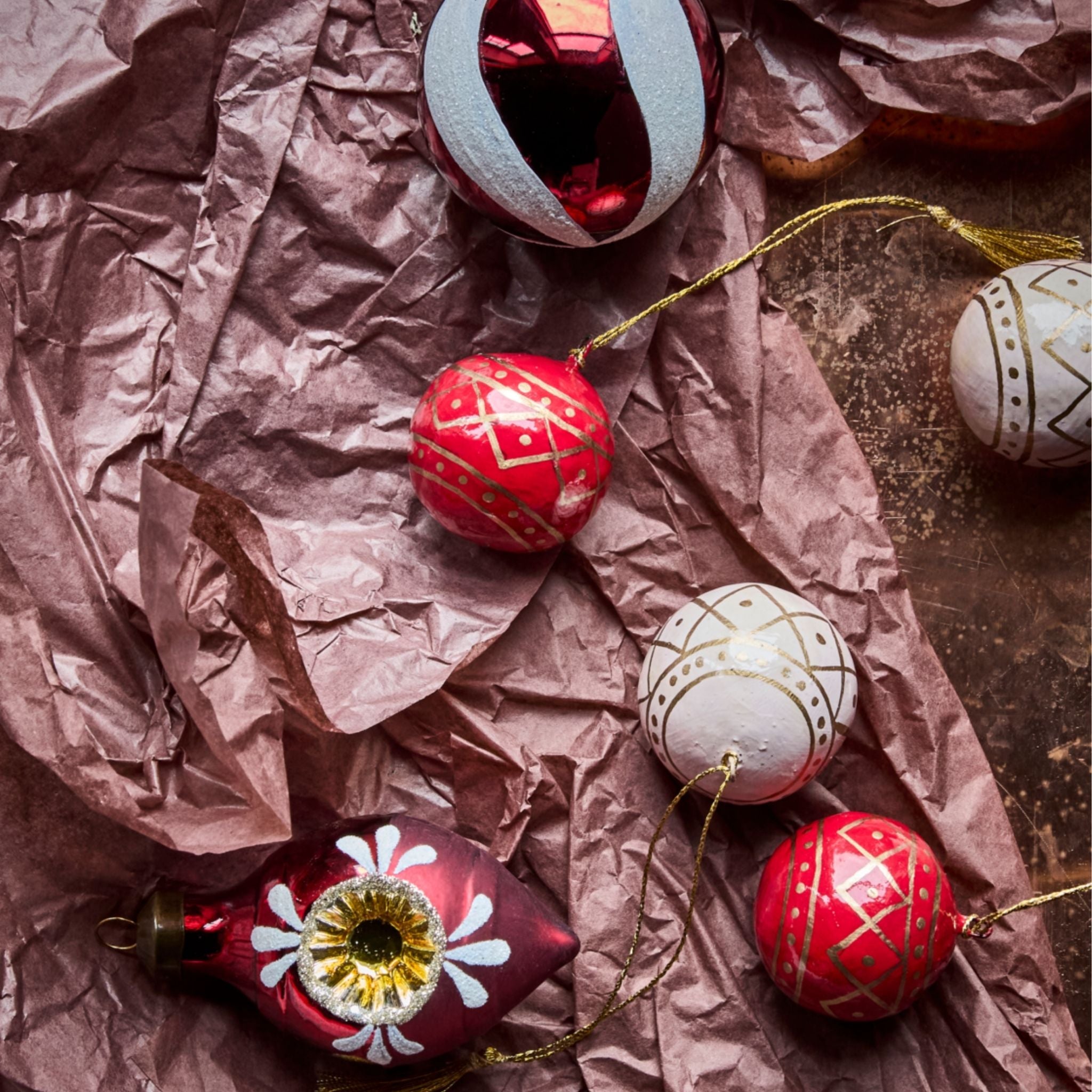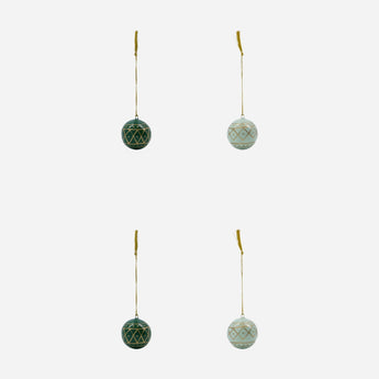 Verleihen Sie Ihrem Zuhause mit diesen handgefertigten Pappmaché-Ornamenten eine einzigartige und festliche Note. Das Set besteht aus vier Ornamenten in zwei verschiedenen Designs in wunderschönen Rot- und Rosatönen oder Dunkel- und Mintgrün. Jedes Ornament ist mit einem handgemalten Goldmuster verziert, das Eleganz und ein exklusives Aussehen verleiht – perfekt für den Weihnachtsbaum, die Tischdekoration oder als kleine Dekoration im Haus.