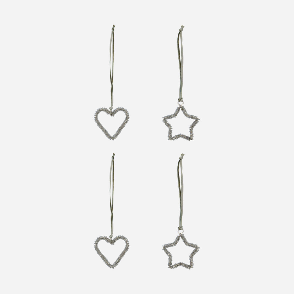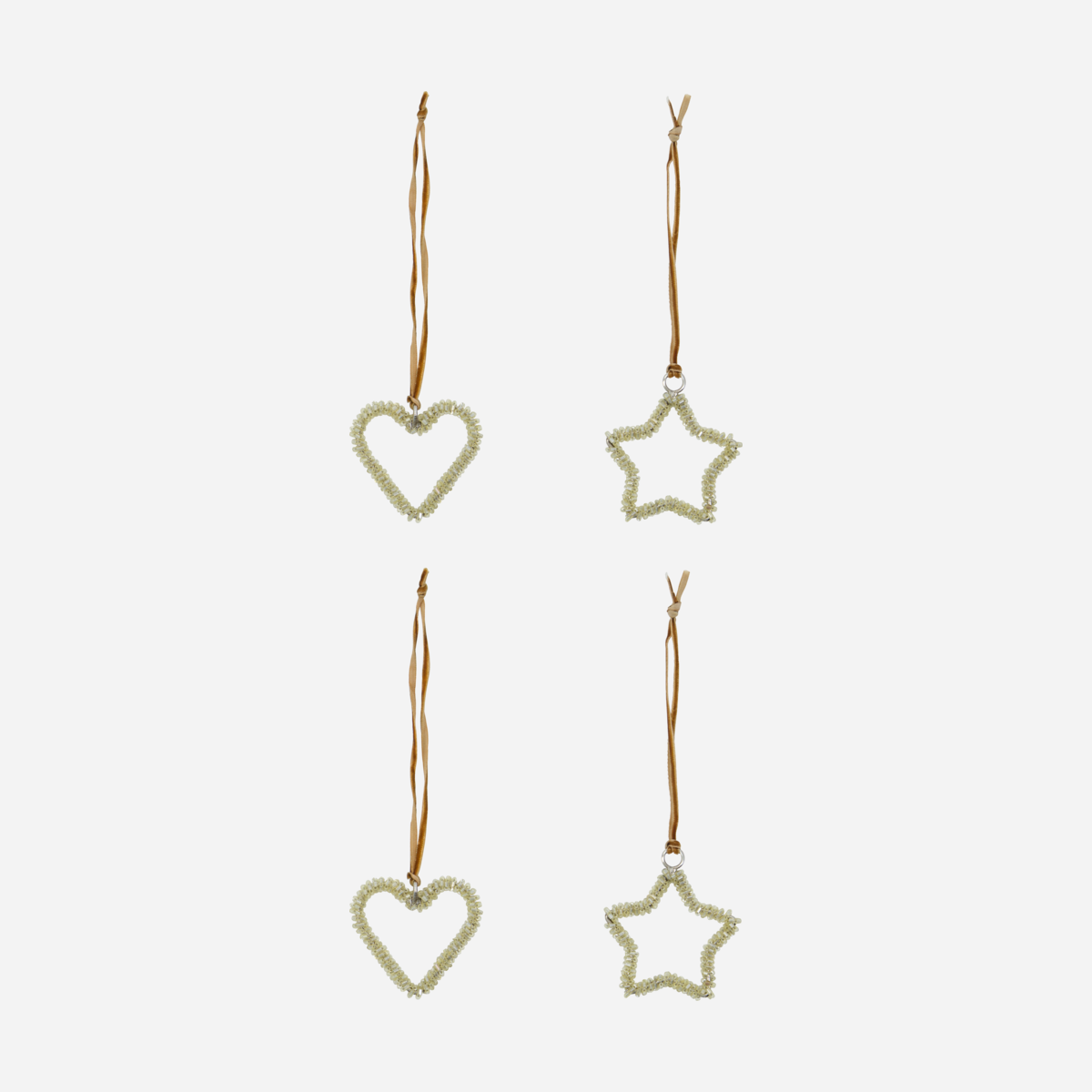 Hvert ornament er lavet af jern, prydet med glitrende perler i sølv eller champagne farve.